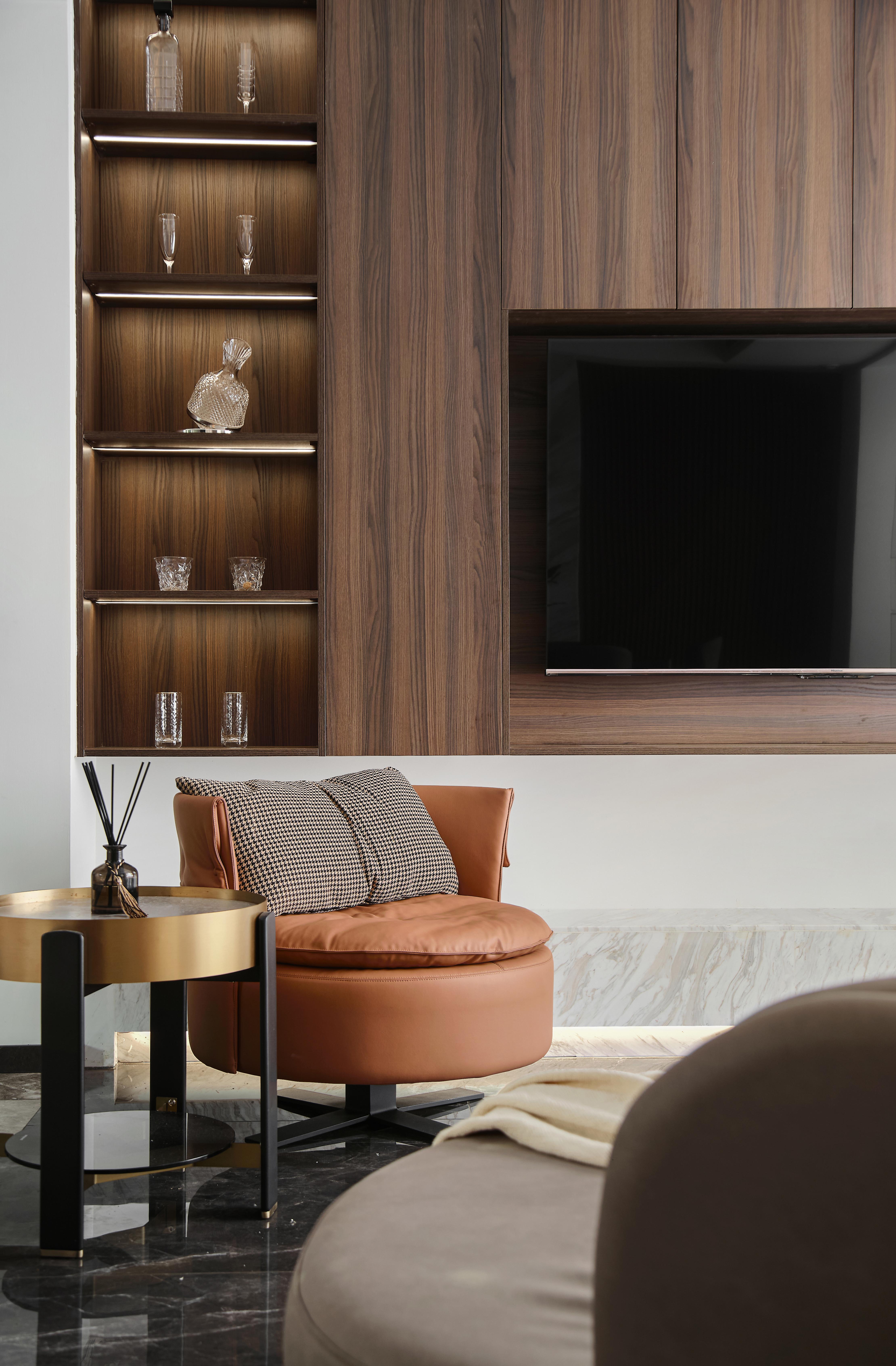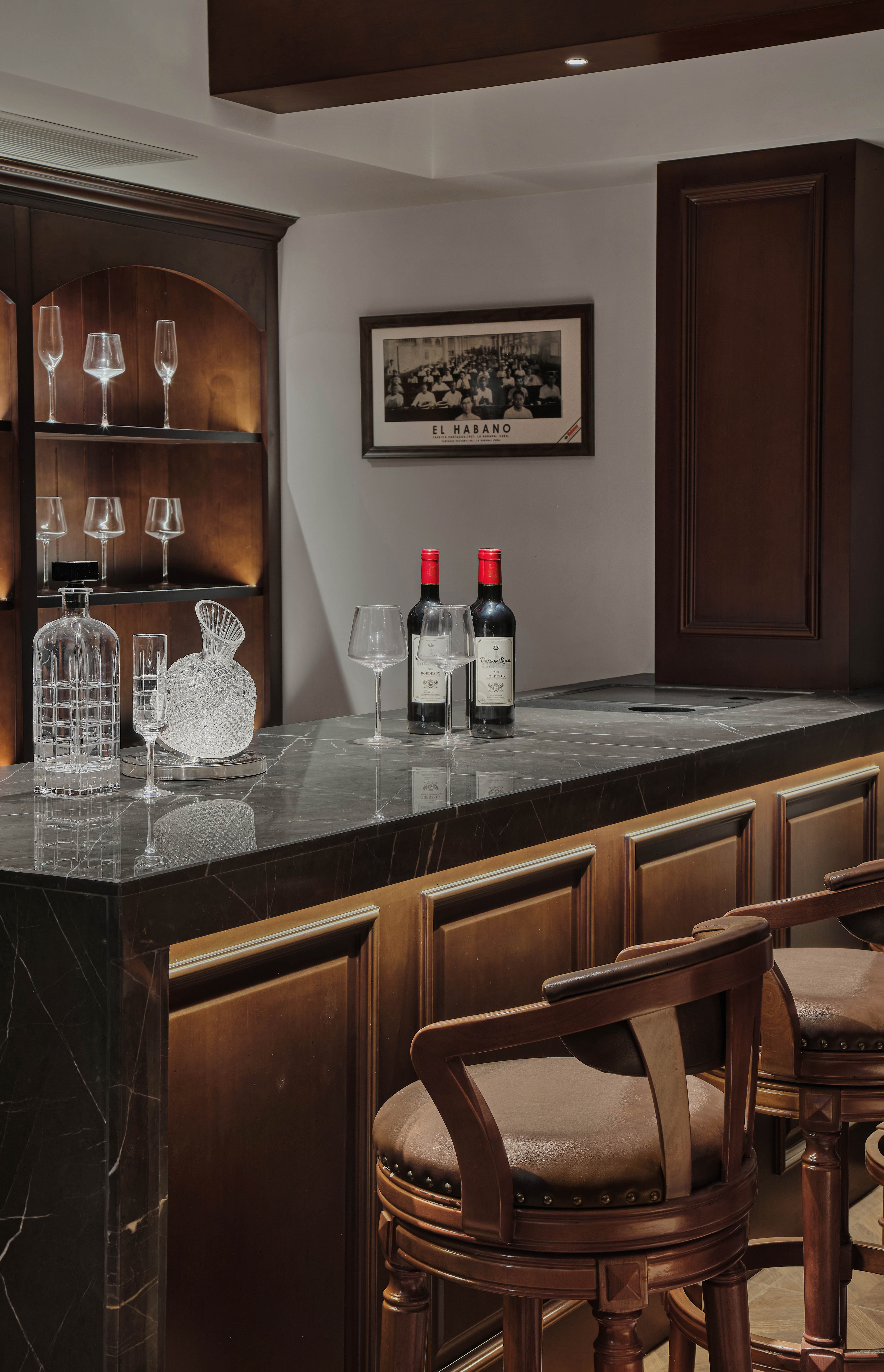步入负二楼入户门,左手边我们安排为入户衣帽间,因为业主的职业,考虑到进家第一件事情就是行李有地方放,同时不用搬到楼上放置。外套等衣物以及未来孩子出行所需的推车等物品都可以放置在这。 进门右手边则是雪茄威士忌吧的位置,因为负二楼有挑高空间,所以有隔层的区域便成为我们考虑的地方。整体风格为美式风格,同时结合现代元素,让复古和现代做一个融合。保加利亚灰的石材透露出深咖色的色调,与红橡色的木色交相呼应,形成业主所喜欢的一种沉稳的威士忌吧氛围。同时石材的质感和吧台直线条与带有美式装饰线条木饰面形成对比,酒柜也用现代方式体现复古拱形酒窖形式。空间的射灯与灯带搭配增加空间氛围,增加业主在威士忌吧体验感。