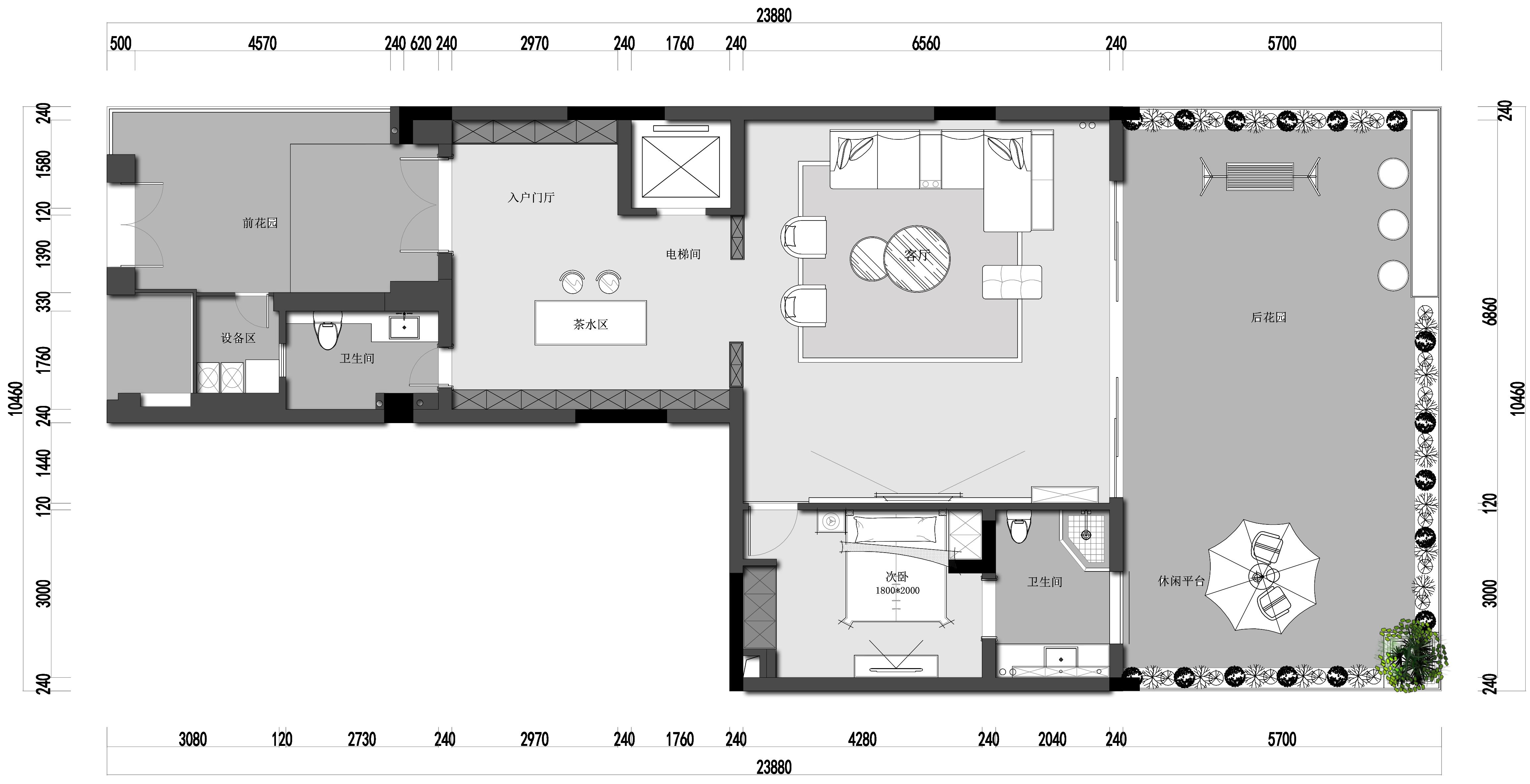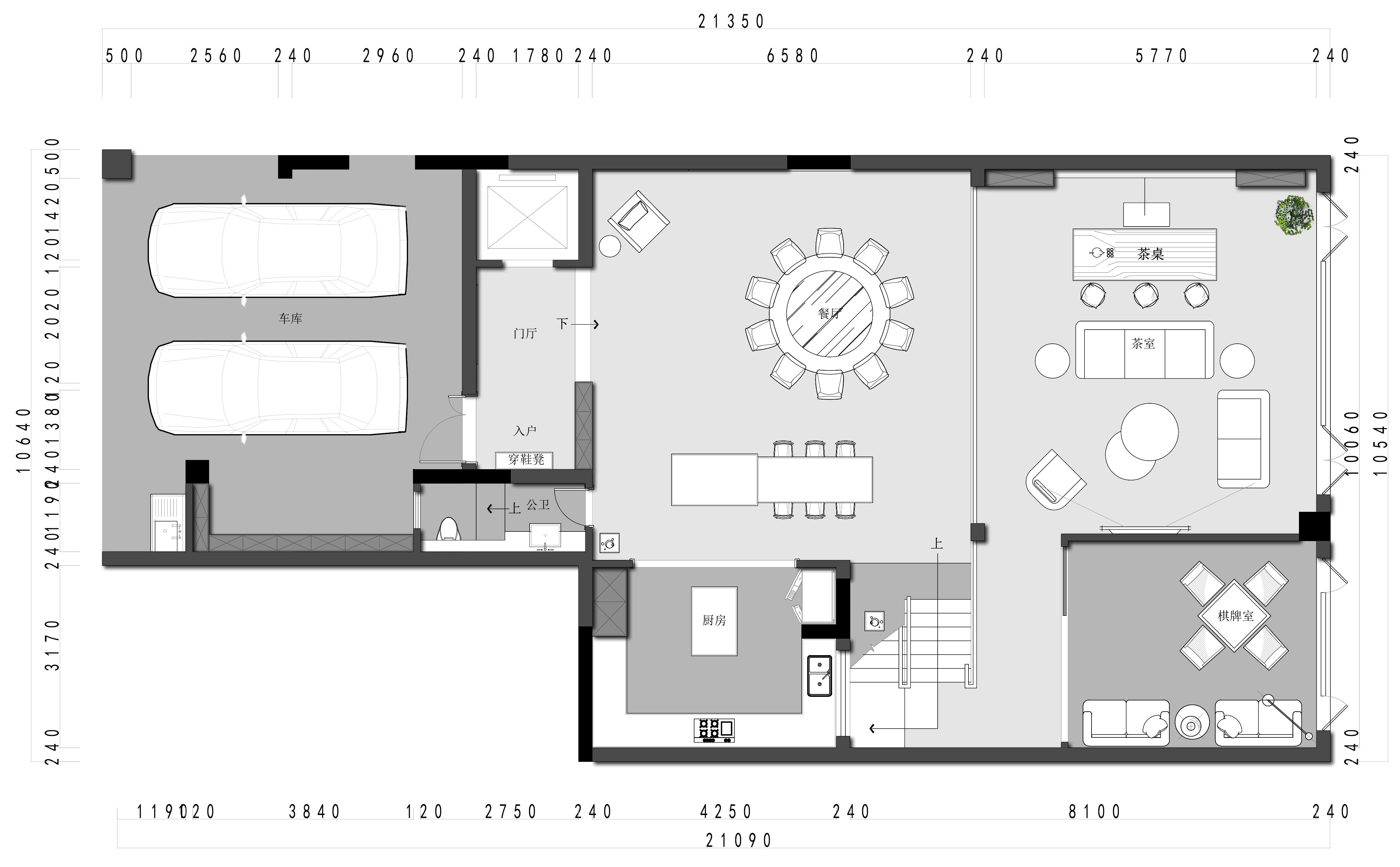 空间布局:本案共3层,总面积为382㎡,负一层为车库入户层,将厨房,餐厅,娱乐,品茗等作为本层主要功能,保留挑空空间,既打造了视觉的层次,又实现了光线的满足;一层为会客区,并有户外超大露台的加持,室外江景一览无遗,打造无敌视野。二层为卧室区,将生活区与休息区合理的分开,保证动静互不影响。