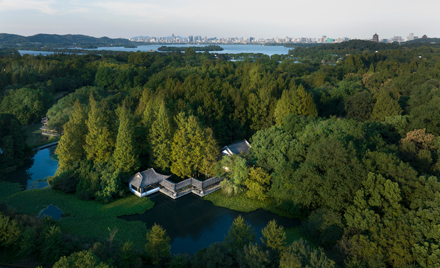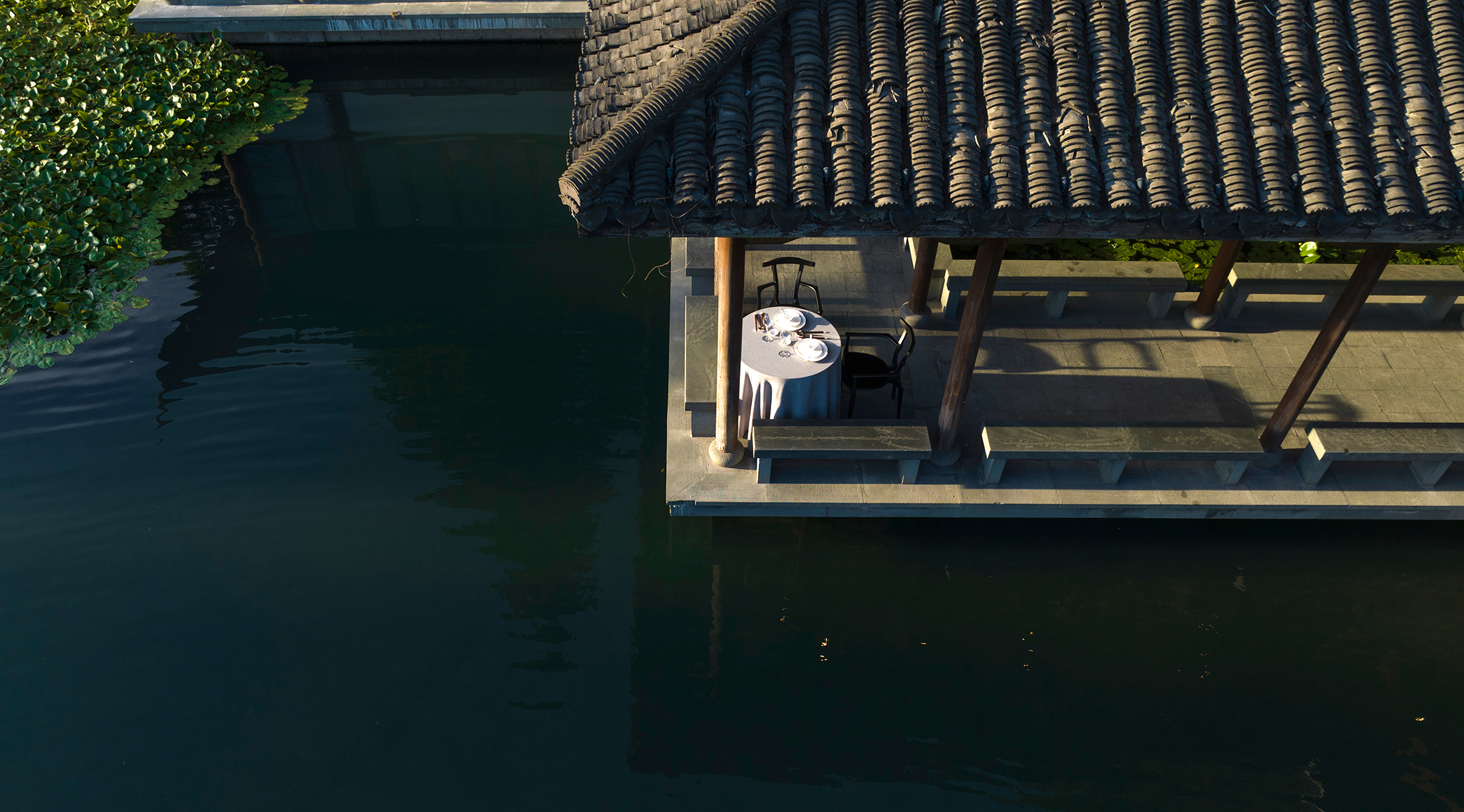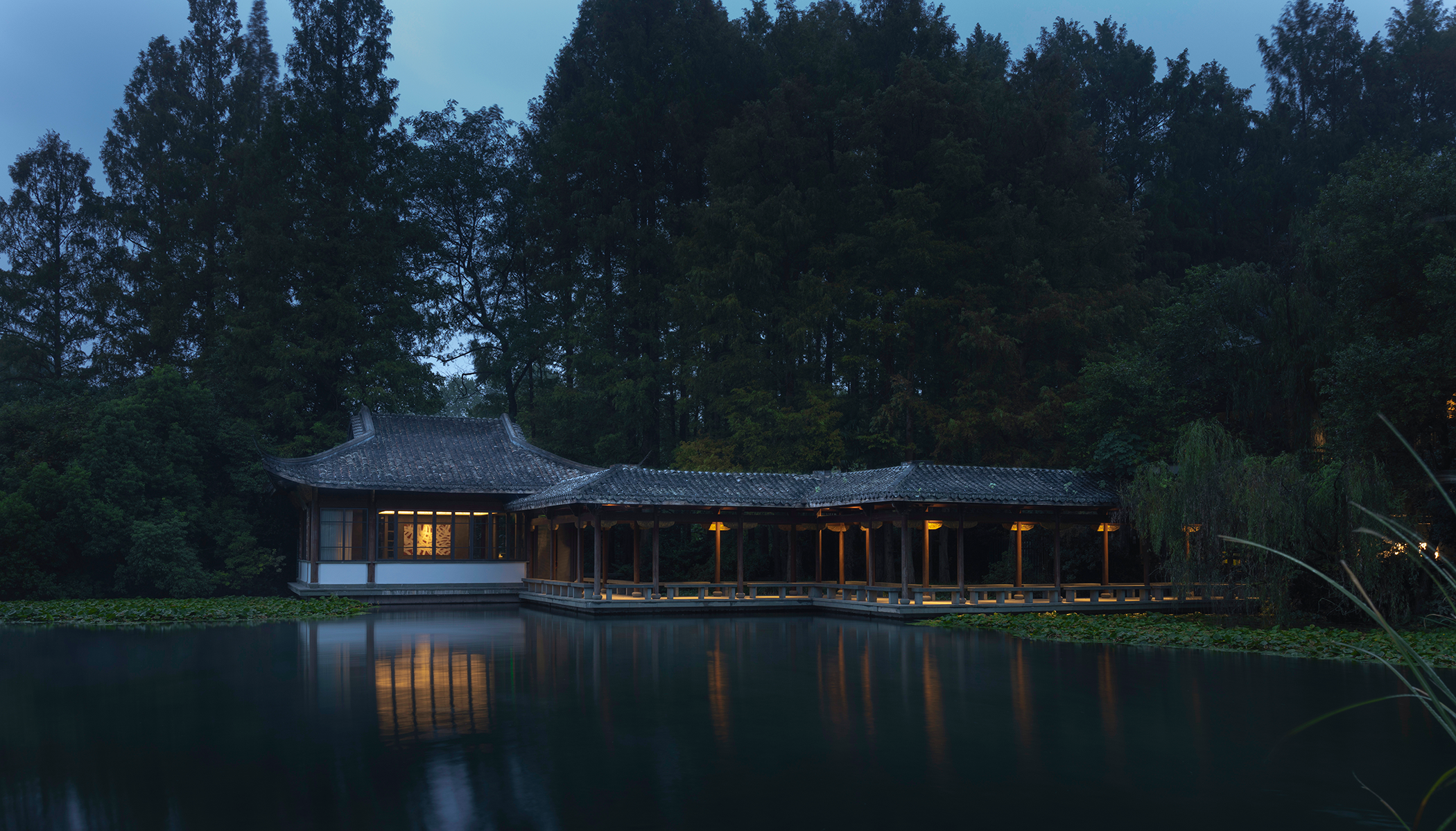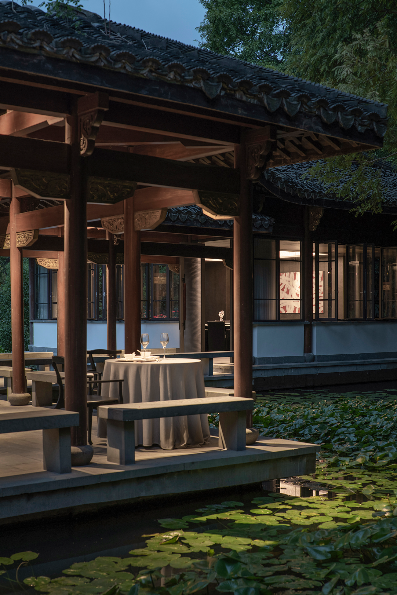 它的名字与其毗邻的“浴鹄湾”同音,后者是一片藏身西湖山水的悠然秘境。清风浮浮、落叶点点,千百年西湖风光不改,故事不断。始建于元代的黄篾楼水轩便是最出挑的景点之一,它静卧于水面,屋脊的起伏简约秀美,如它的经历般曲折悠长。作为策划,建筑,景观,室内及软装的全案设计参与者,在项目初期便希望为业主打造一个集成的美学空间。“它所在的位置非常私密,鸟雀纷飞、蜻蜓点水、密林环绕,又有历史建筑的附加值……形成我们与业主的一致共鸣,将此处打造为旗下同系列餐厅的品质旗舰店。”