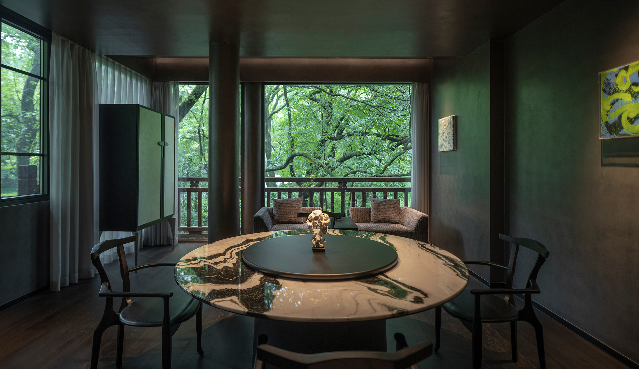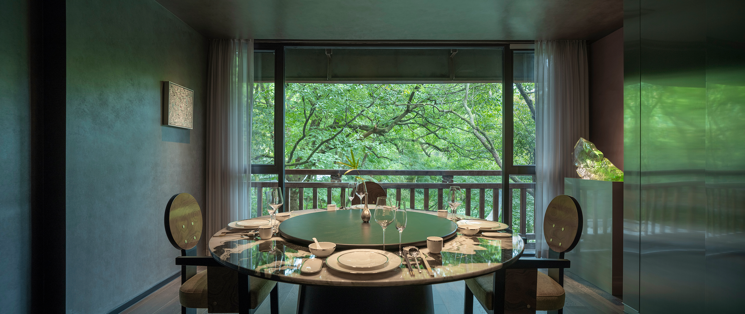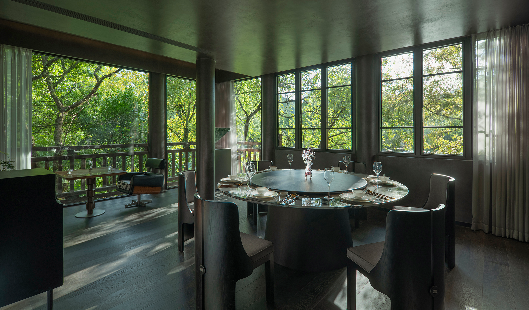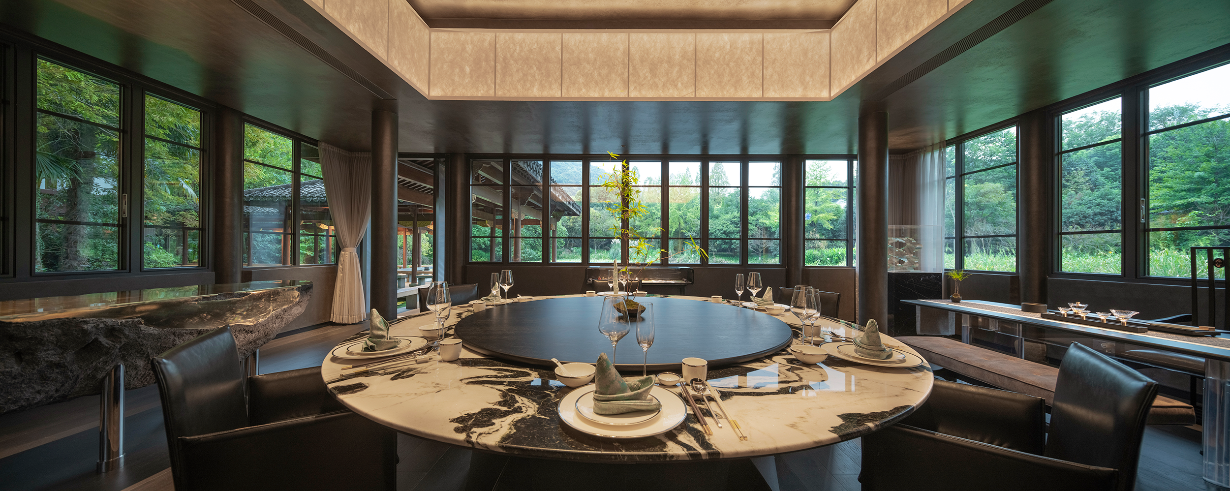 空间布局:设计师以宋为坐标,力图还原一种精致典雅的美。墨色笼罩着一楼、二楼的所有室内区域,开槽的片墙斜置于空间内,框景、漏景将“曲径通幽”的雅意从连廊延续至大堂,偶有亮色出现——那是窗外的风景,或是艺术家依据窗外景致的在场创作。水上包厢,则通透开阔,窗外的山水湖光尽收眼底。备餐台则是雕塑艺术家采用细沙磨石创作的“一叶扁舟”,形成空间的平衡支点,彰显古雅之韵和当代艺术的交融。