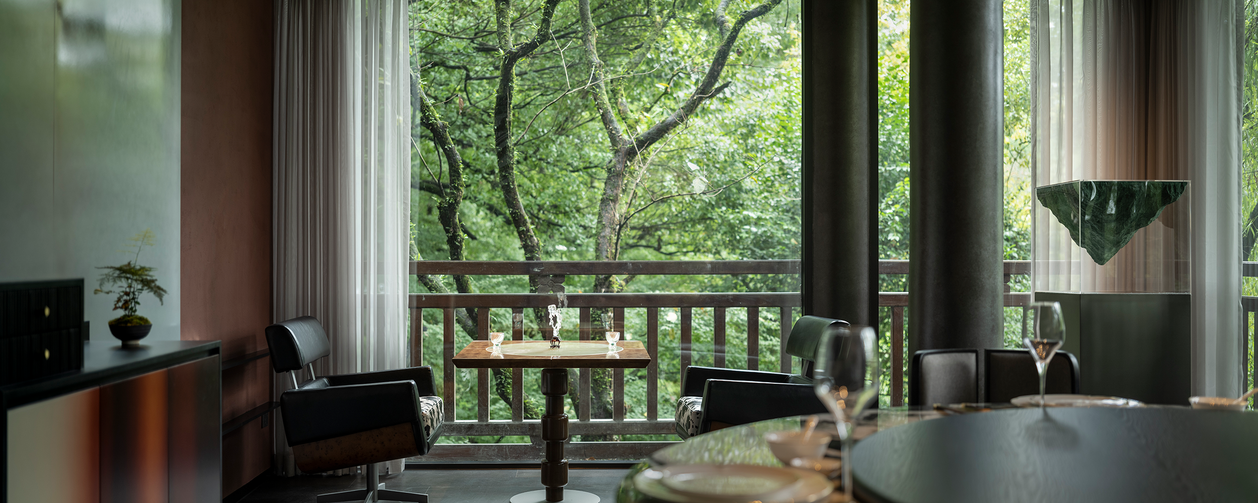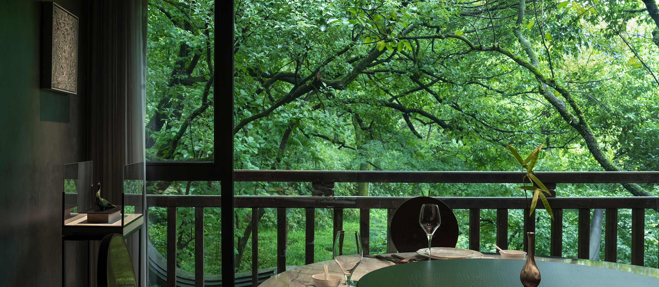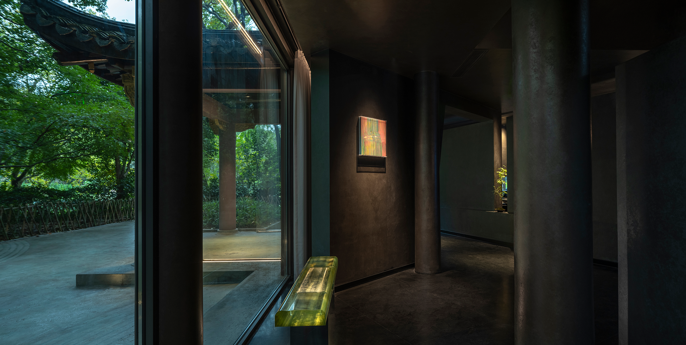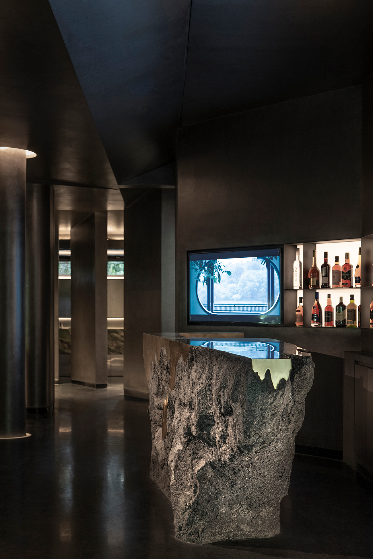 空间布局:设计师以宋为坐标,力图还原一种精致典雅的美。墨色笼罩着一楼、二楼的所有室内区域,开槽的片墙斜置于空间内,框景、漏景将“曲径通幽”的雅意从连廊延续至大堂,偶有亮色出现——那是窗外的风景,或是艺术家依据窗外景致的在场创作。水上包厢,则通透开阔,窗外的山水湖光尽收眼底。备餐台则是雕塑艺术家采用细沙磨石创作的“一叶扁舟”,形成空间的平衡支点,彰显古雅之韵和当代艺术的交融。