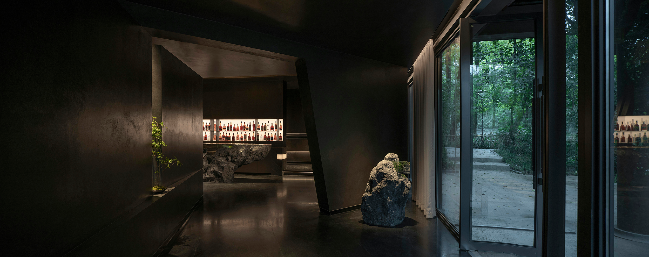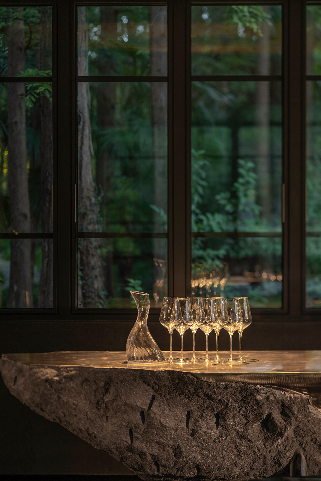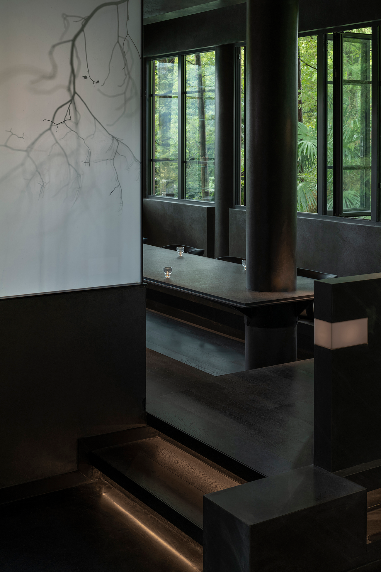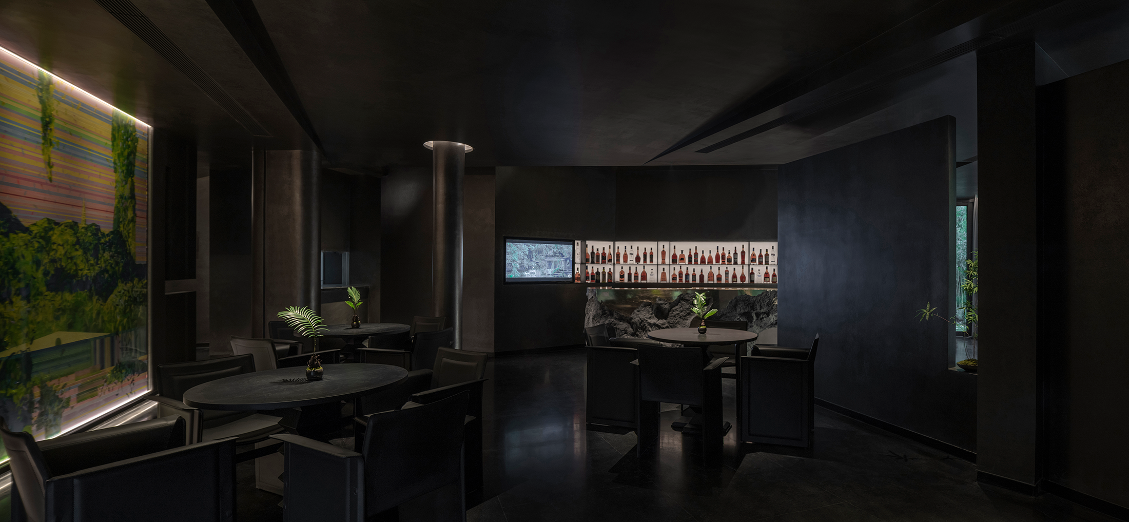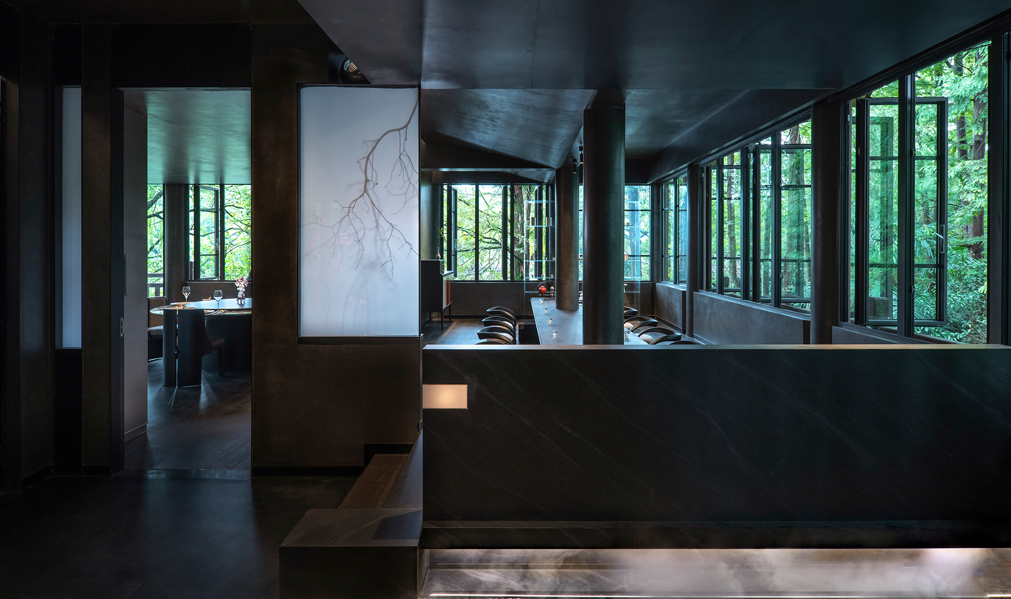 空间布局:设计师以宋为坐标,力图还原一种精致典雅的美。墨色笼罩着一楼、二楼的所有室内区域,开槽的片墙斜置于空间内,框景、漏景将“曲径通幽”的雅意从连廊延续至大堂,偶有亮色出现——那是窗外的风景,或是艺术家依据窗外景致的在场创作。水上包厢,则通透开阔,窗外的山水湖光尽收眼底。备餐台则是雕塑艺术家采用细沙磨石创作的“一叶扁舟”,形成空间的平衡支点,彰显古雅之韵和当代艺术的交融。