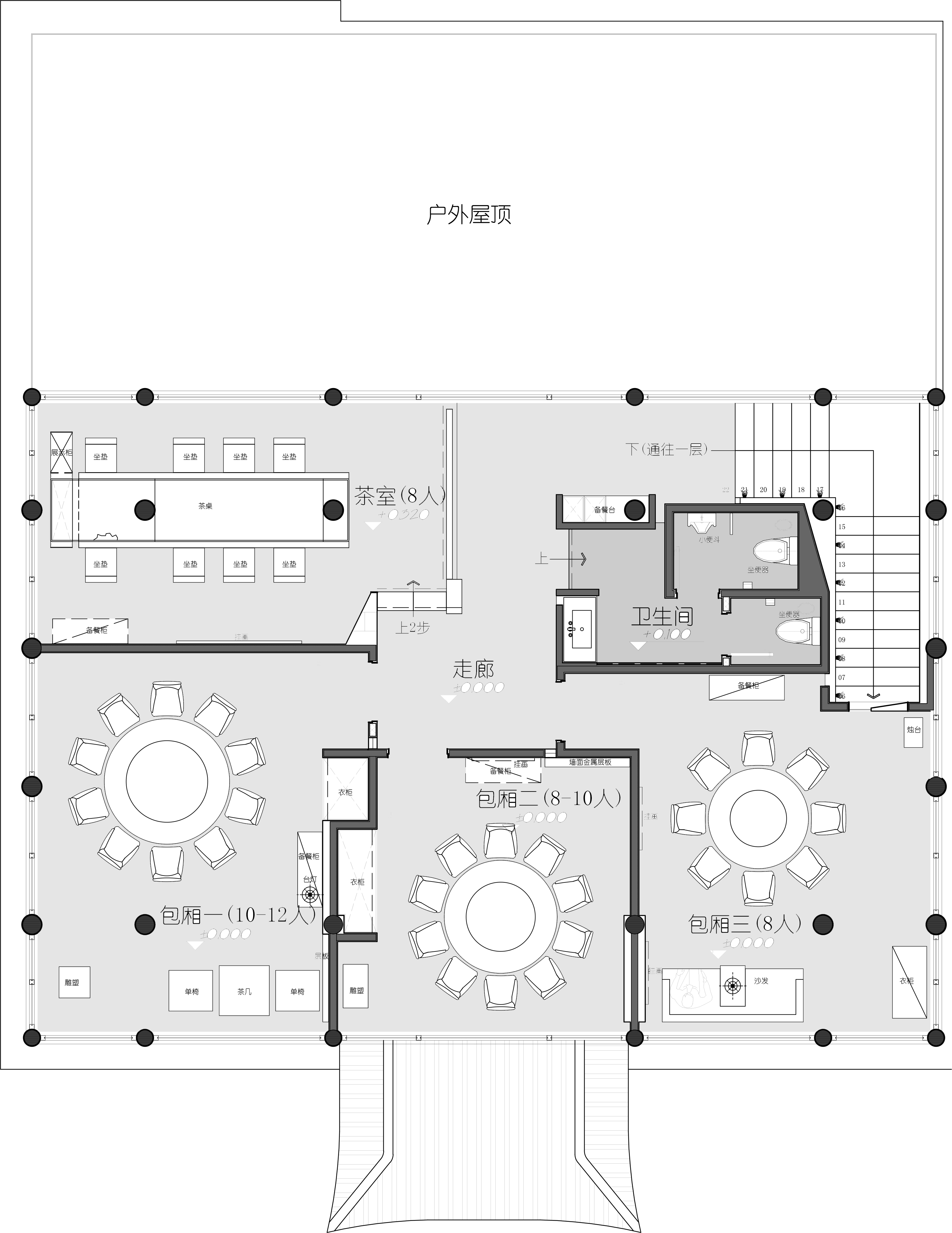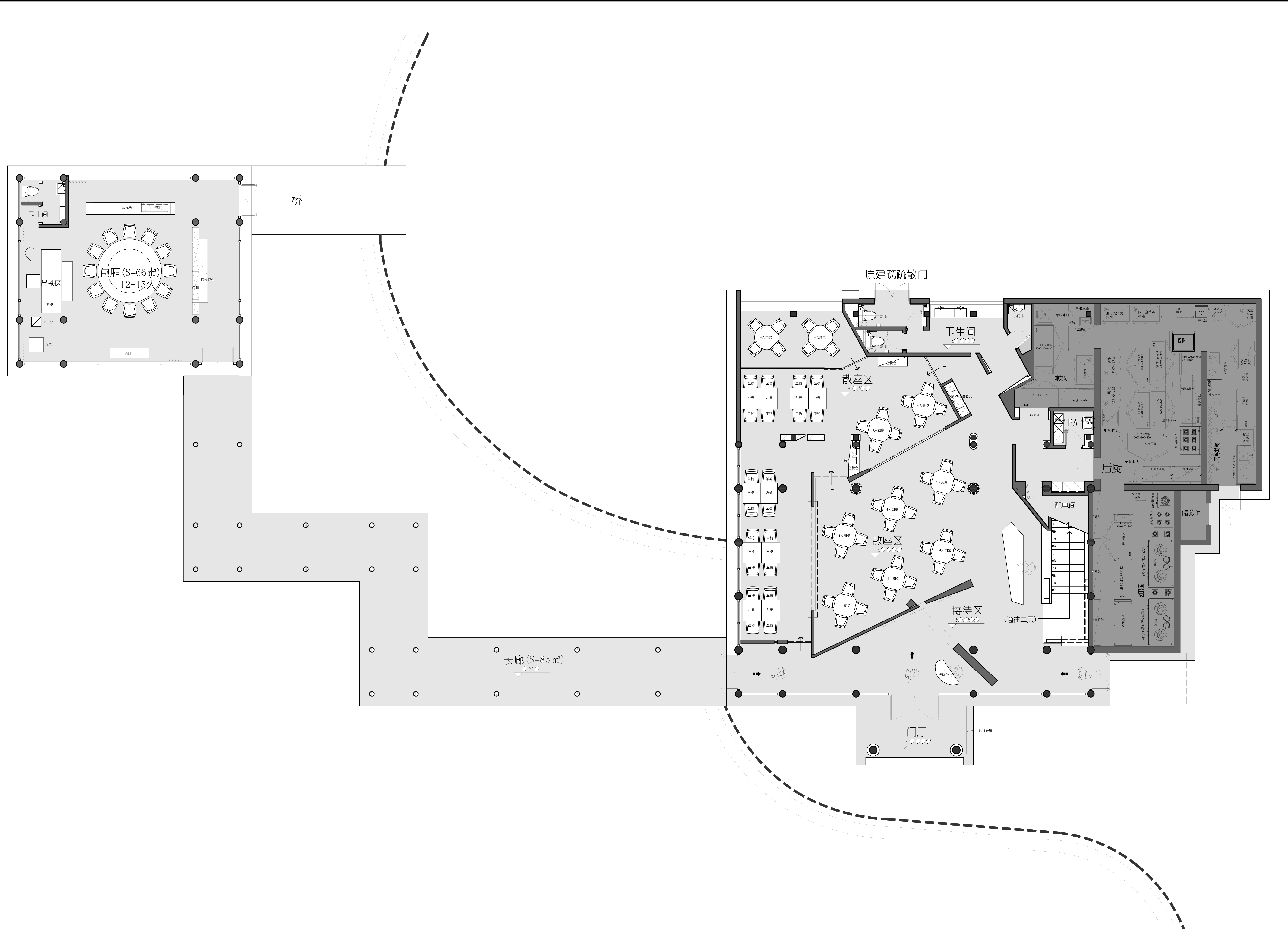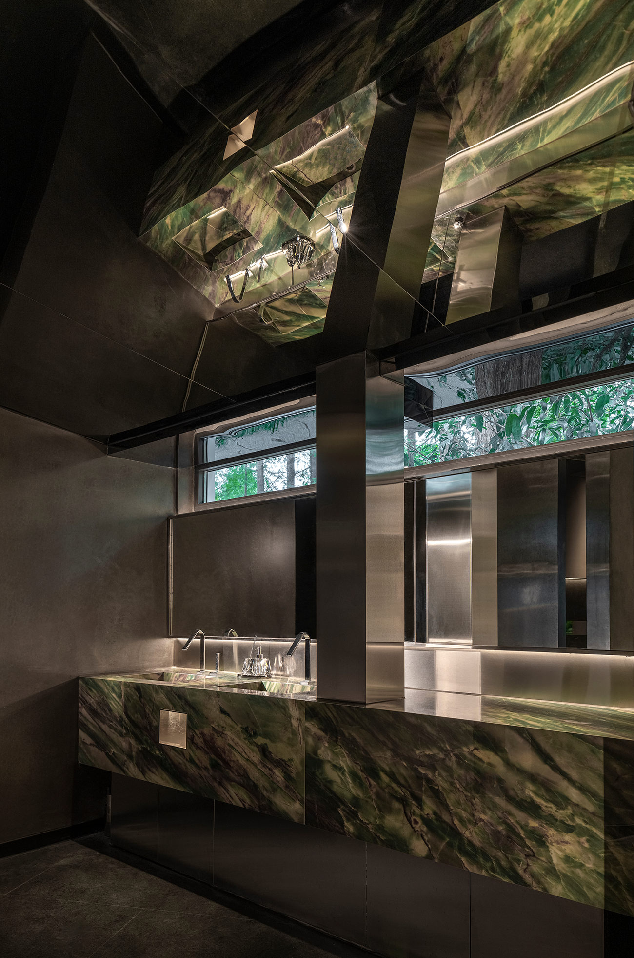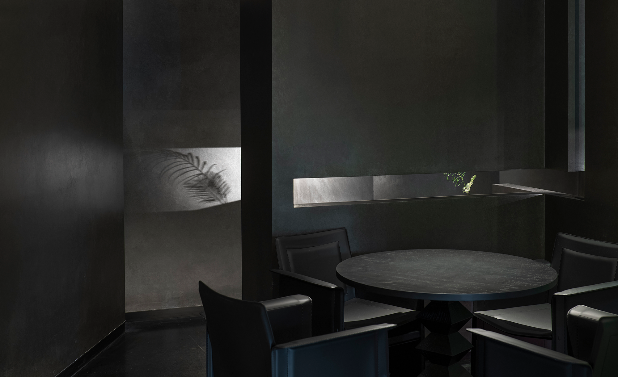 空间布局:设计师以宋为坐标,力图还原一种精致典雅的美。墨色笼罩着一楼、二楼的所有室内区域,开槽的片墙斜置于空间内,框景、漏景将“曲径通幽”的雅意从连廊延续至大堂,偶有亮色出现——那是窗外的风景,或是艺术家依据窗外景致的在场创作。水上包厢,则通透开阔,窗外的山水湖光尽收眼底。备餐台则是雕塑艺术家采用细沙磨石创作的“一叶扁舟”,形成空间的平衡支点,彰显古雅之韵和当代艺术的交融。