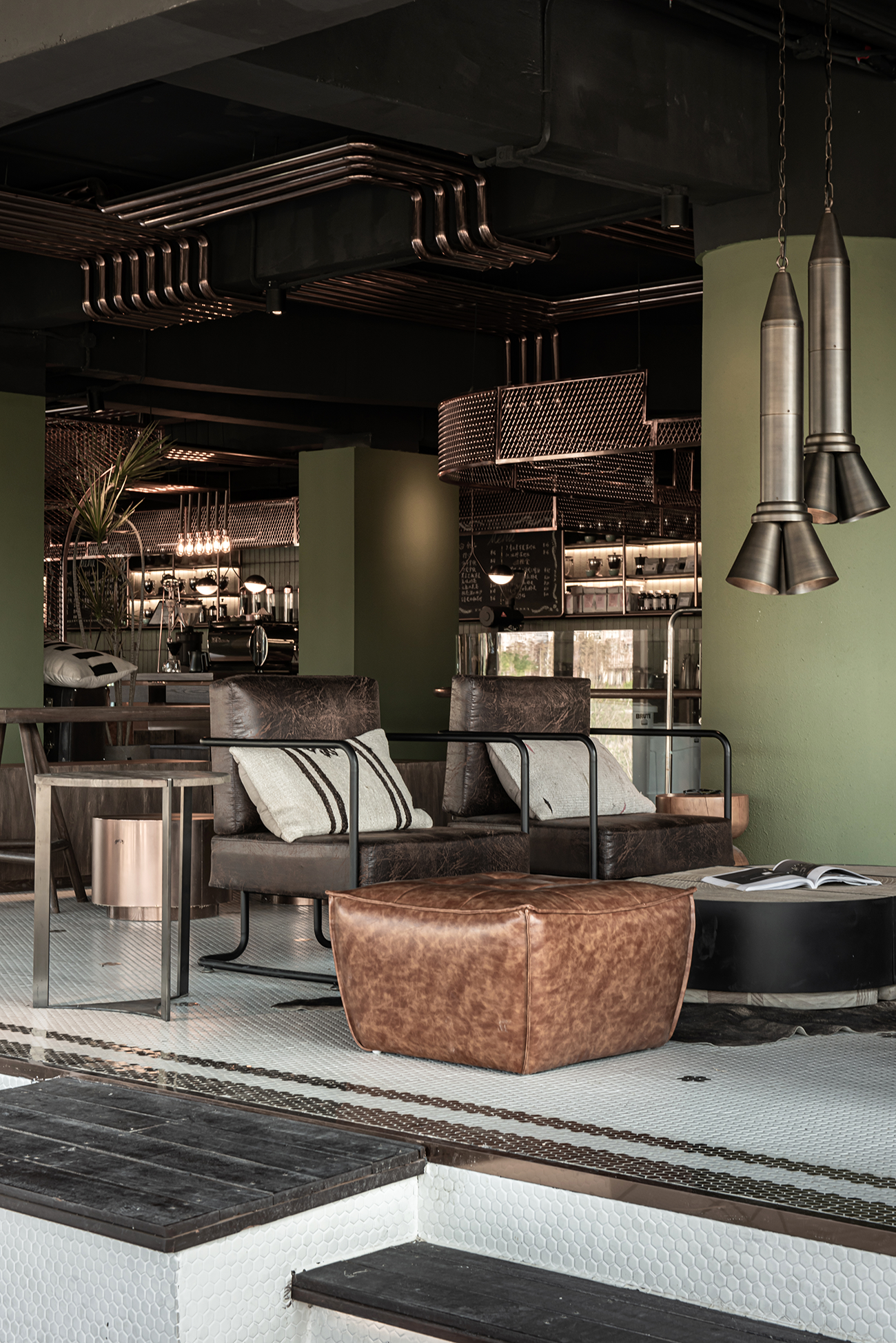 设计选材:空间中用了大量的金属,圆管在顶上交织穿梭,格栅穿插其中,连白色的地面都点缀着金属马赛克,暖黄的灯光照射下,泛着光泽,而墨绿色的墙面涂料、仿古砖、木作、暖色做旧皮革则中和了金属带来的冷感,点缀在空间中的黑板画、从各地淘来的旧皮箱、打字机等老物件,无不营造着一种复古工业氛围。
