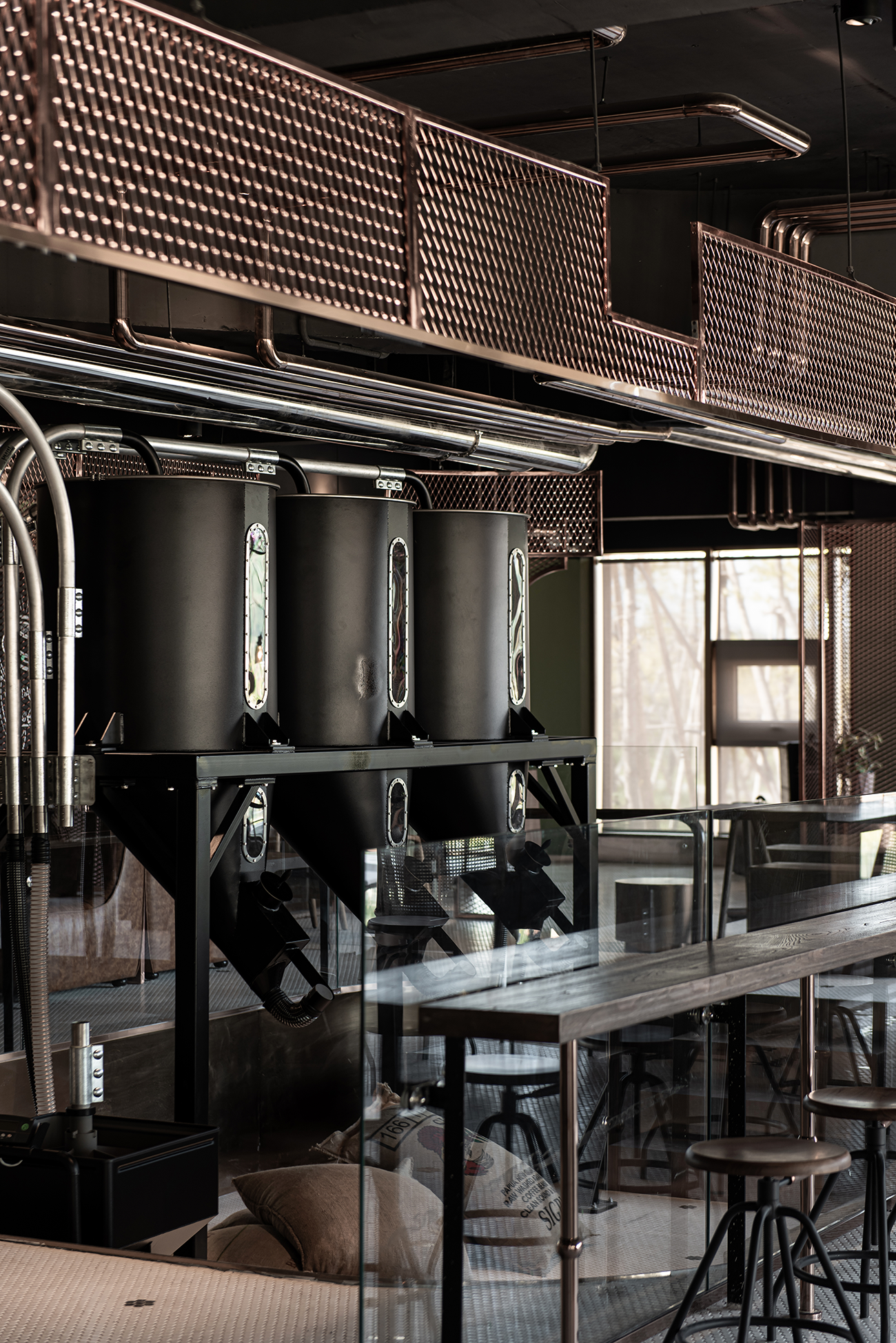 空间布局:咖啡豆的香气吸引你走进这个咖啡复合空间。整个空间划分捧着咖啡,消费者可根据自己的喜好选择多种休闲方式,窝在舒适的靠墙沙发与客交谈,或坐在靠窗吧台观赏窗外花坡。了操作区、休闲区、设备区和展陈区。长达数米的操作台配备了多种咖啡机满足各类咖啡的制作需求。空间的中心放置着进口的probat烘焙机及生豆仓,客人可以隔着安全围挡观看烘焙师操作从生豆到烘焙加工的整条生产线。而展陈区分布在动线中,消费者可以随意选购周边产品,给消费者传达品牌理念及生活方式。