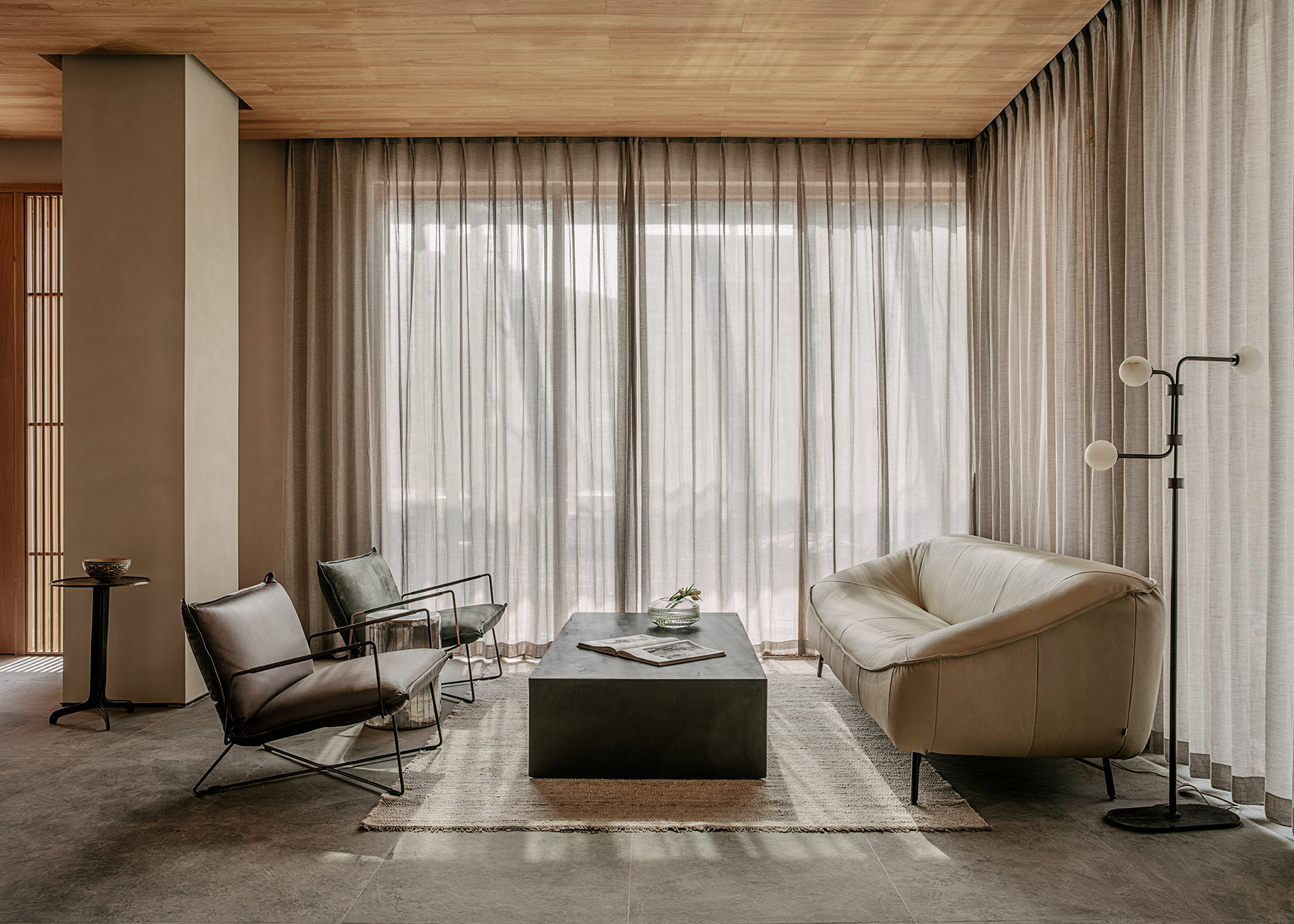 空间布局:由入口门厅步入1层空间,以中心区域的静水景观将空间一分为二,楼梯隐匿在其后方,兼顾隐私性的同时,也为空间增添了更多的艺术氛围,空间的划分因此更加简明。具备接待、休闲、用餐等功能。宅子的一部分空间,作为民宿对外开放,另一部分,属于民宿主人的私有空间。既是家,亦是开放共享的自由空间。