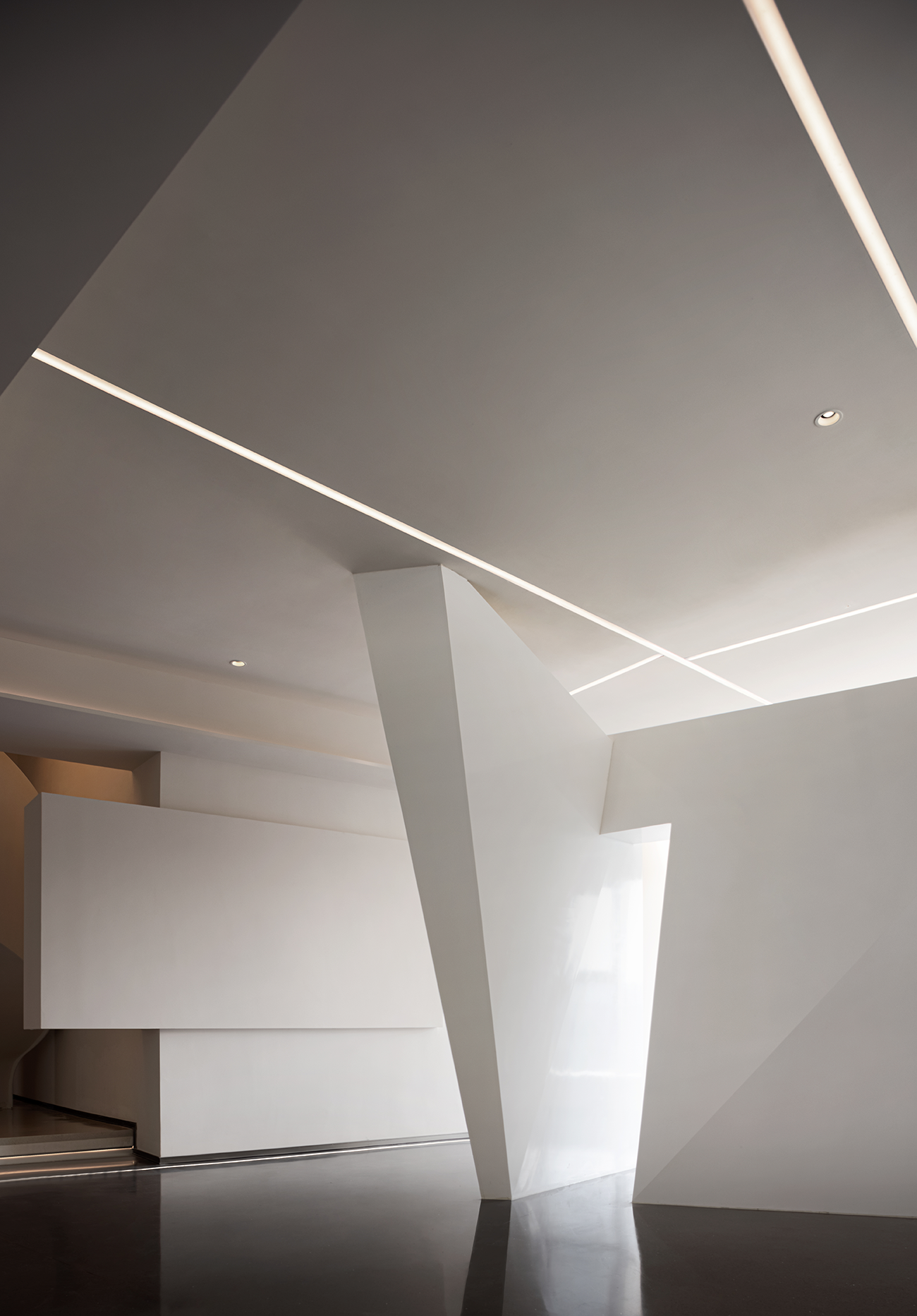 在此次对空间的构思中,设计师利用到了很多结构上的设计手法,令空间丰满而具有现代感。同时,特殊的结构层次设计中也暗含了慢珊瑚的设计理念——“突破边界和固有空间”。以极简为基调,大面积的开放空间,让建筑与基地更融合,轻盈而富有诗意,更具艺术感染力。空间、光线与材料,就是设计的全部。如同白色般的设计语言经过设计师的细心雕琢,让空间仿佛有了生命,以沉默者形象伫立,于天地间安静地泛着纯粹的光。 -
