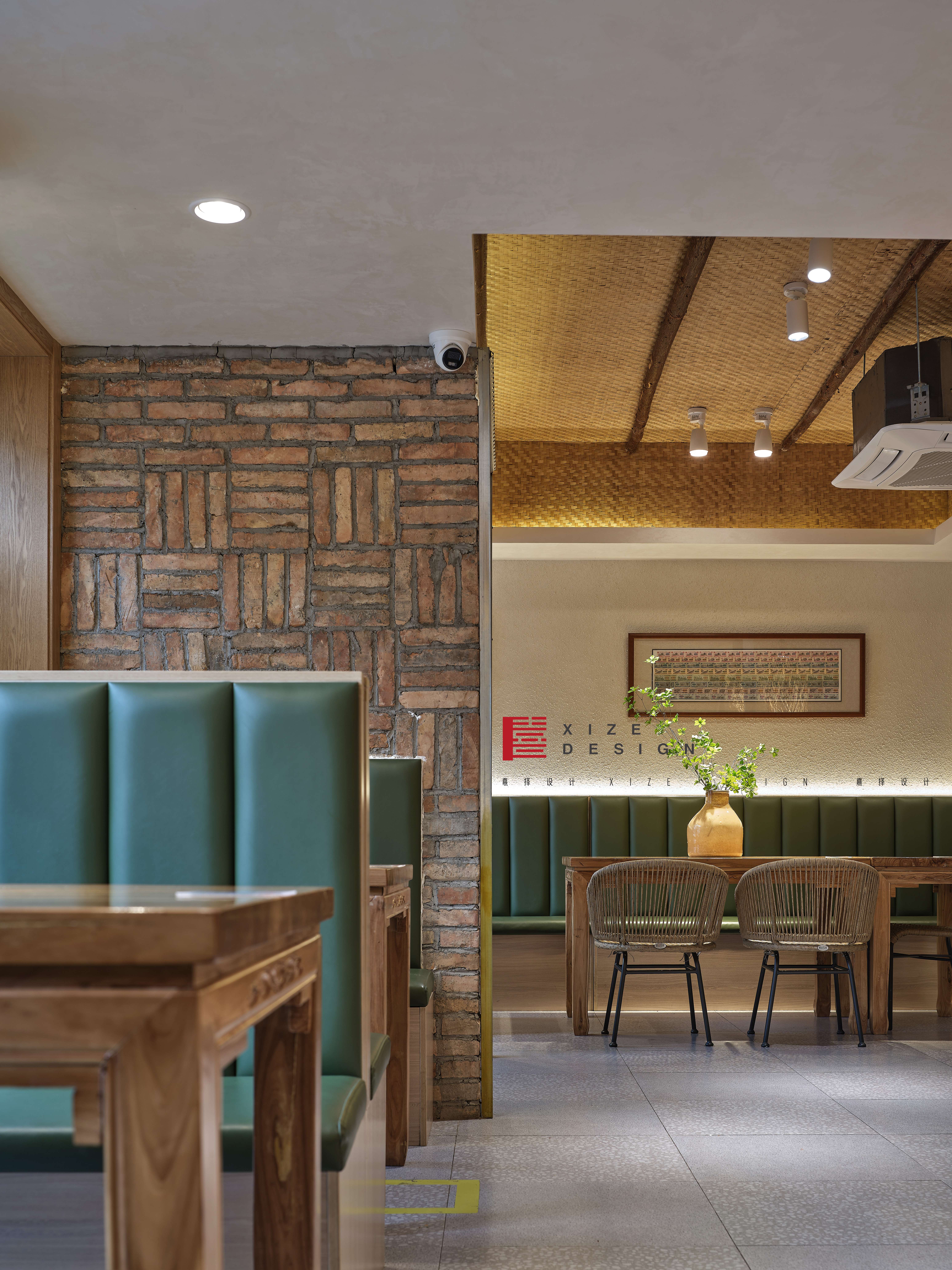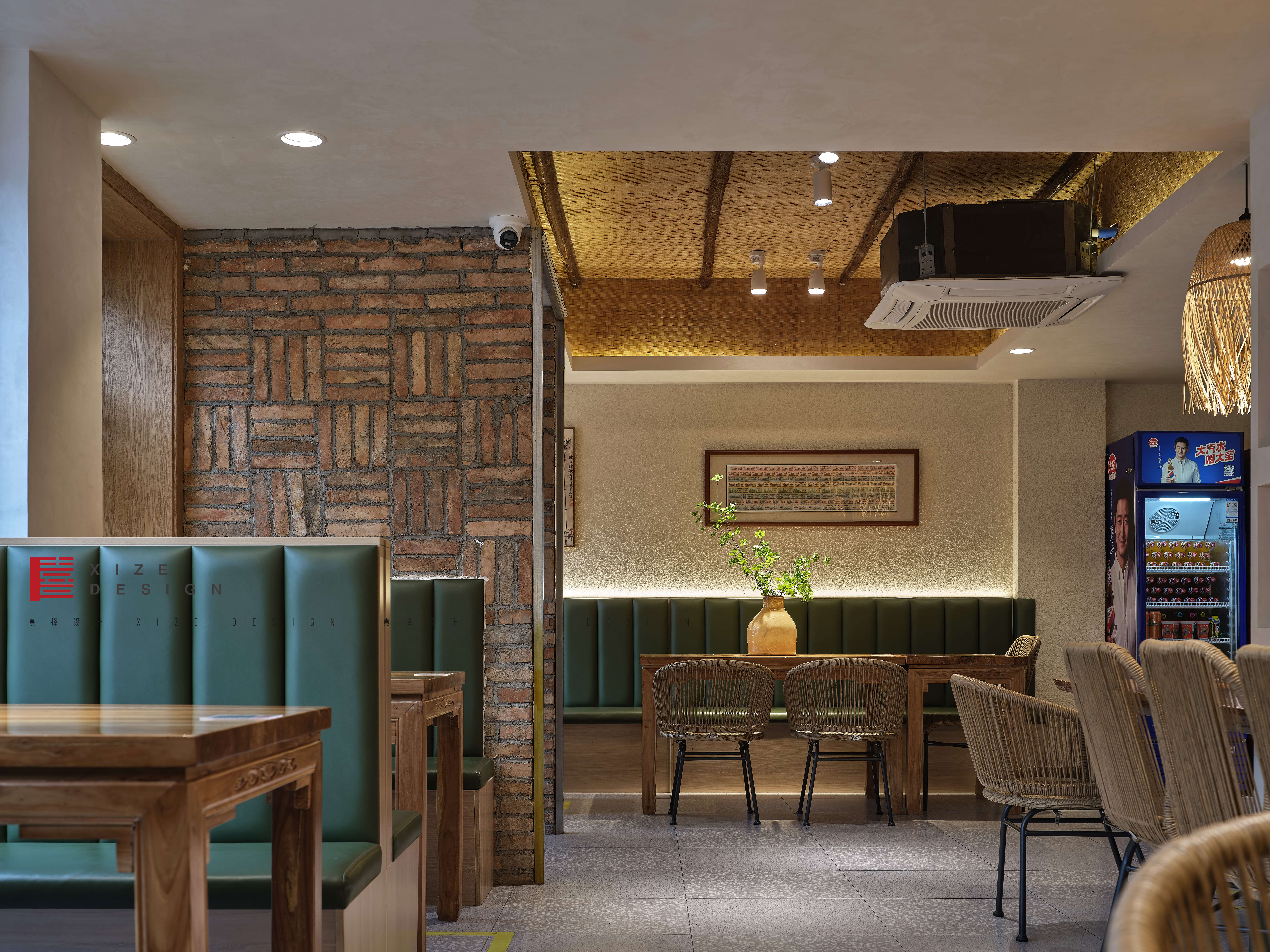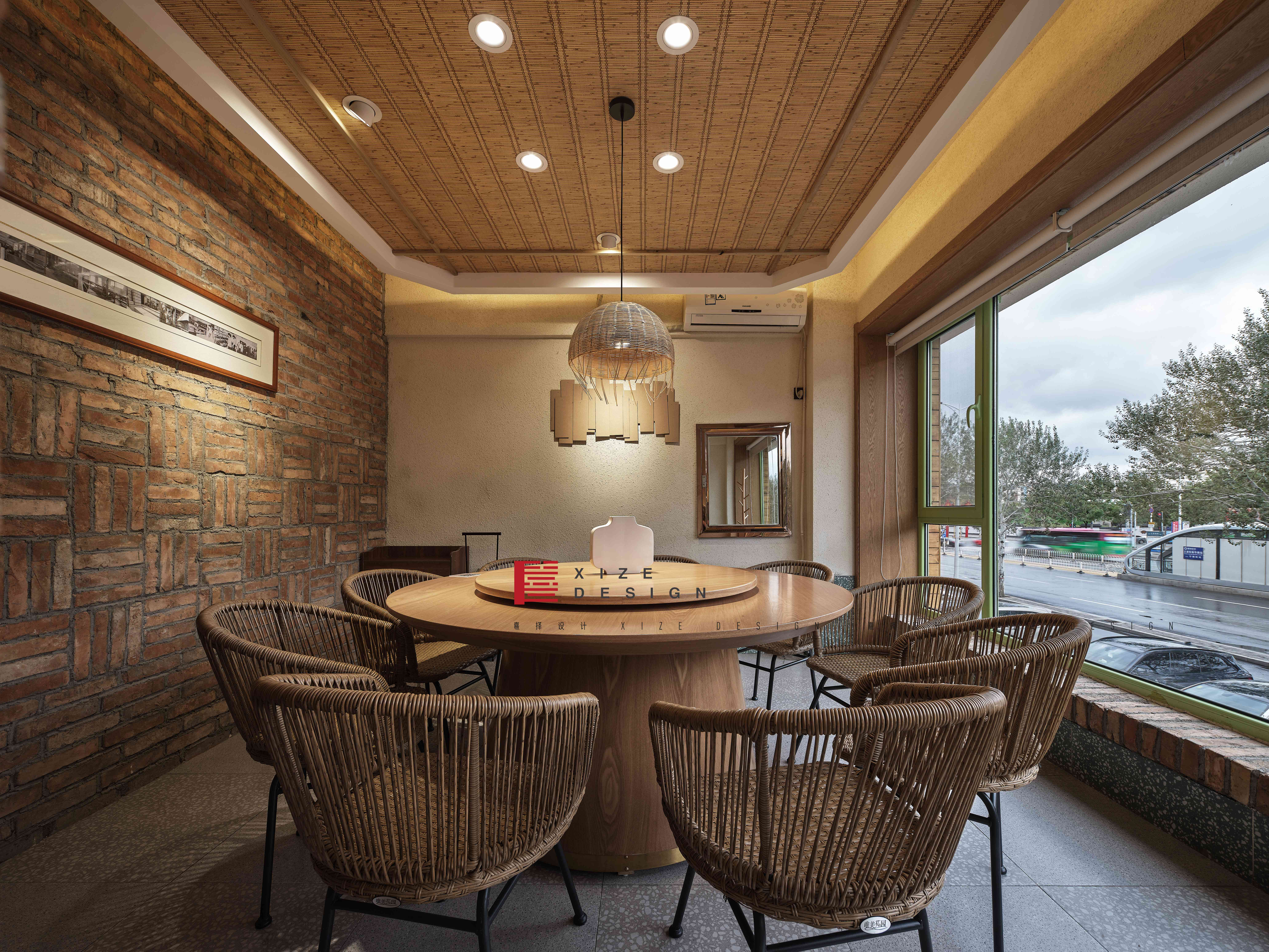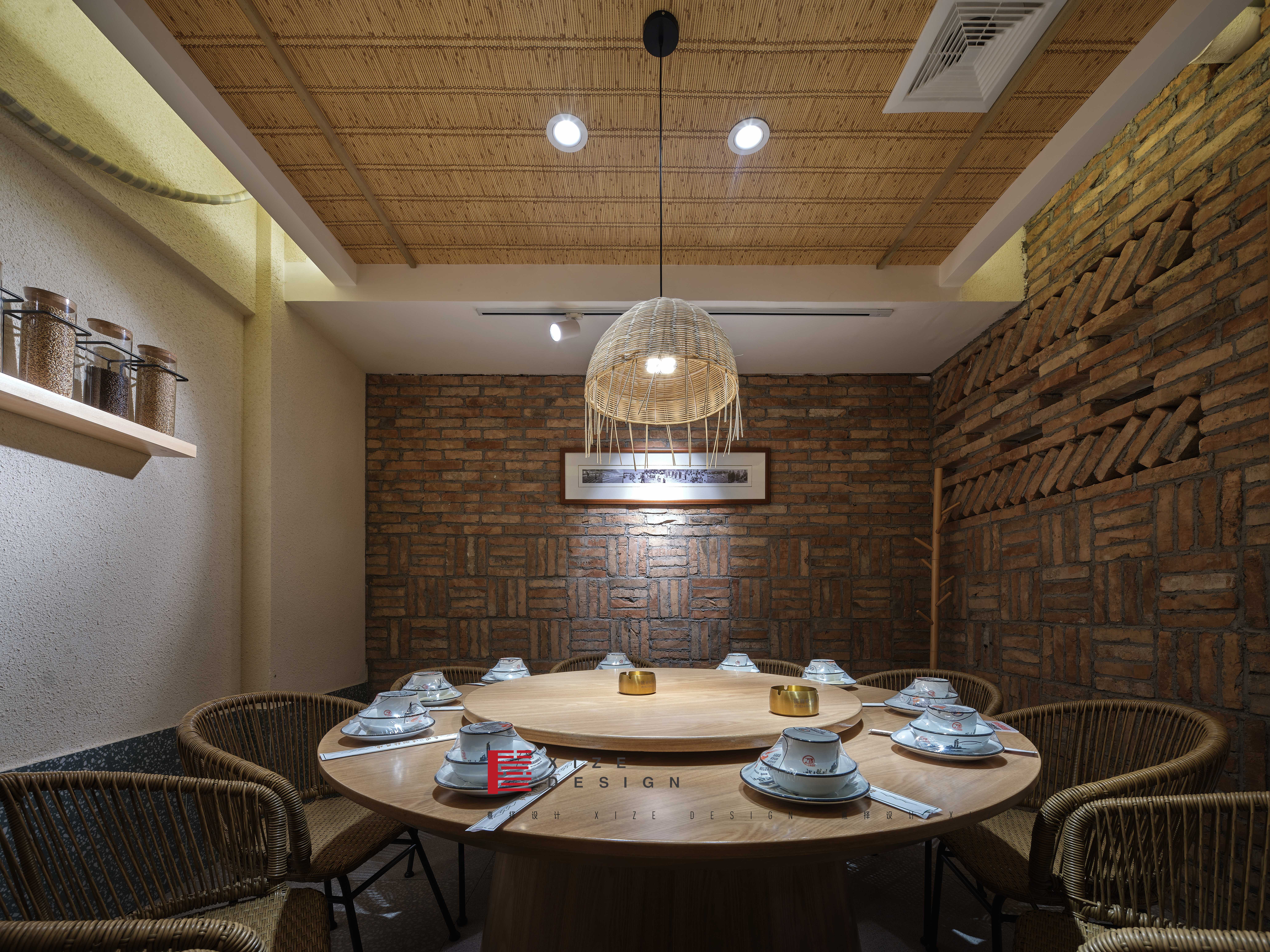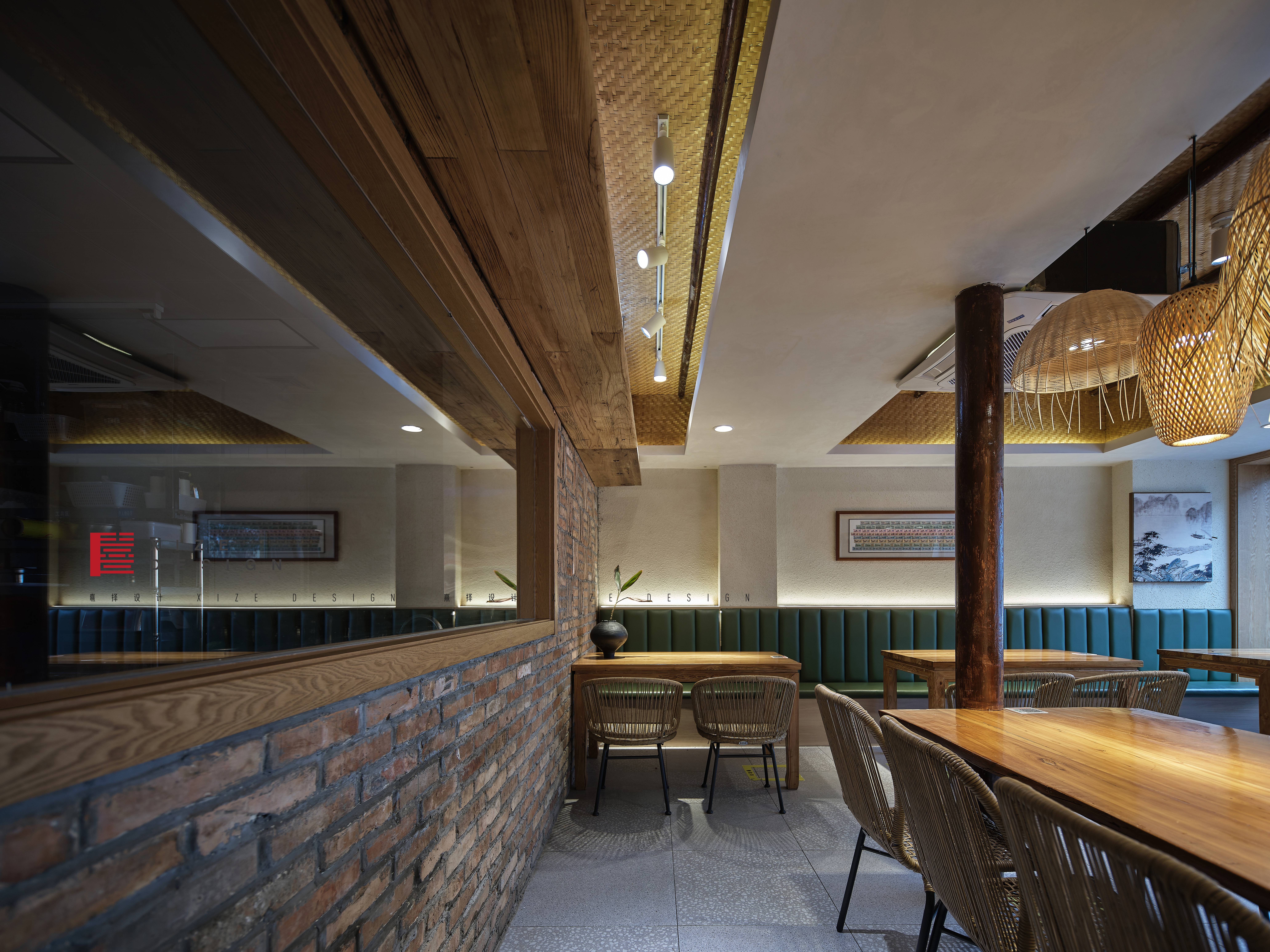 空间意境:设计团队基于周边地理环境、以及乡土菜门店的品牌理念,进行思考与创作,从中建立崭新的空间塑造,打破所谓的常规边框。最终决定通过落地玻璃窗与木质结构,在繁华的闹市中,打造了一座“老房子”。