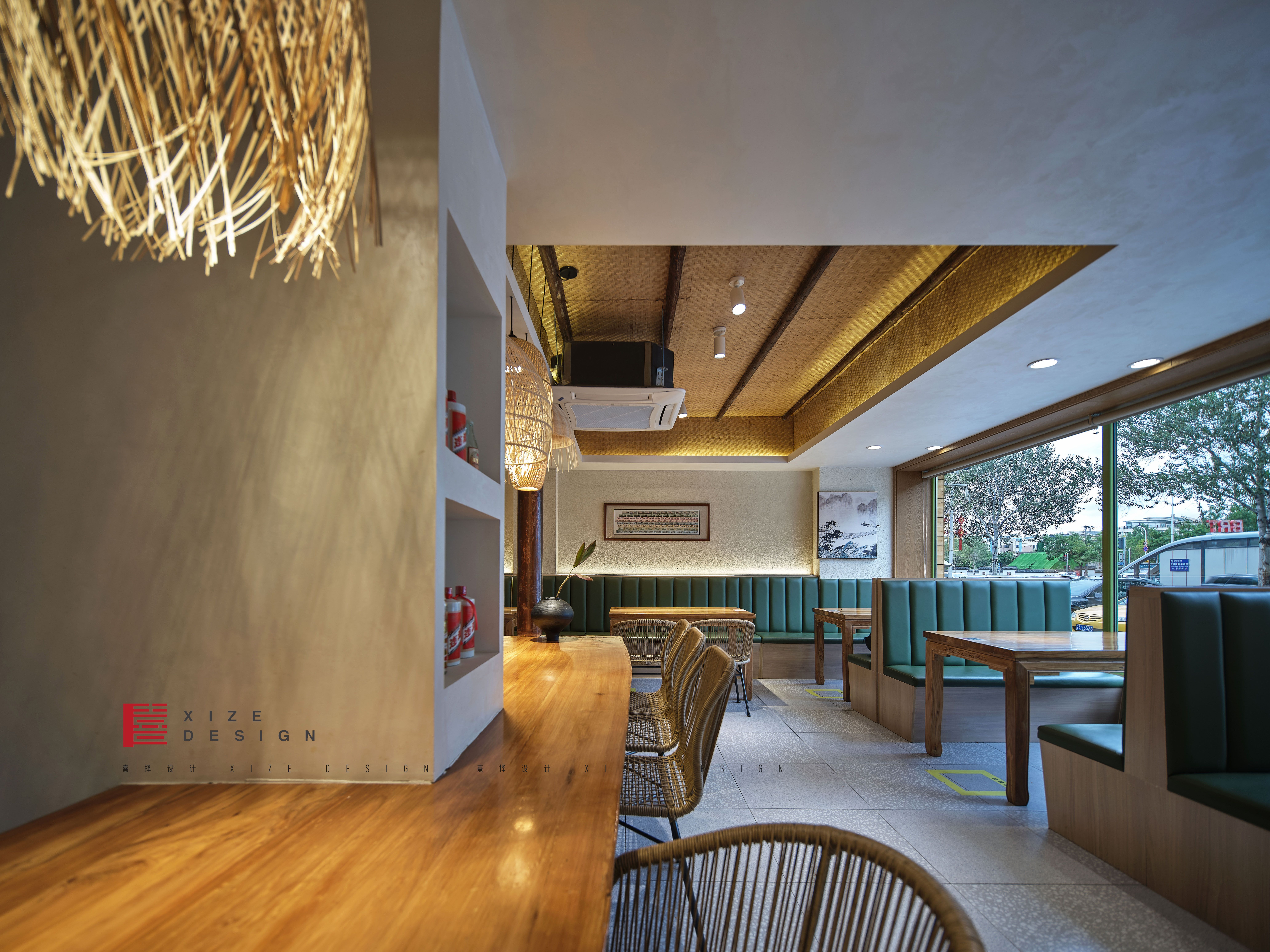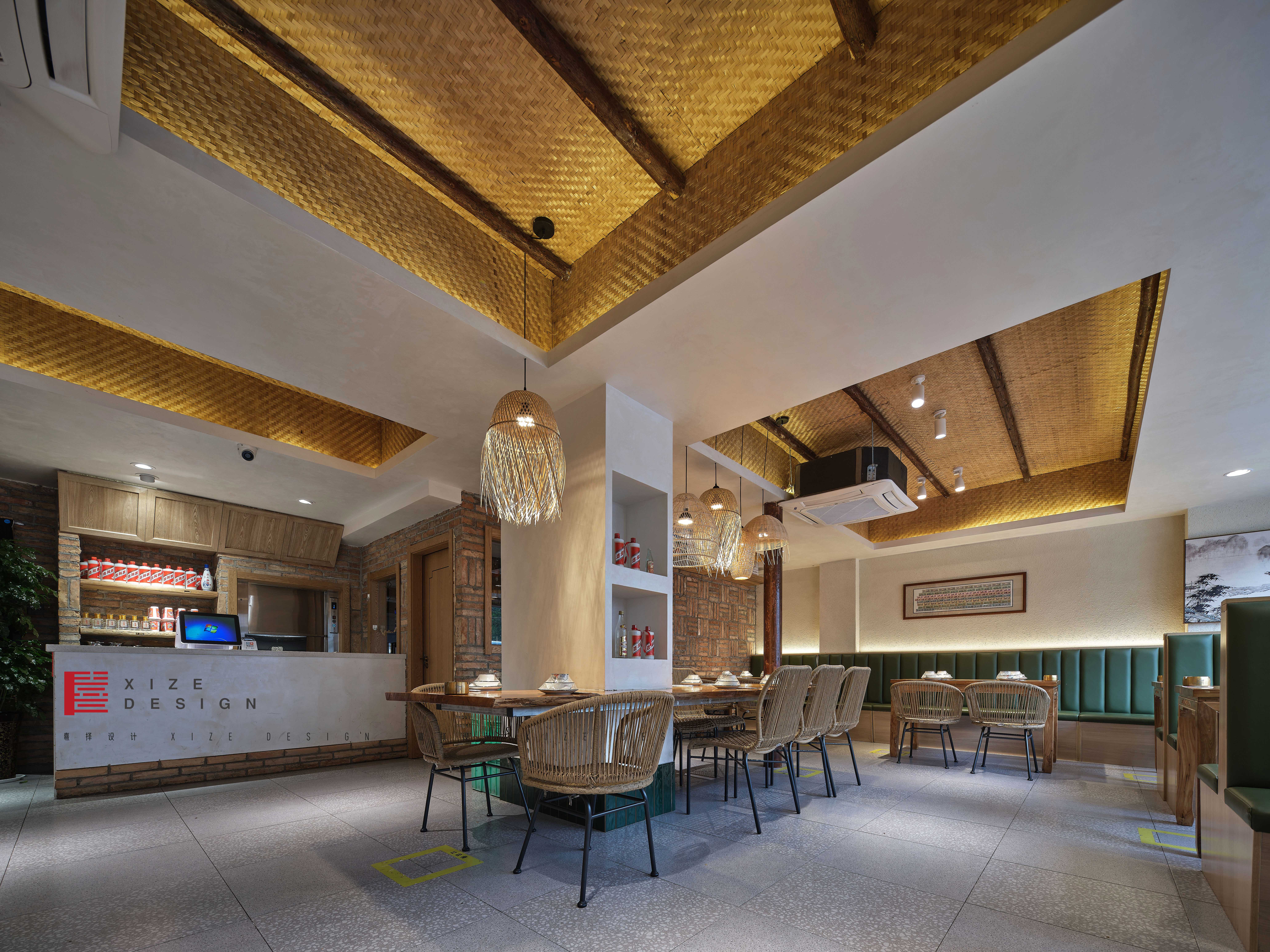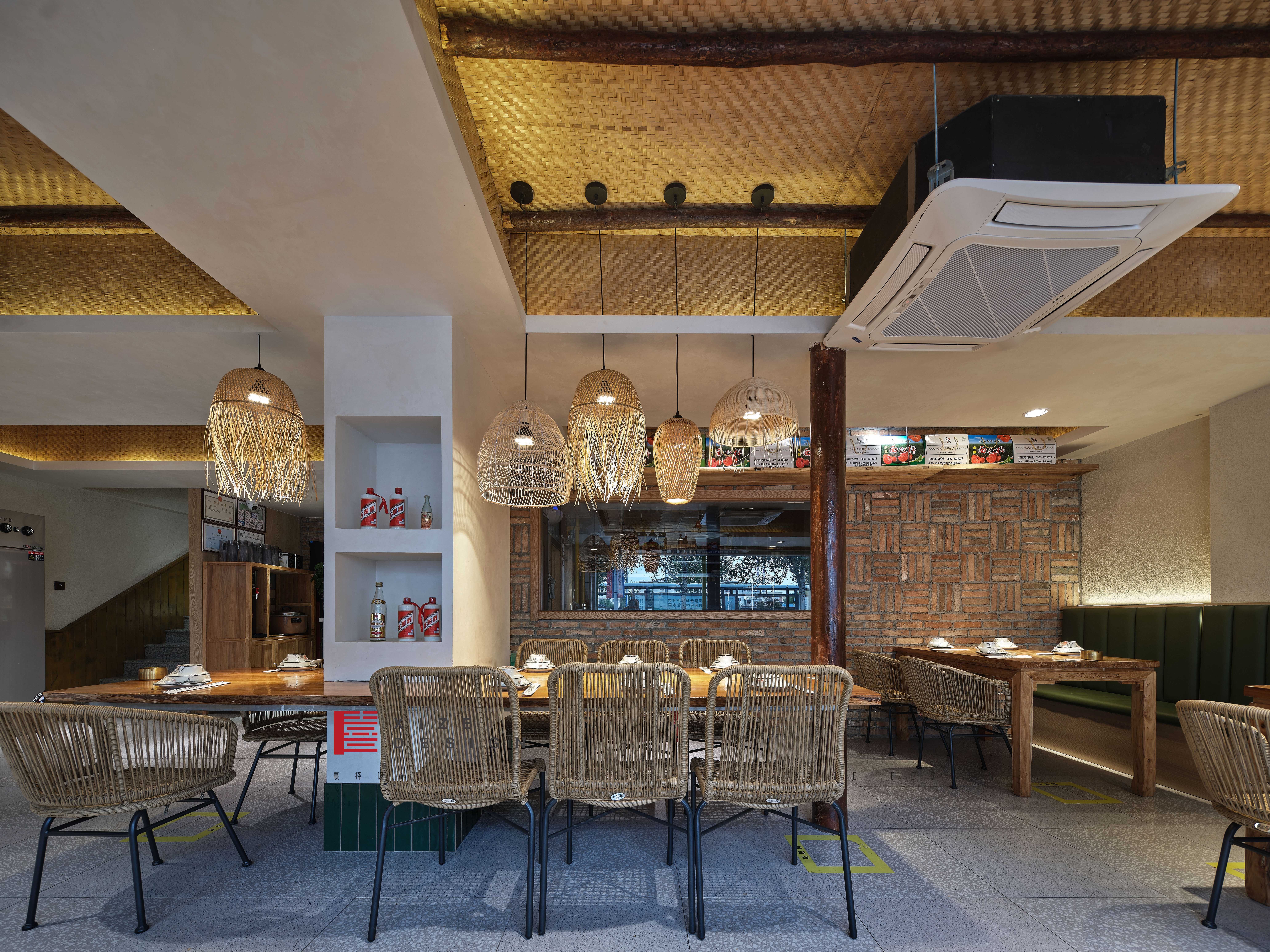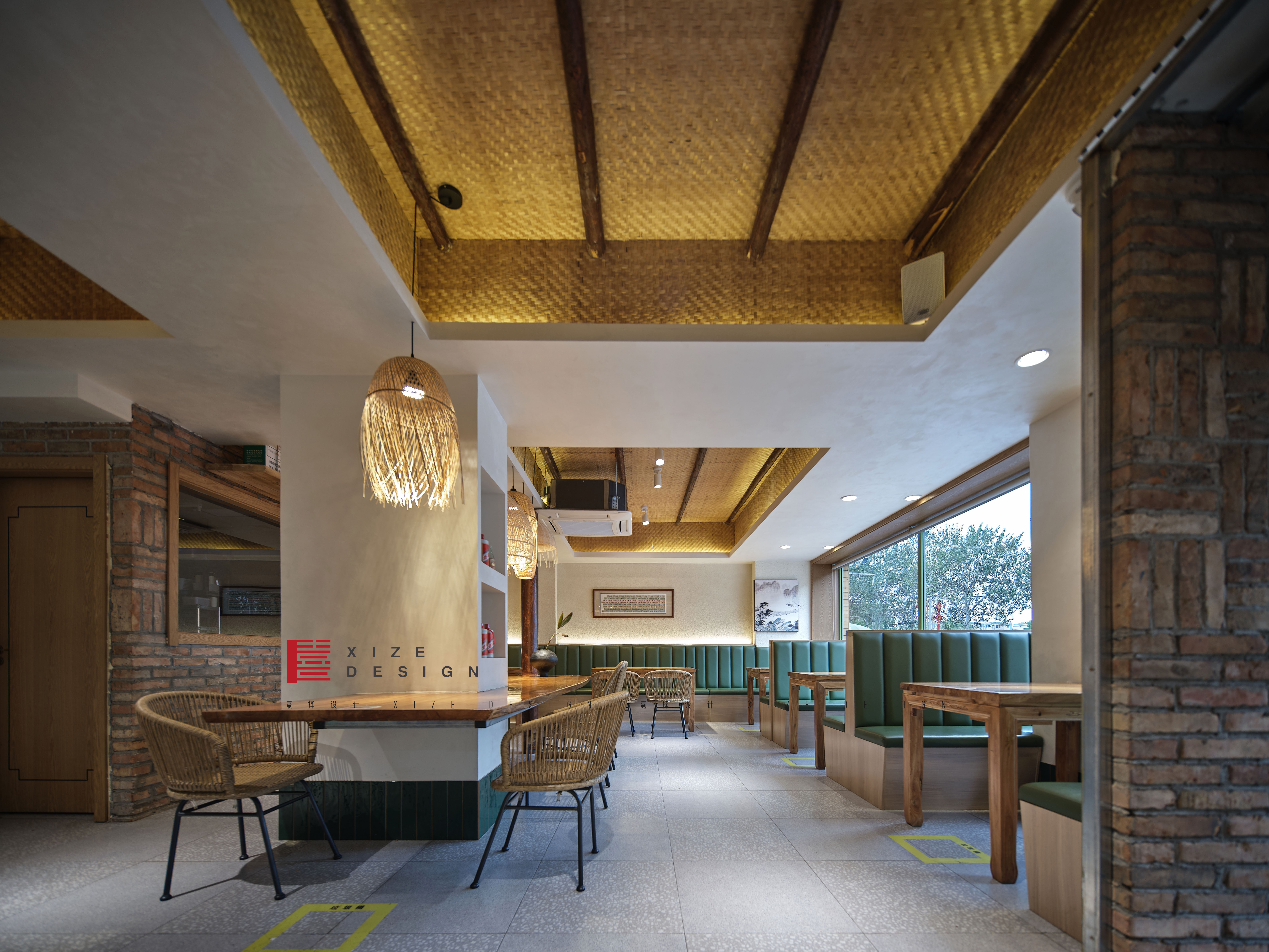 空间意境:设计团队基于周边地理环境、以及乡土菜门店的品牌理念,进行思考与创作,从中建立崭新的空间塑造,打破所谓的常规边框。最终决定通过落地玻璃窗与木质结构,在繁华的闹市中,打造了一座“老房子”。