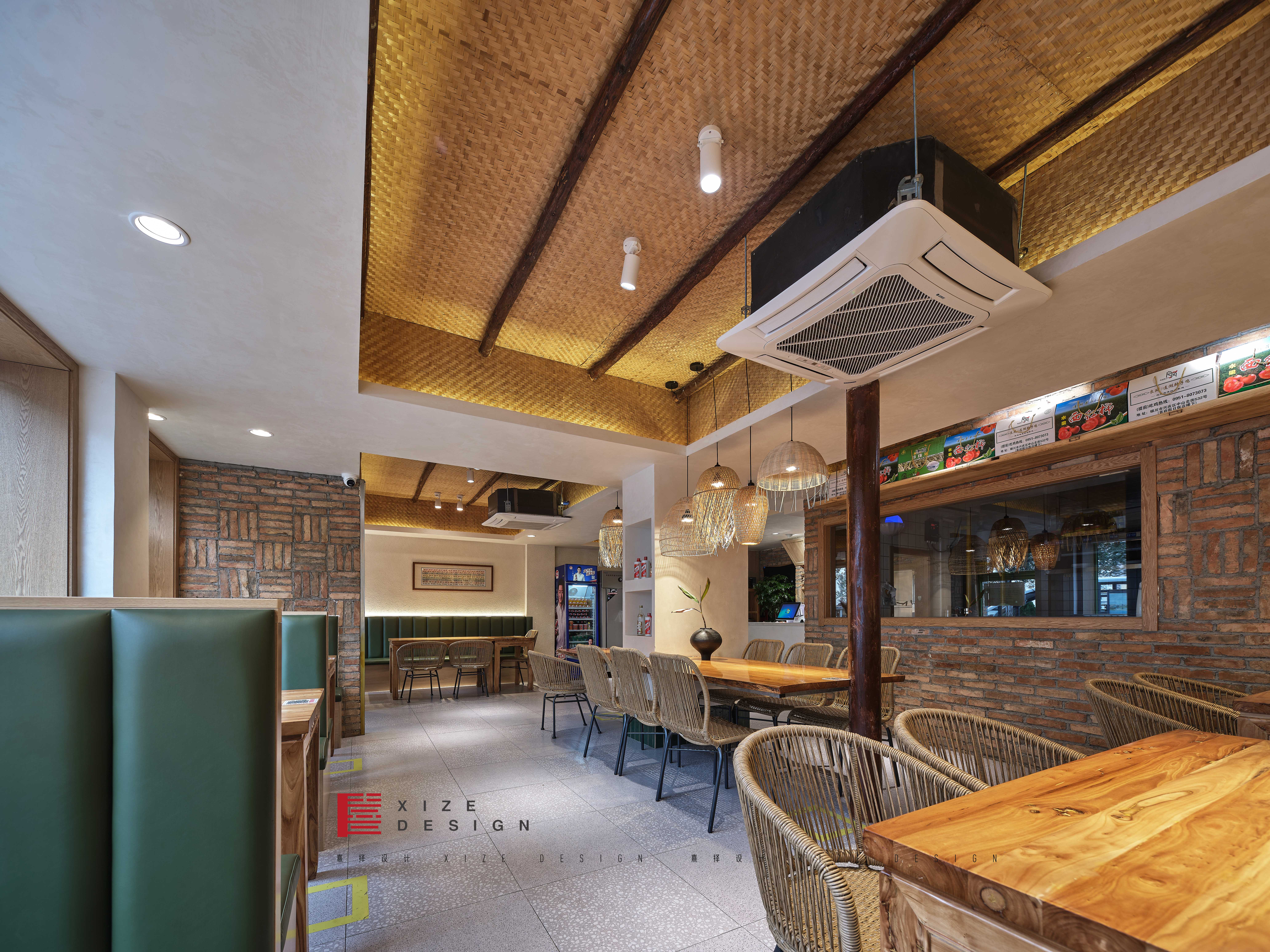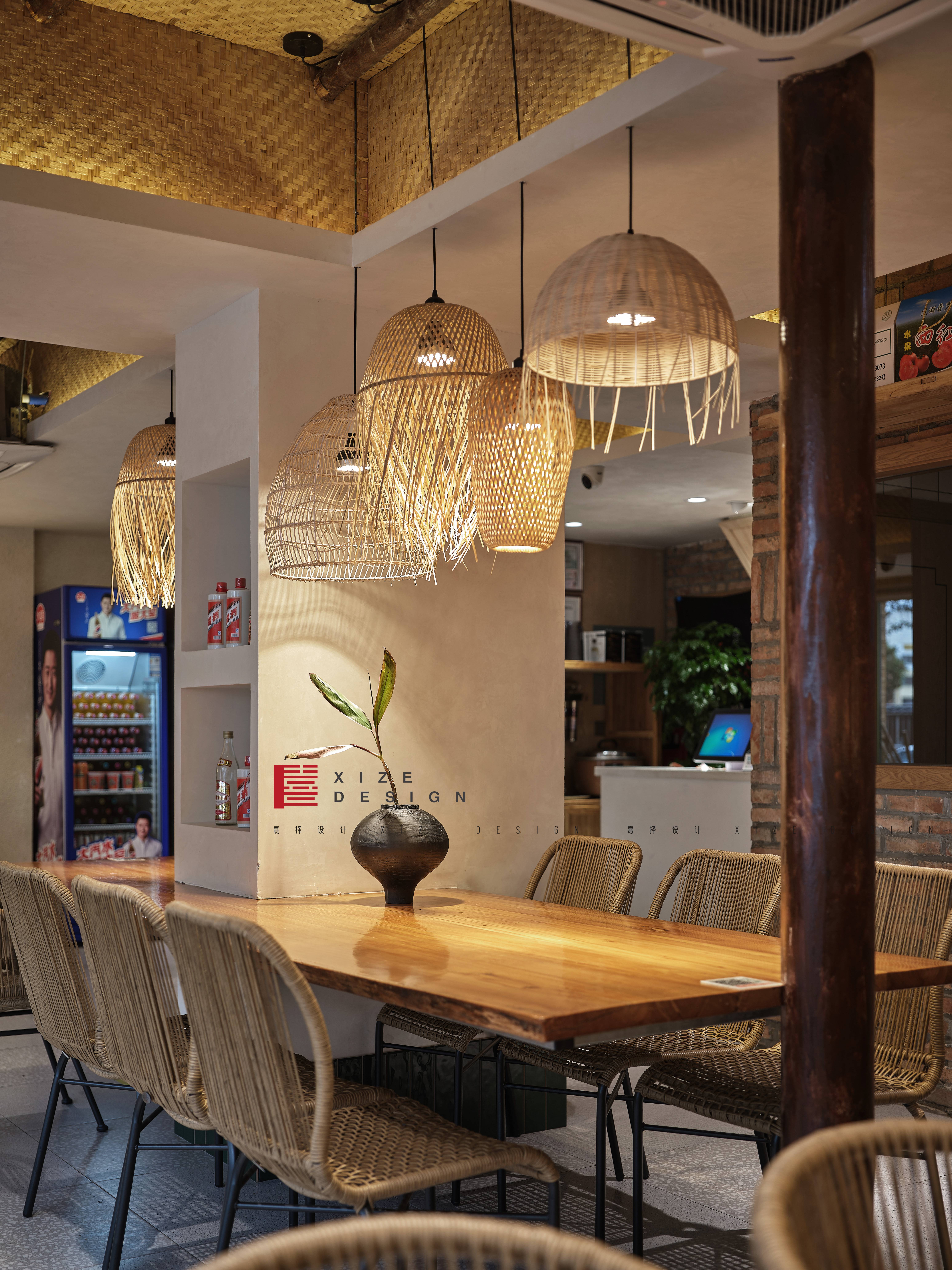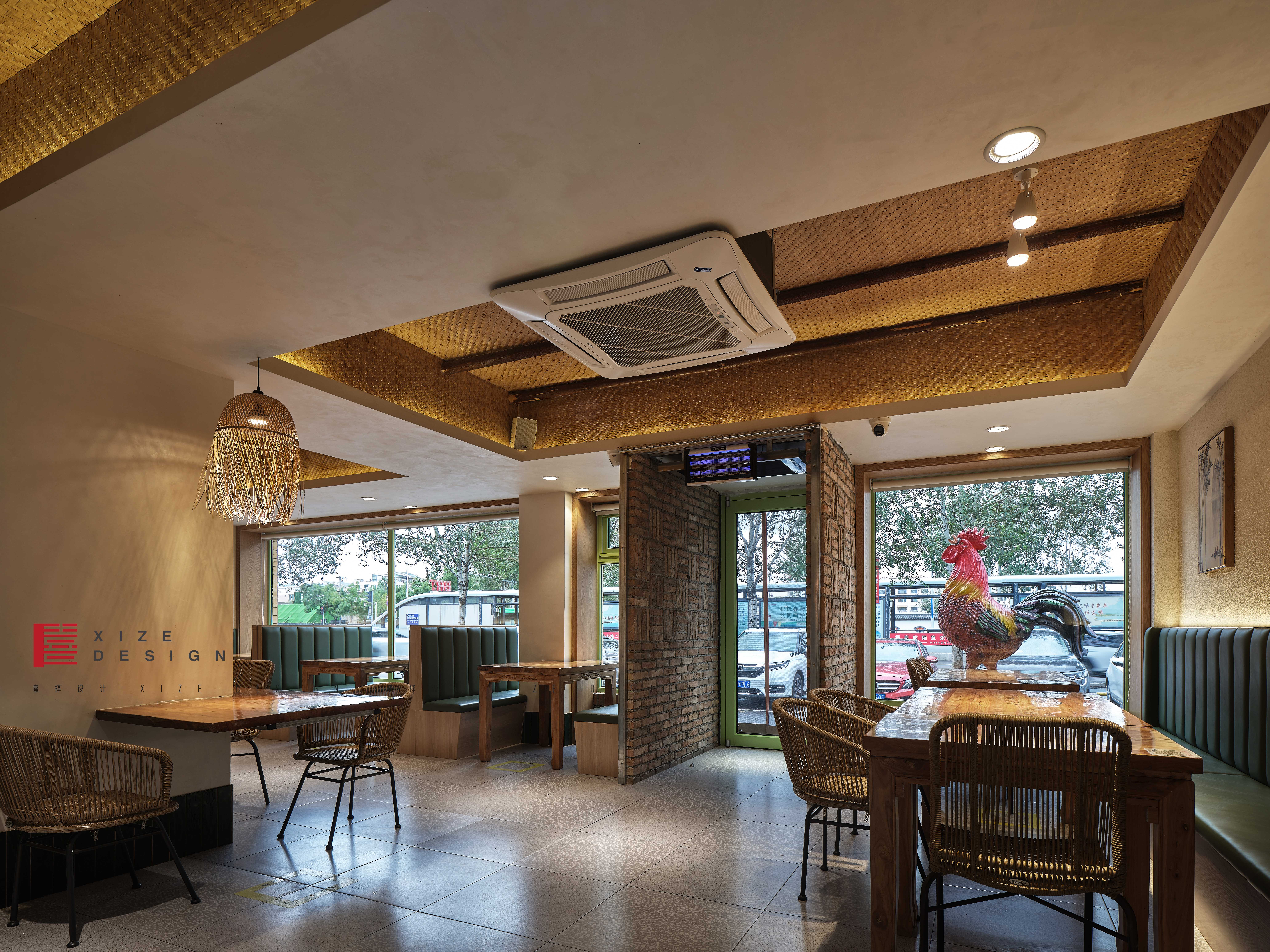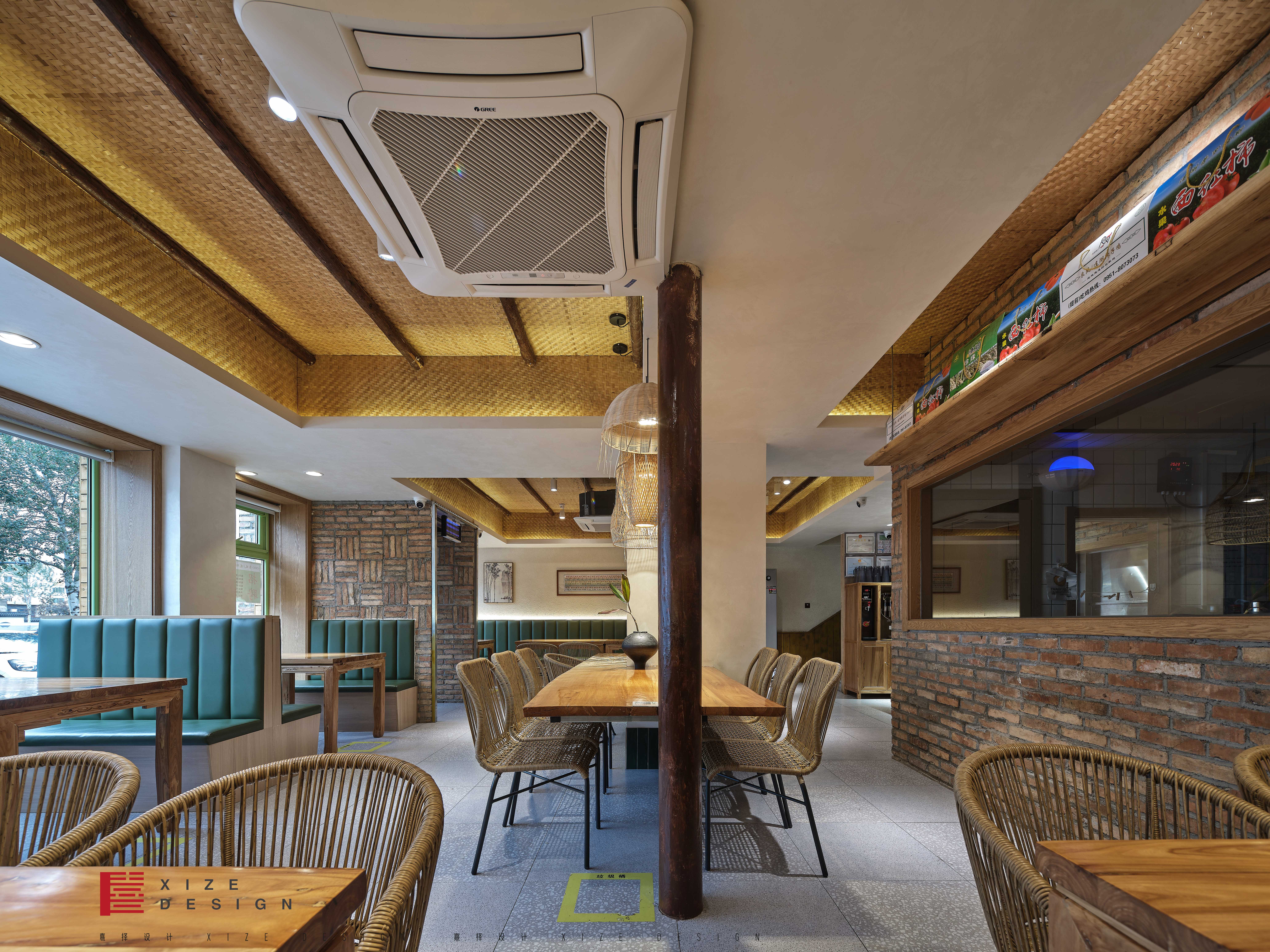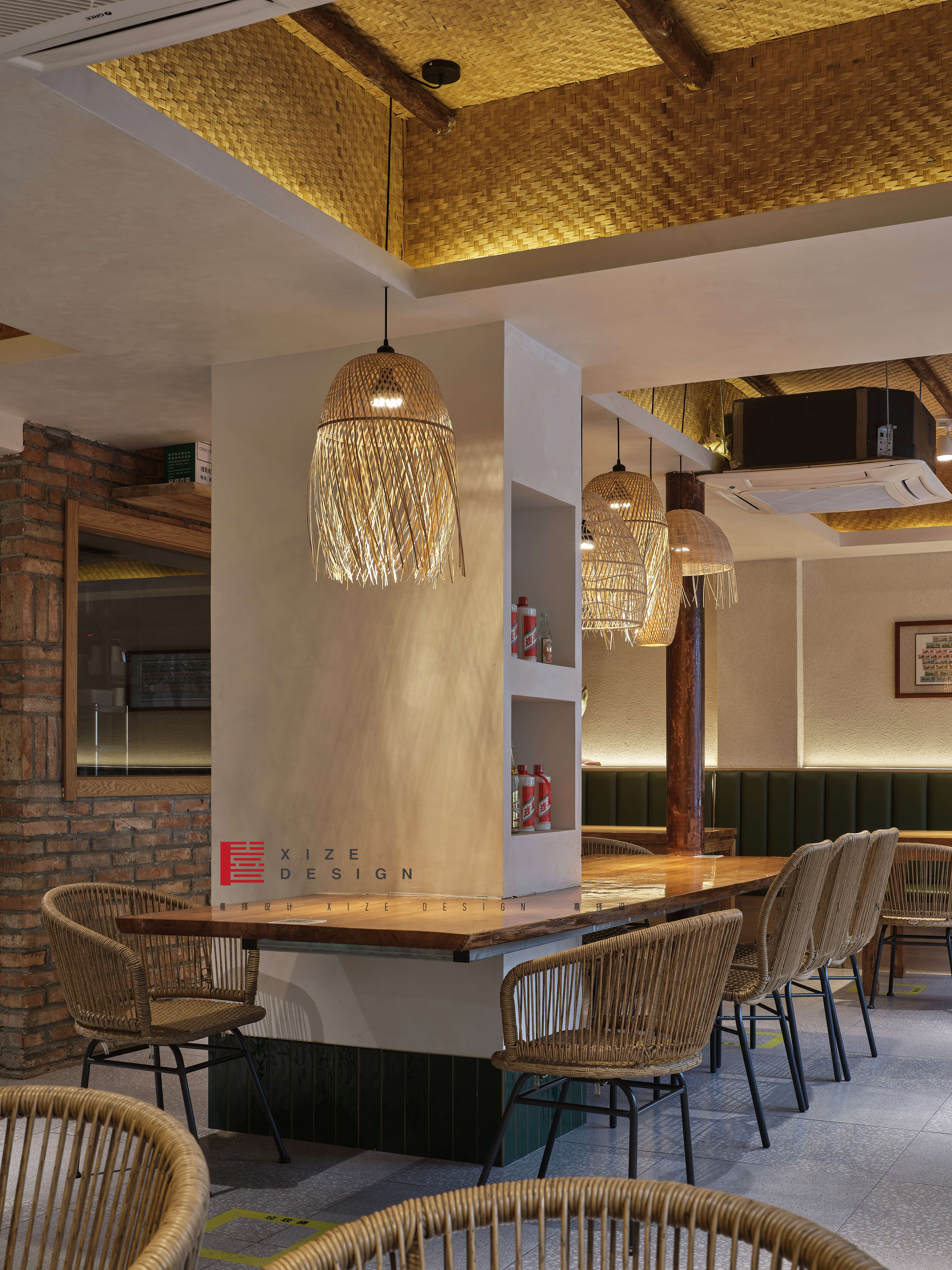 空间意境:设计团队基于周边地理环境、以及乡土菜门店的品牌理念,进行思考与创作,从中建立崭新的空间塑造,打破所谓的常规边框。最终决定通过落地玻璃窗与木质结构,在繁华的闹市中,打造了一座“老房子”。