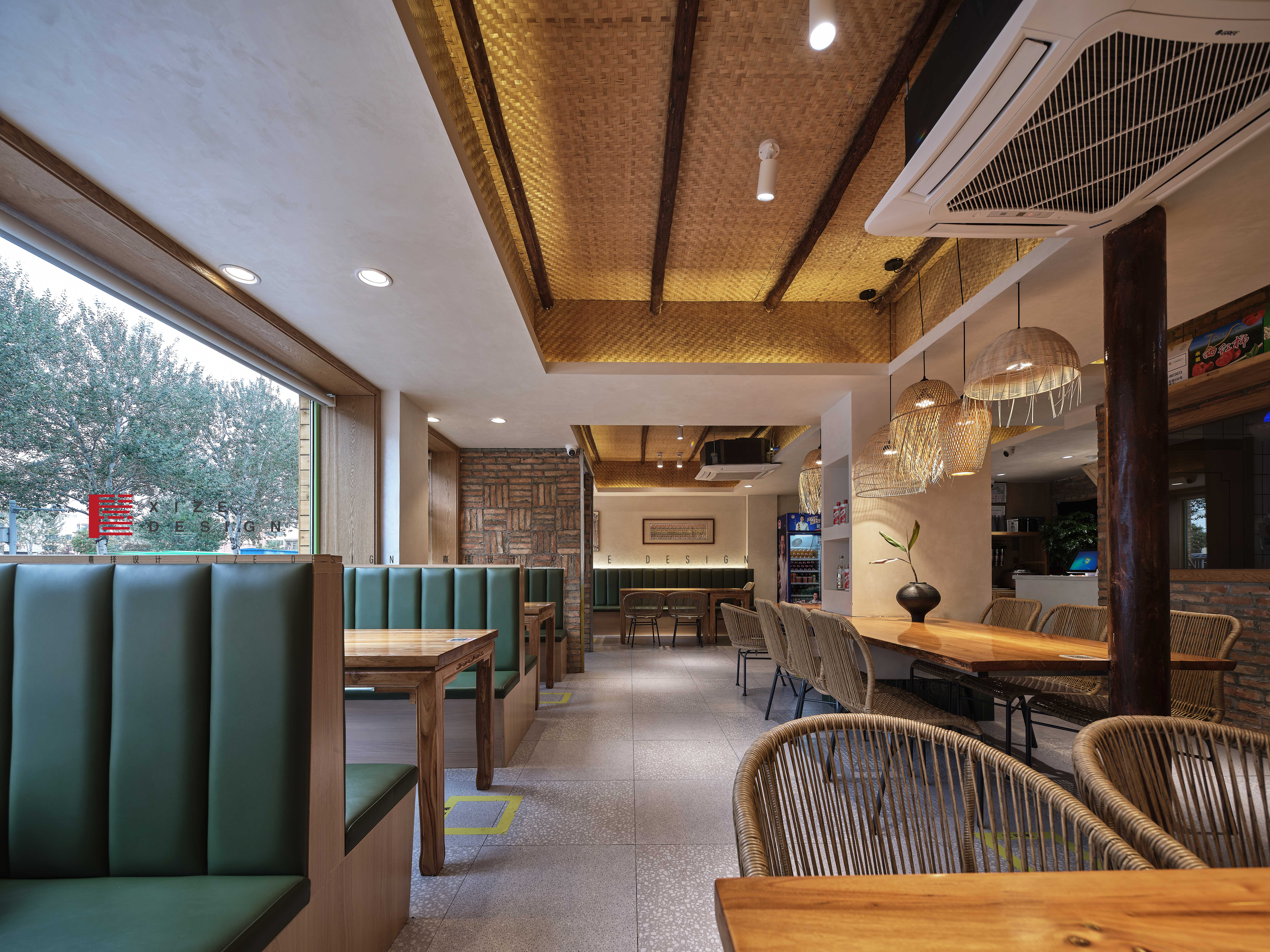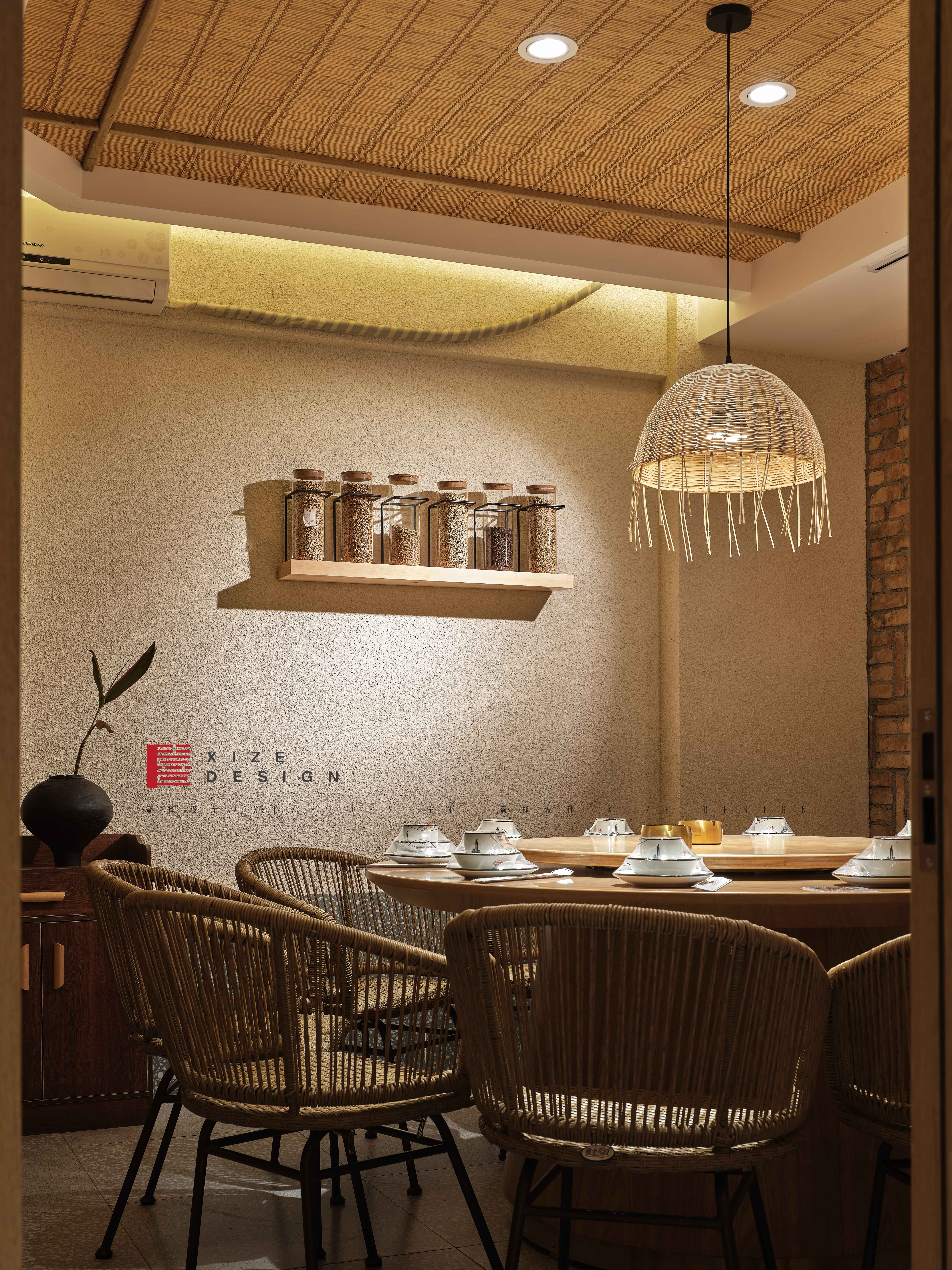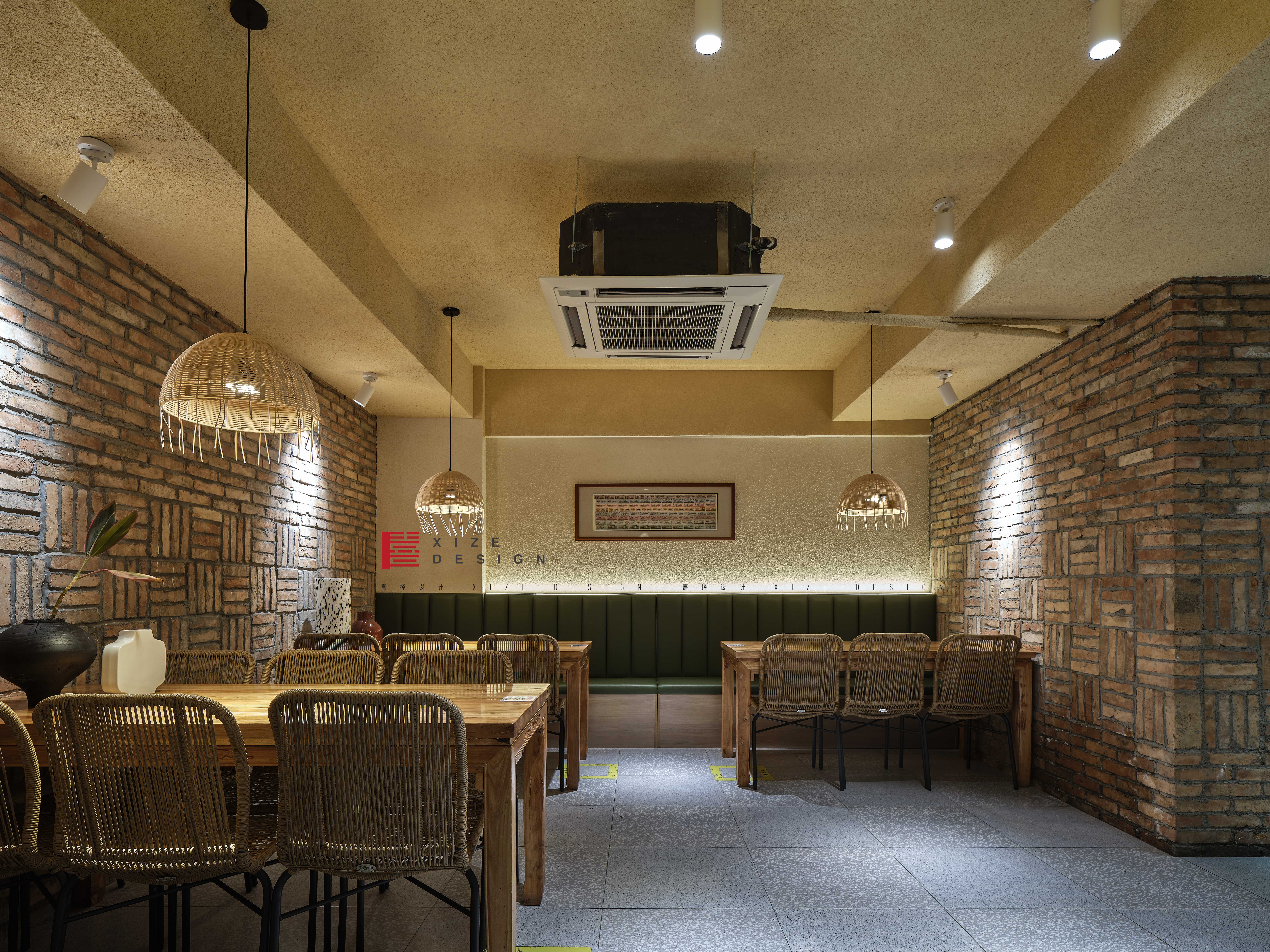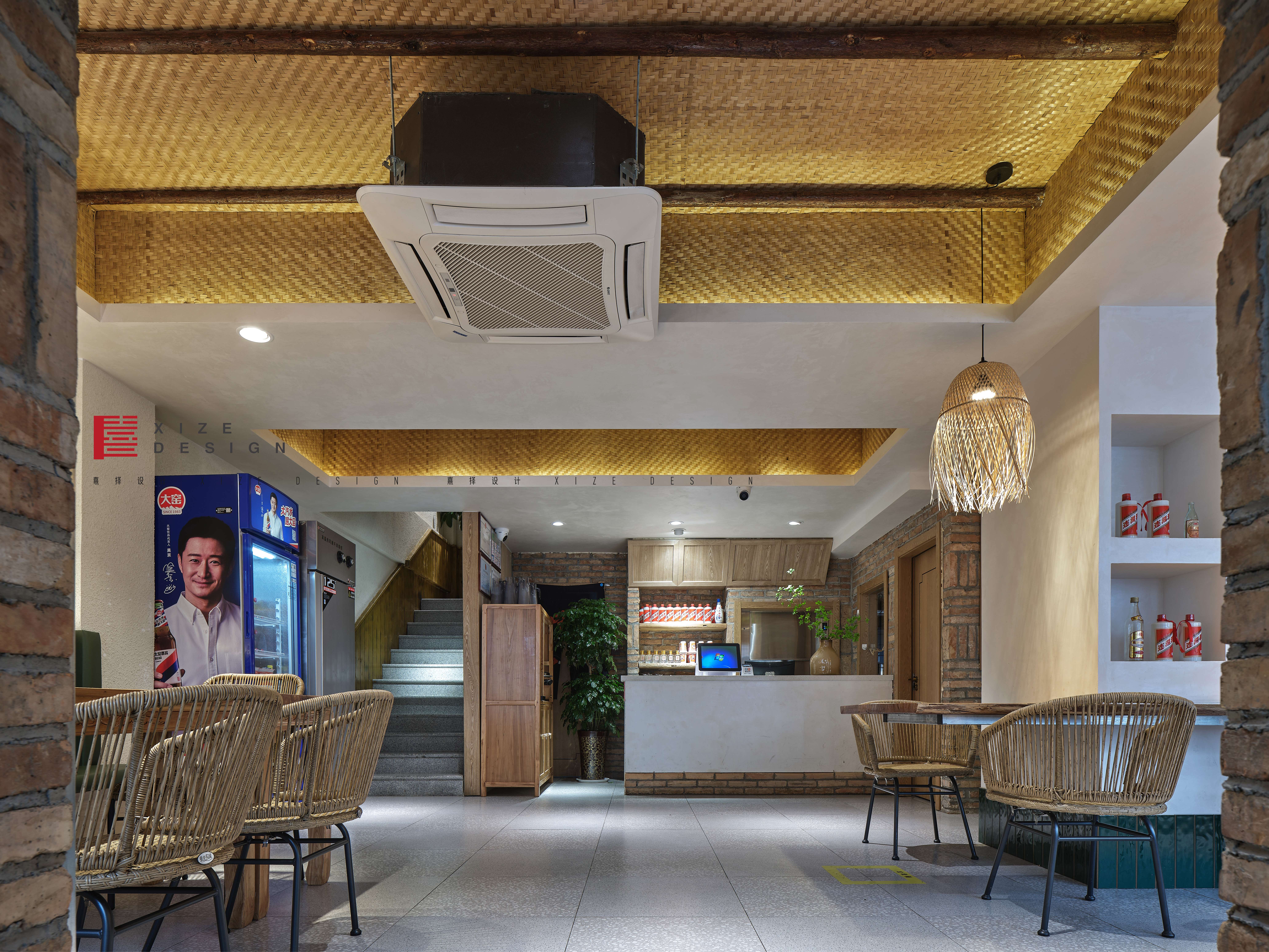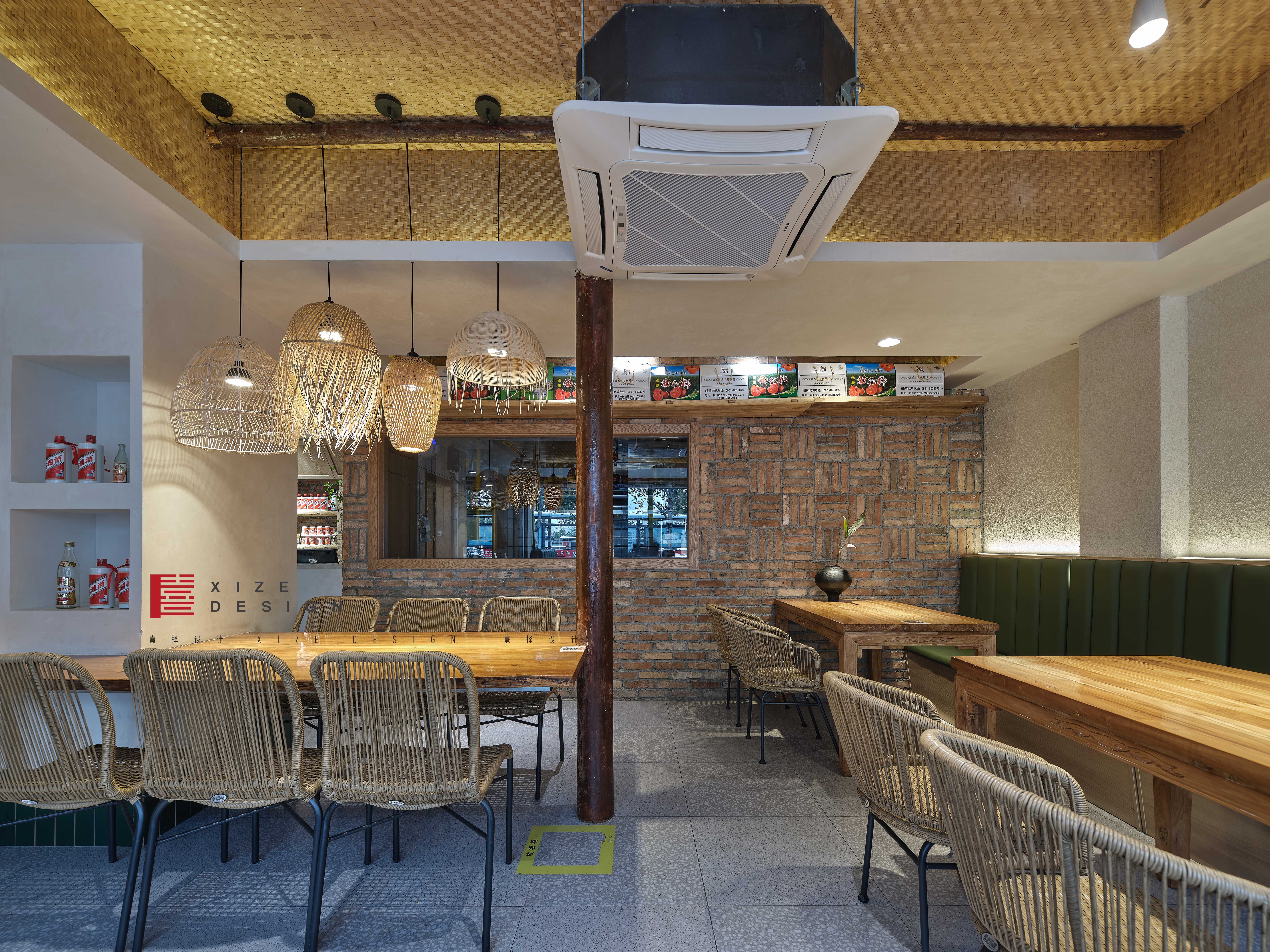 空间意境:设计团队基于周边地理环境、以及乡土菜门店的品牌理念,进行思考与创作,从中建立崭新的空间塑造,打破所谓的常规边框。最终决定通过落地玻璃窗与木质结构,在繁华的闹市中,打造了一座“老房子”。