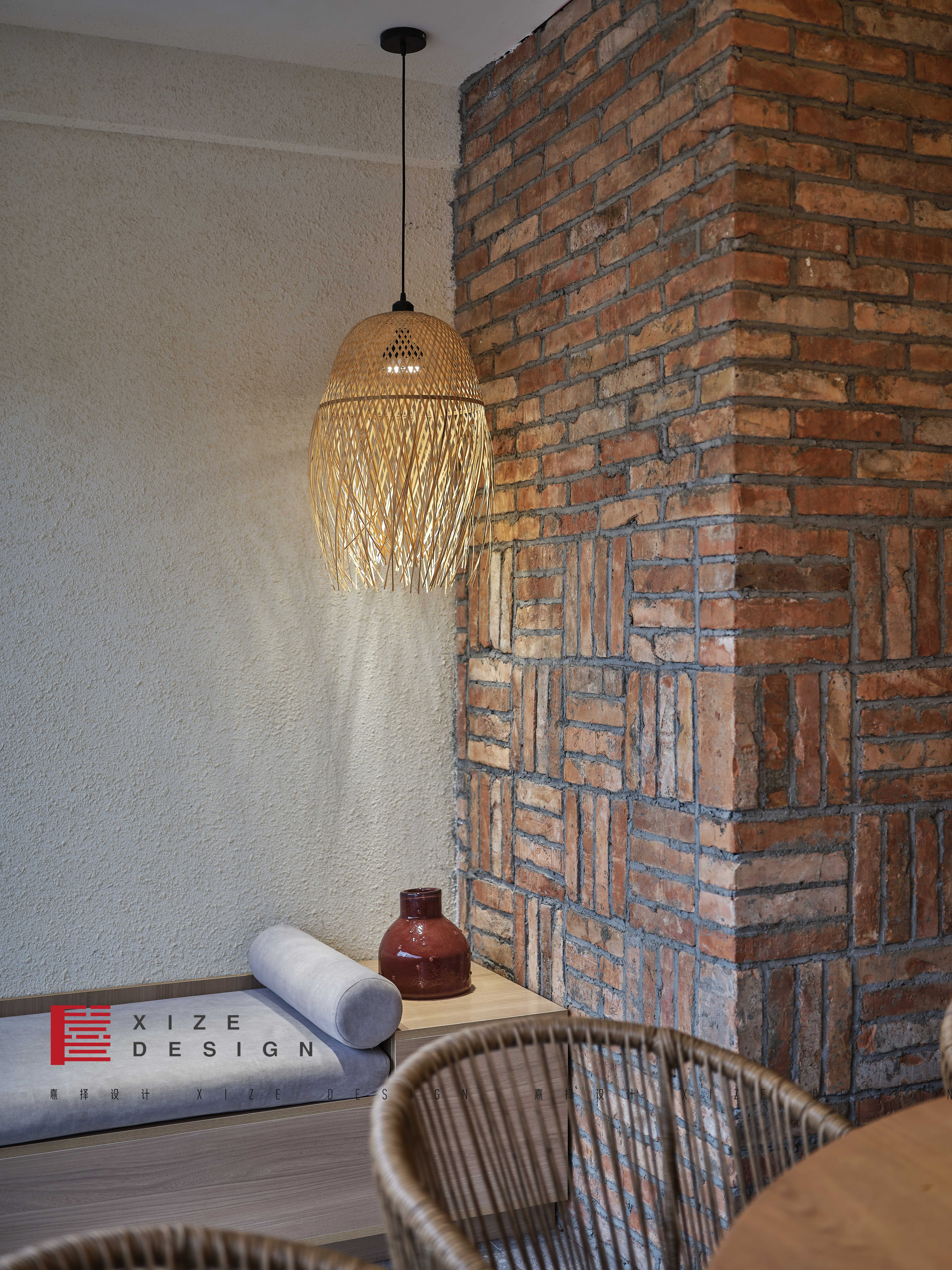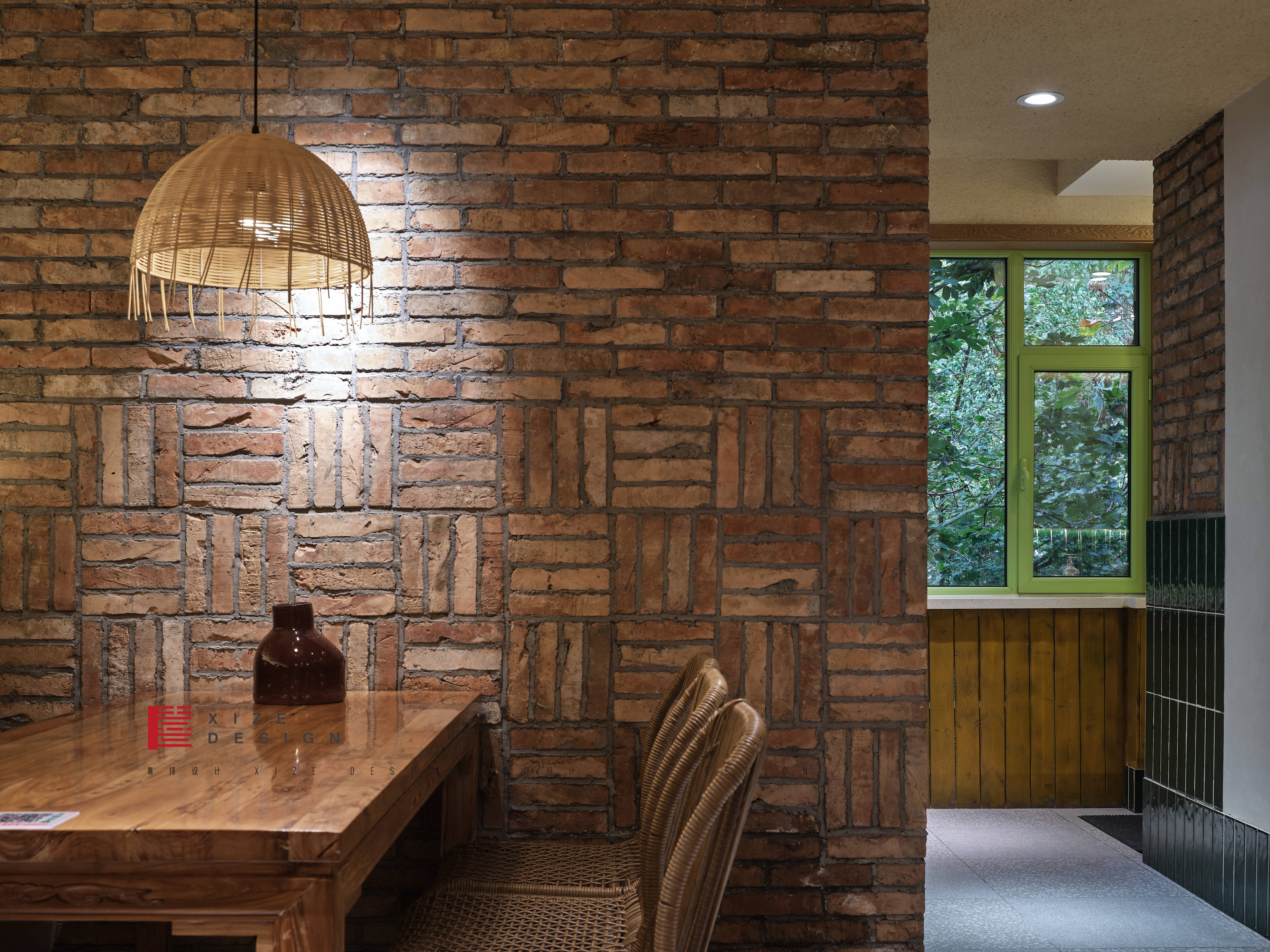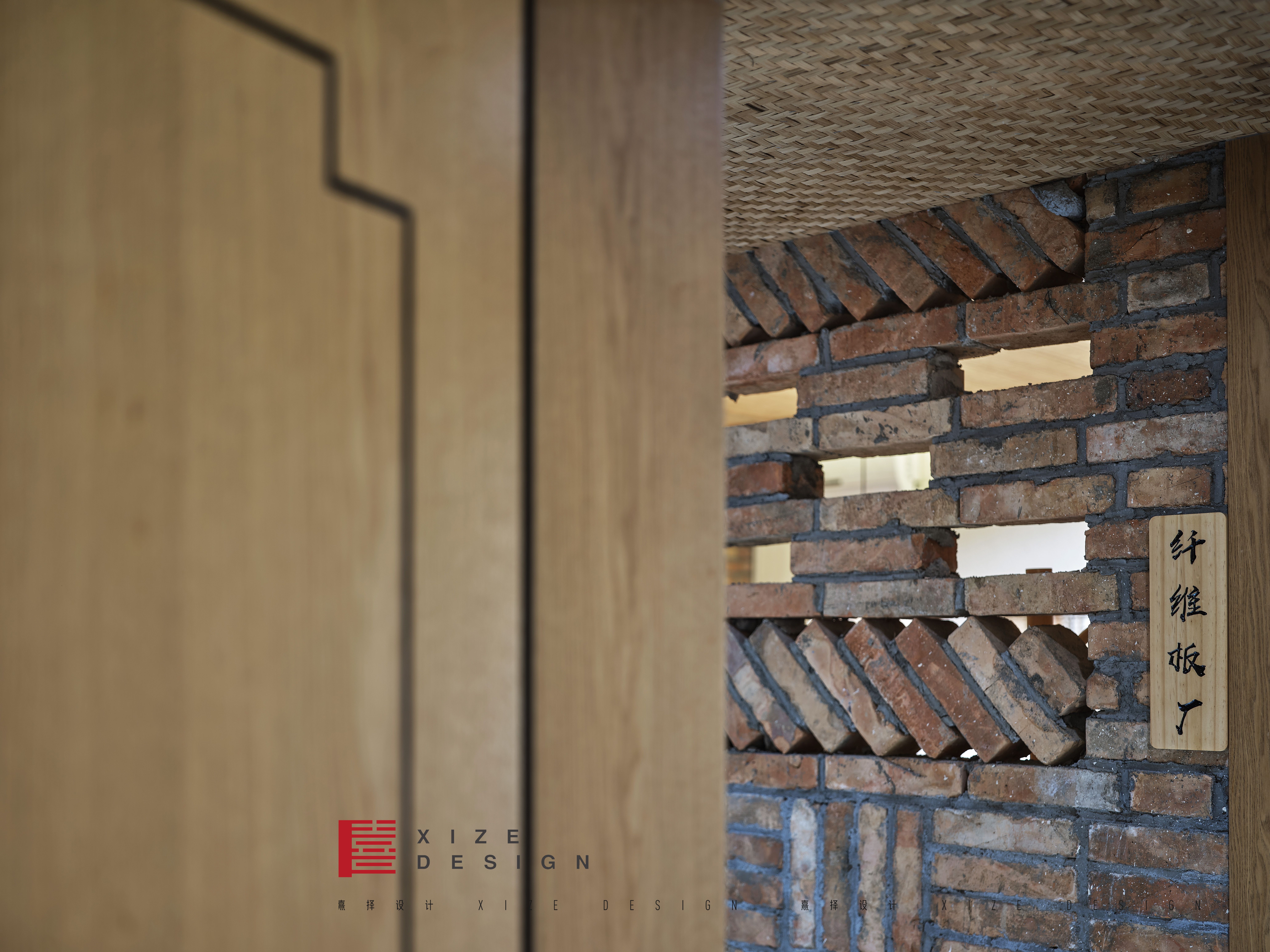 设计选材:空间整体简洁明亮,玻璃面、旧红砖、草席与木饰面的结合,使整个空间充满自然气息与岁月的痕迹。所用全部红砖都来自连湖农场的旧房拆除运送过来重新启用。也许当年的工匠已经逝去,风和天空任然在雕刻他。我们把他接来,没有那么多的浮华,竟可能展现岁月的质感,同时我们还争取到了没有装饰面的剩余空间。使一切事物变得十分地自然有机,反朴归真、紧凑温情。