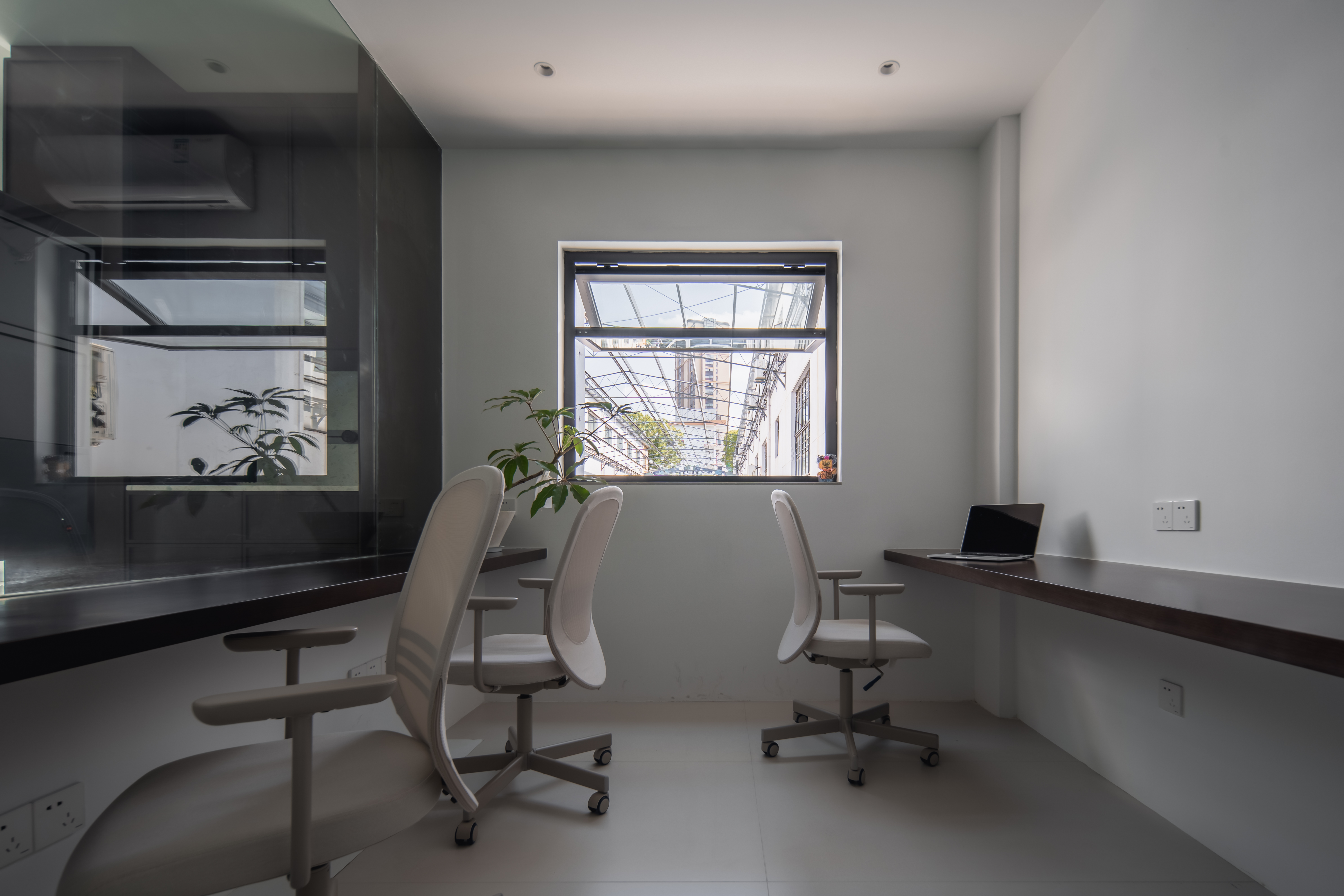 空间意境:我们选用了这款更为明亮通透的这一稿,在立面上没有做刻意阻隔,办公室也用了玻璃,说是避免大家聊天(实际很难),整体给人,明朗通透的环境体感。