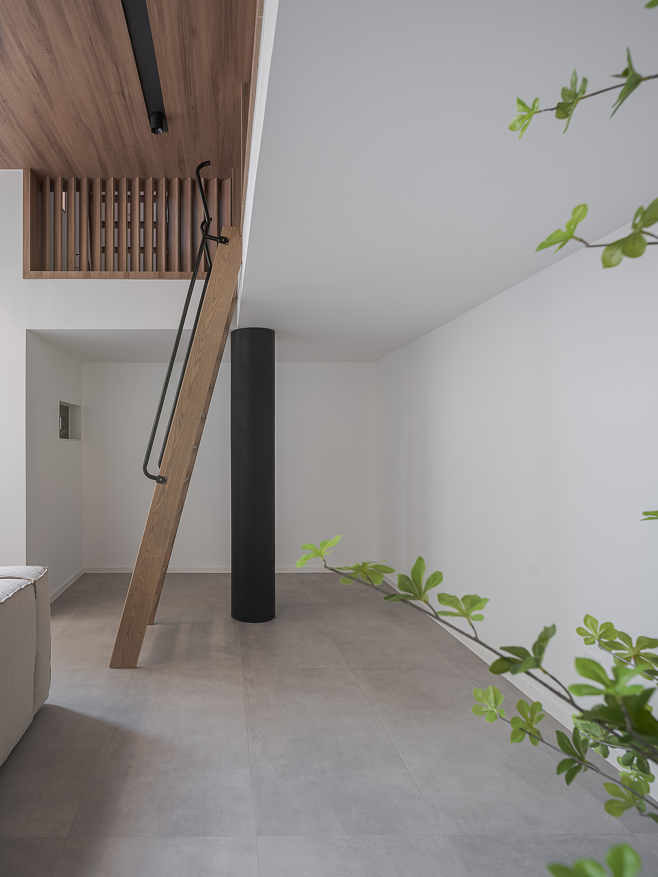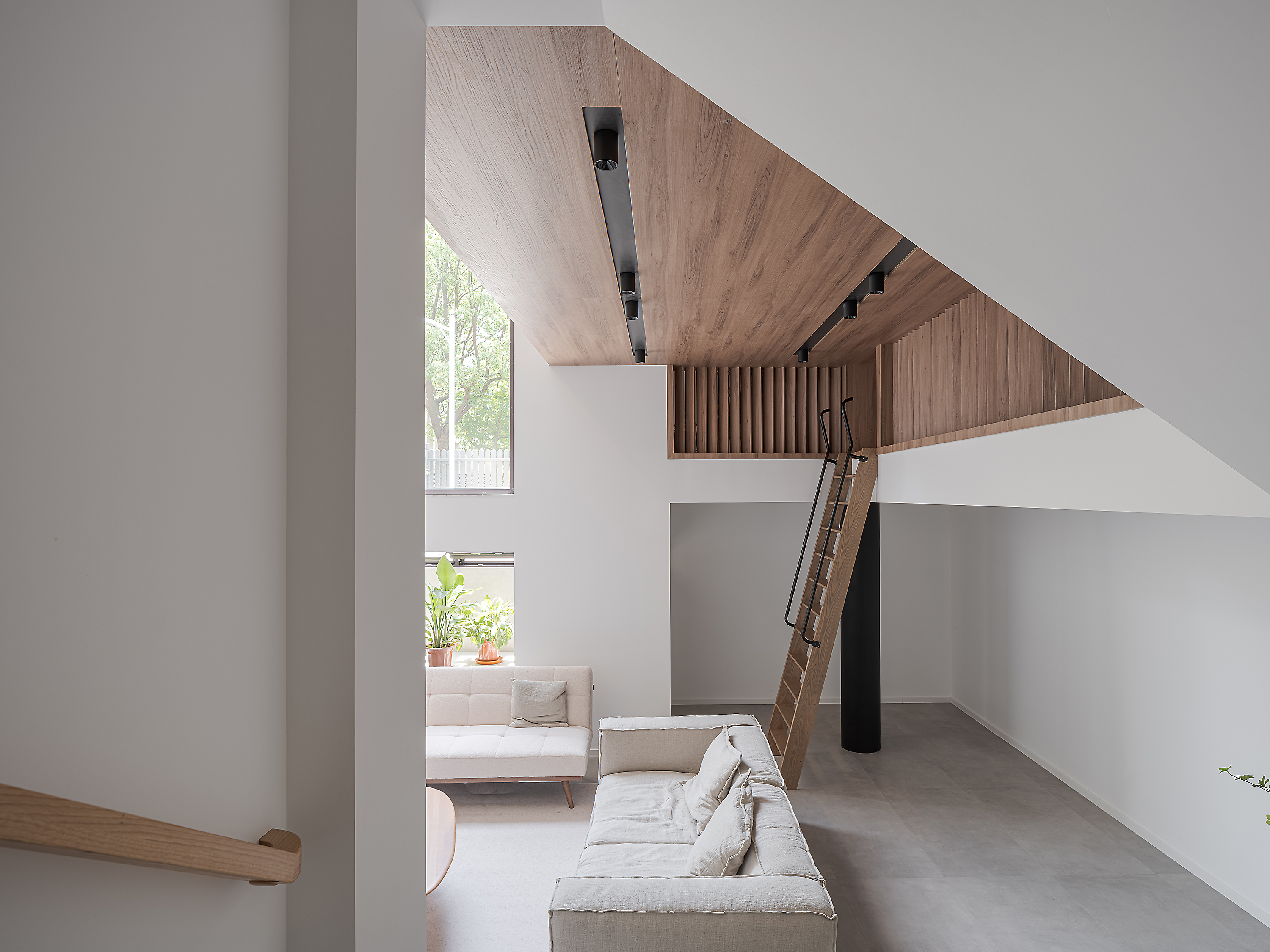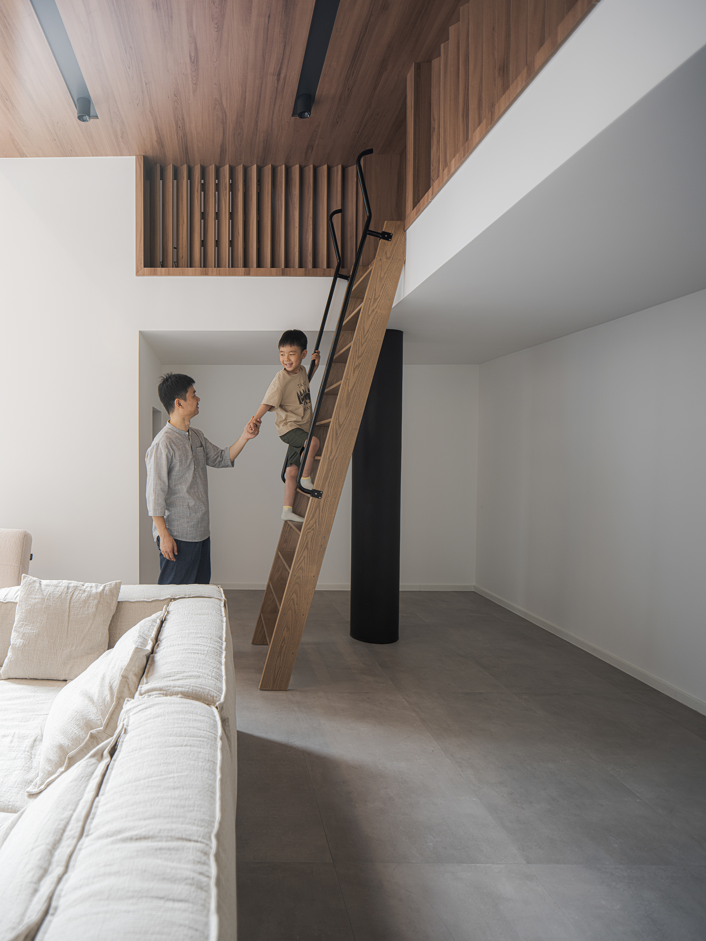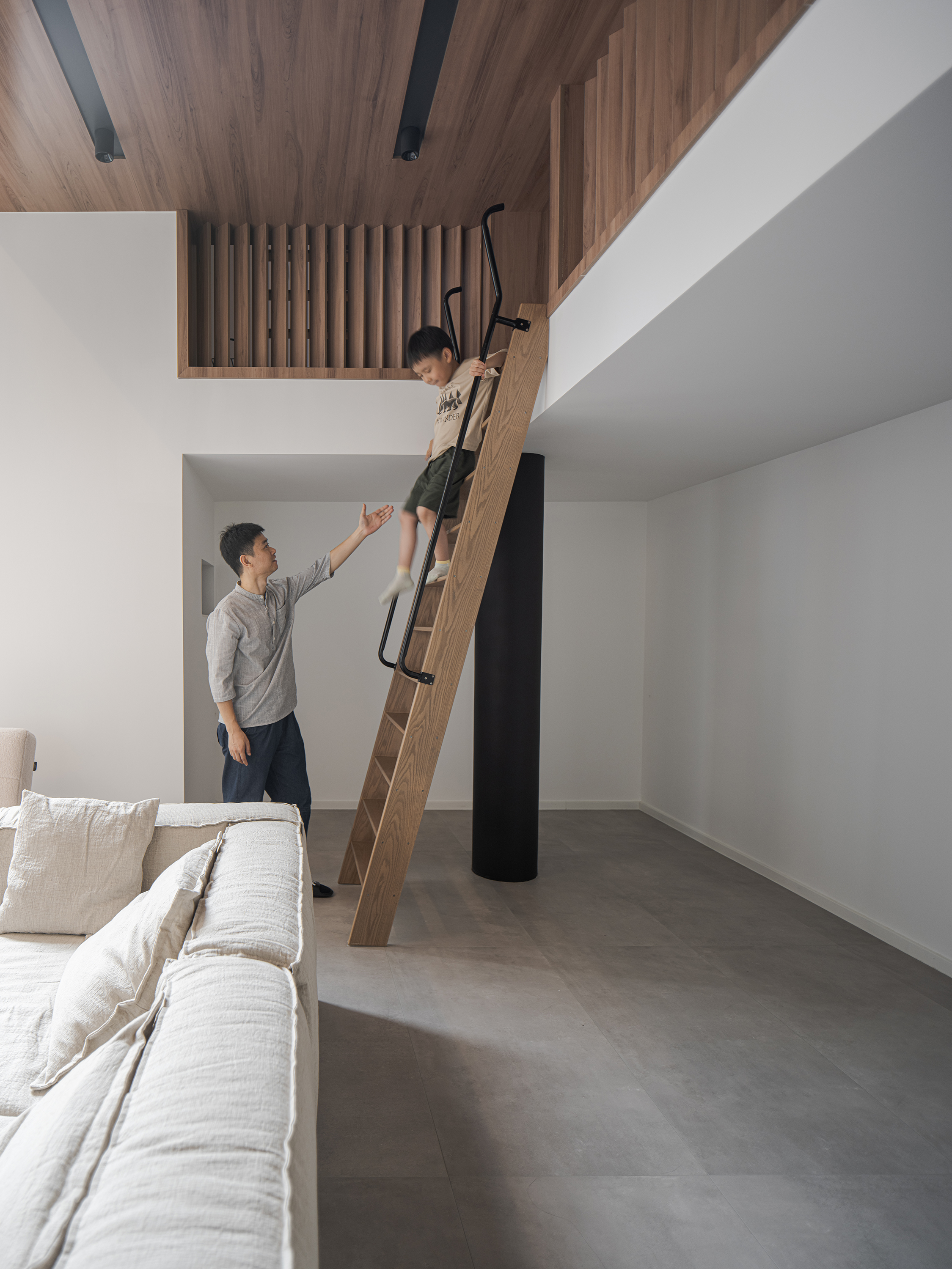 2. 利用高差,在客厅后方搭建了一个空中小木屋,作为餐厅的同时,利用各种形式的爬梯、镂空、穿透等,形成一个兼具实用、互动、娱乐的空间,更是一个具有“意象”性的空间体块。