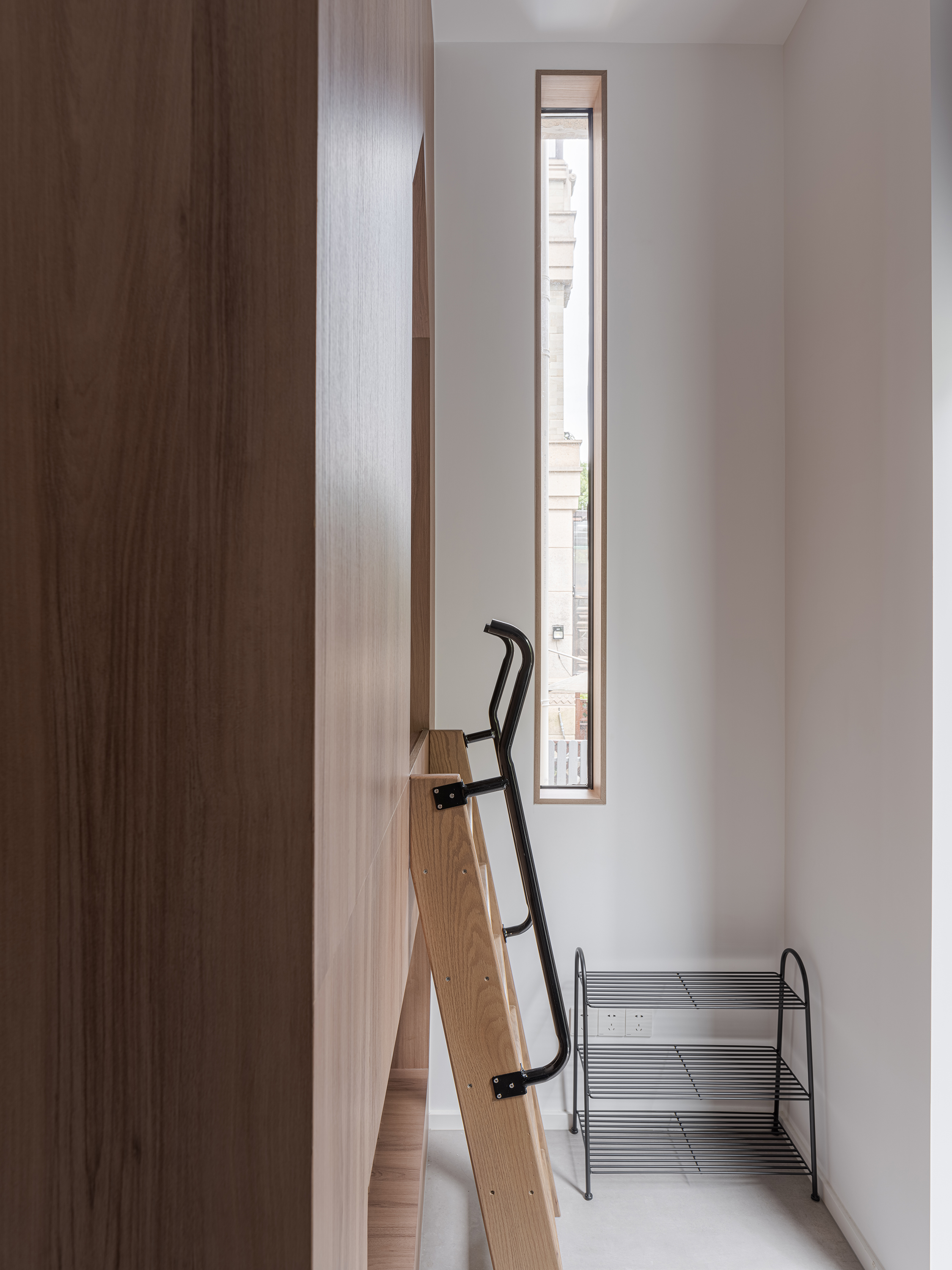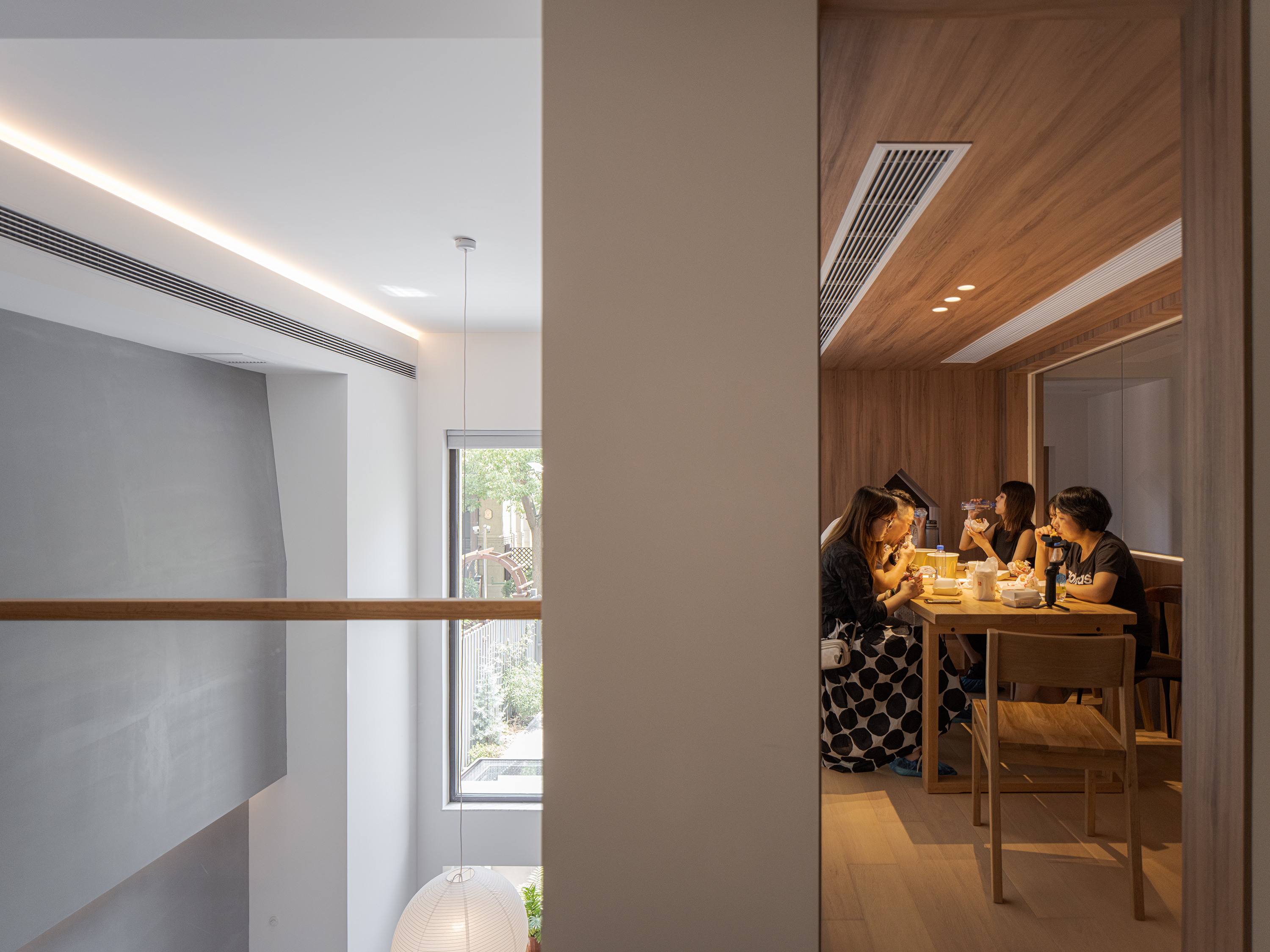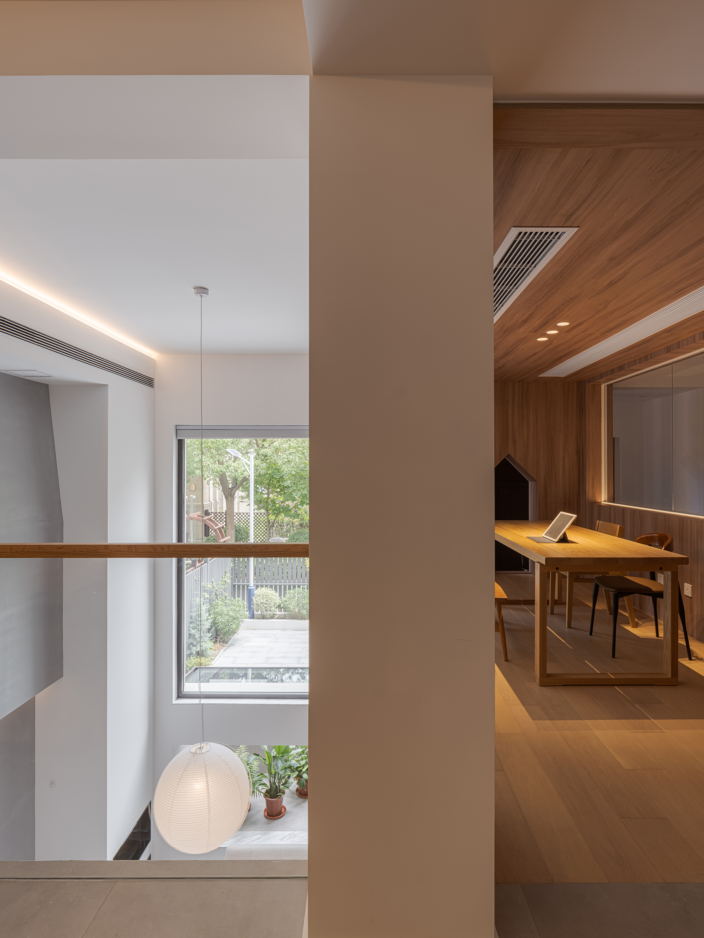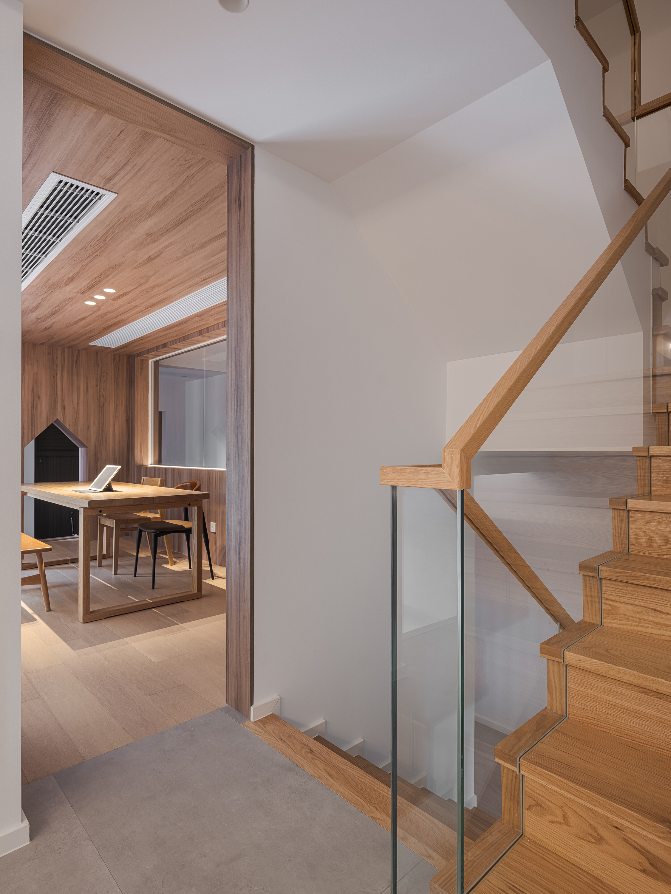 2. 利用高差,在客厅后方搭建了一个空中小木屋,作为餐厅的同时,利用各种形式的爬梯、镂空、穿透等,形成一个兼具实用、互动、娱乐的空间,更是一个具有“意象”性的空间体块。