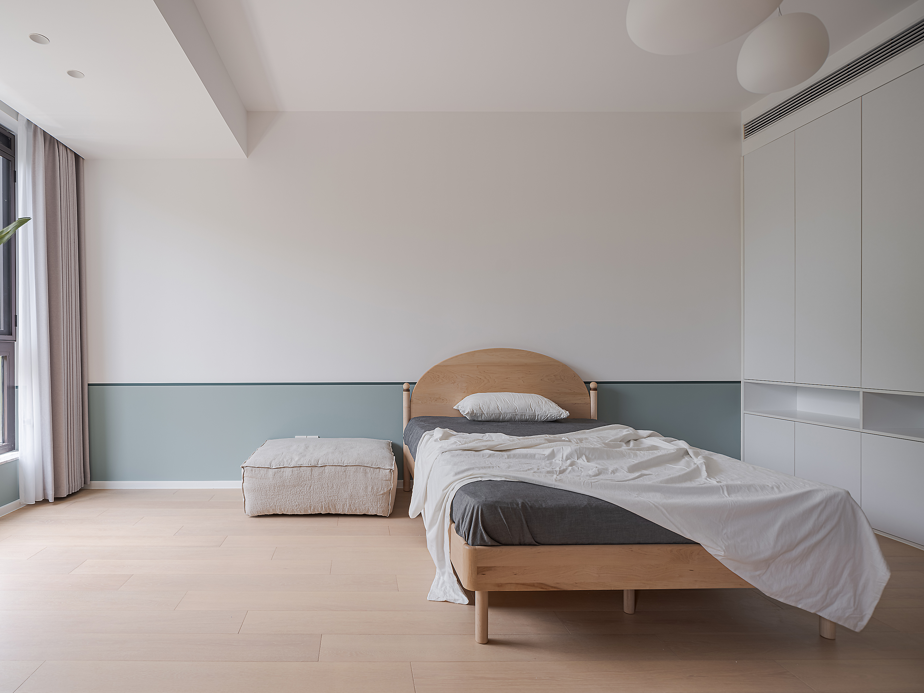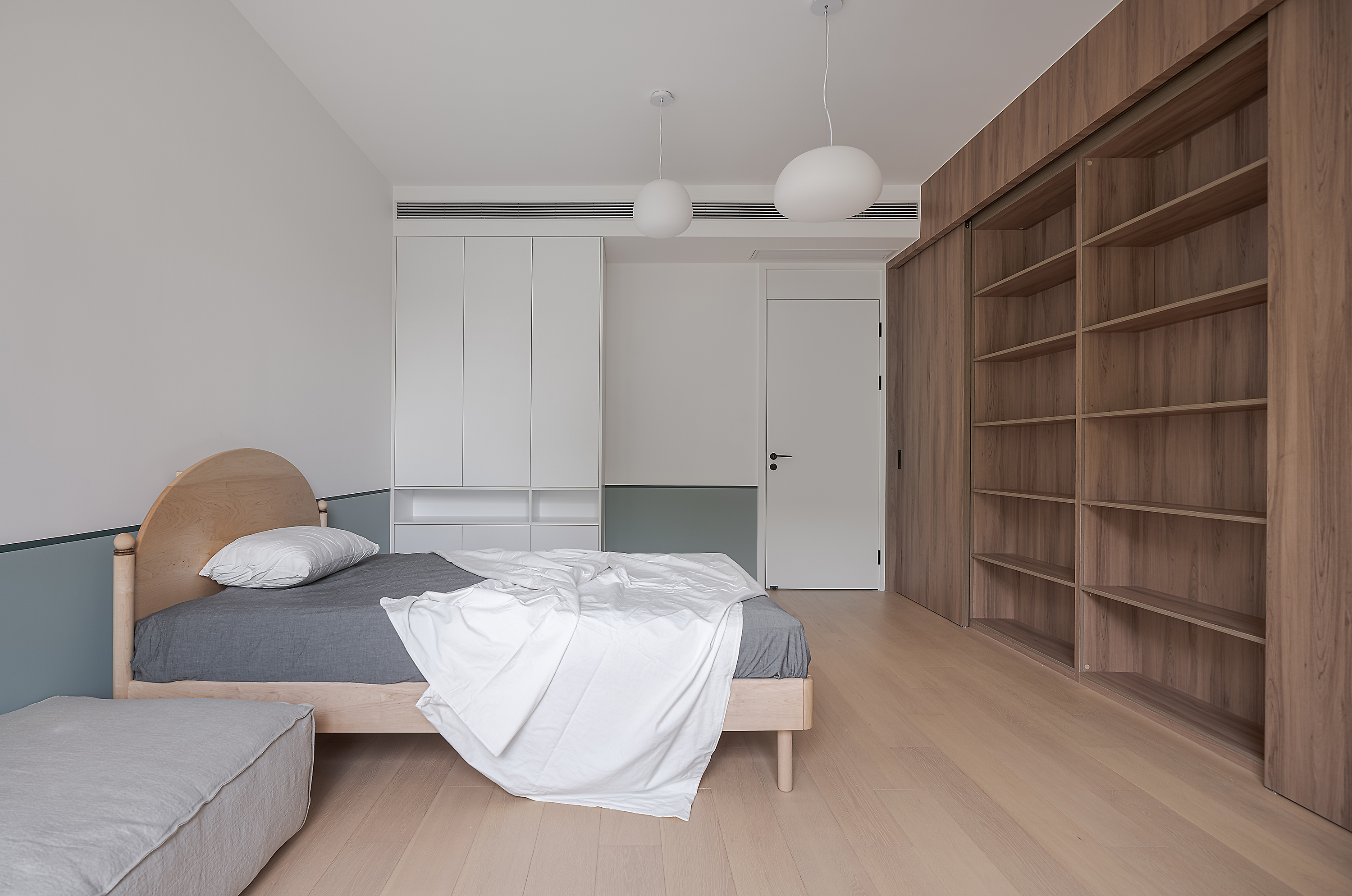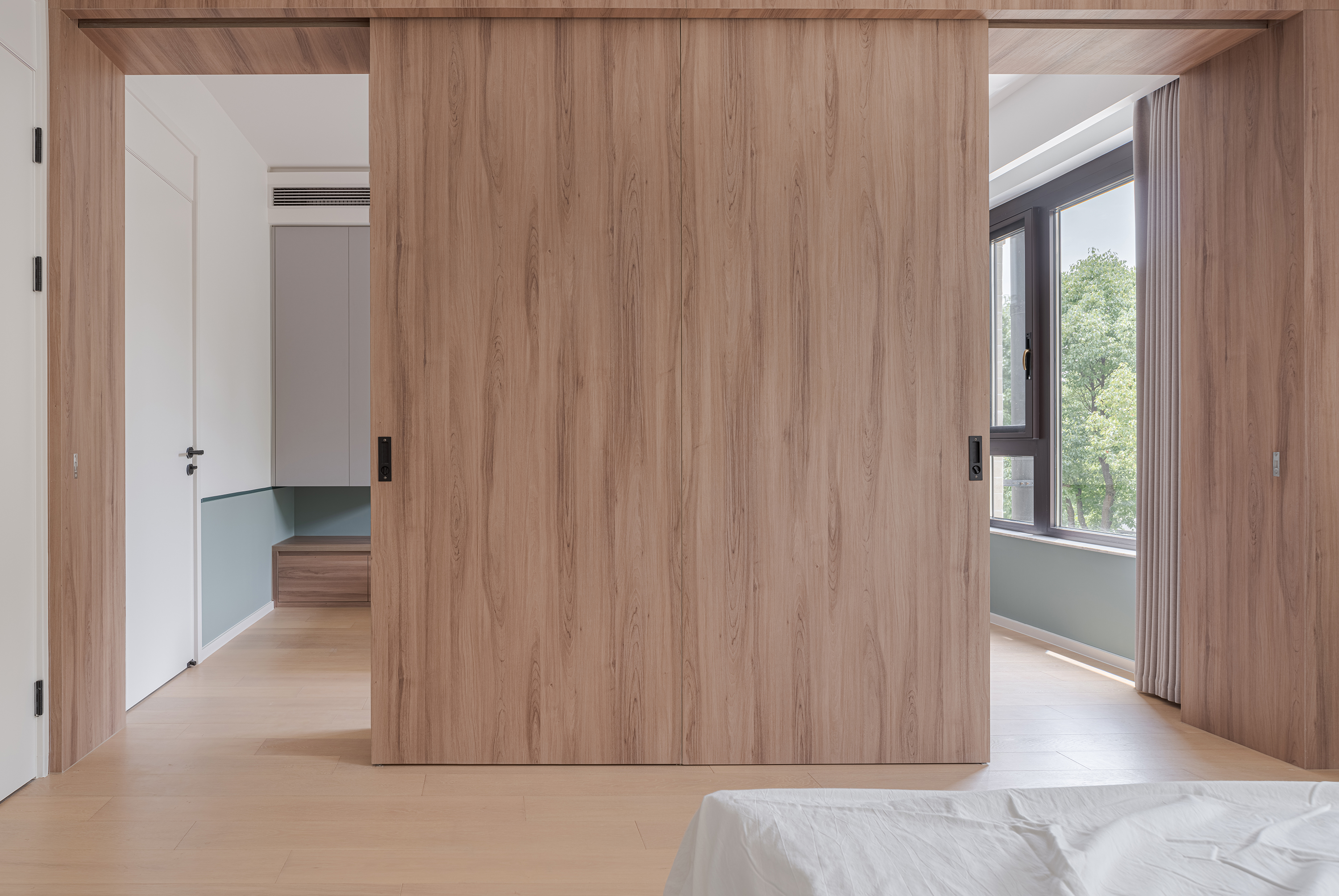 3. 把长辈房和儿童房放在一起,用两扇移门隔开,满足当下长辈照顾小孩的需求,也满足了孩子长大后,长辈搬离,使两个房间作为一个套房使用的功能。