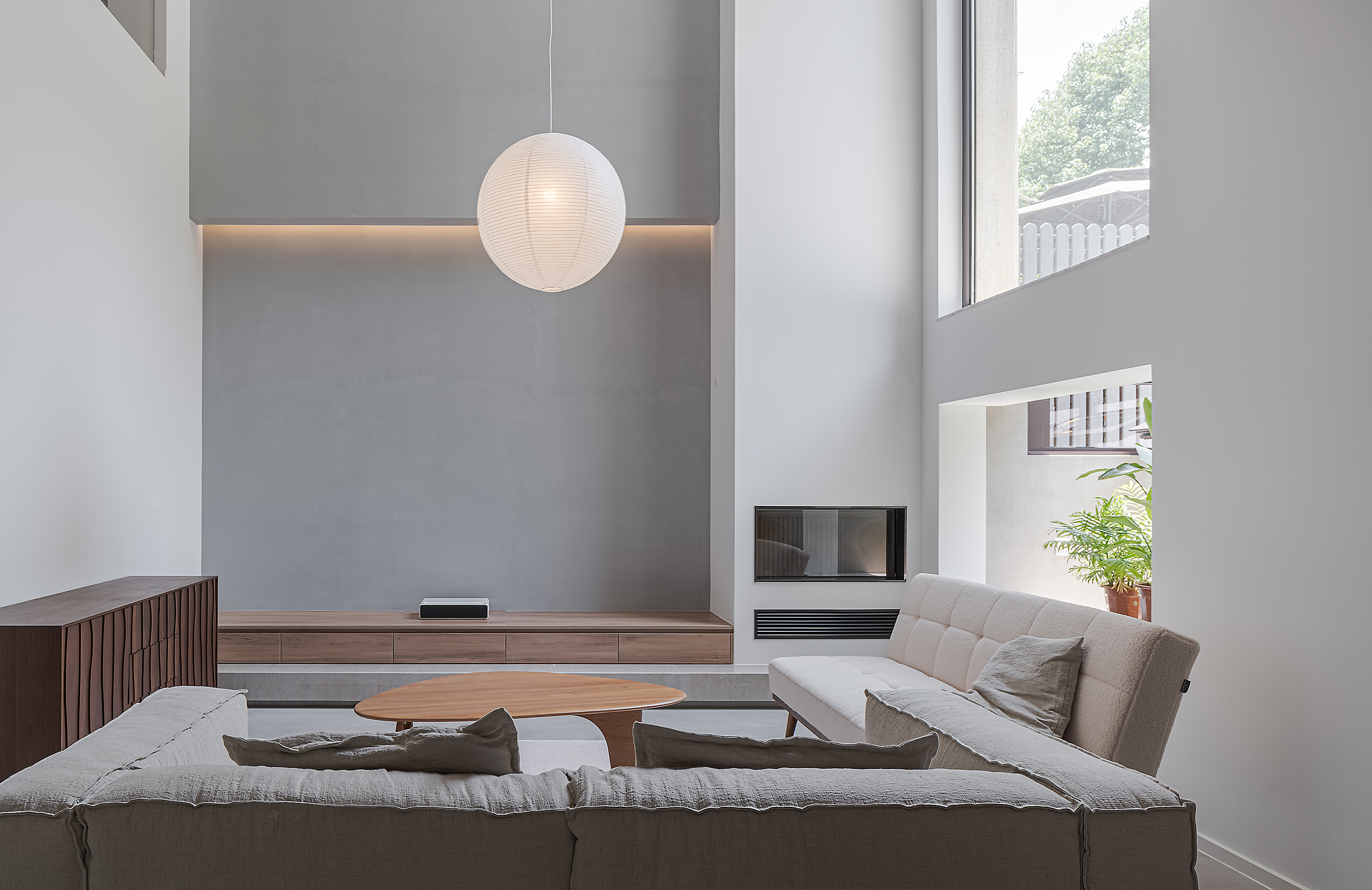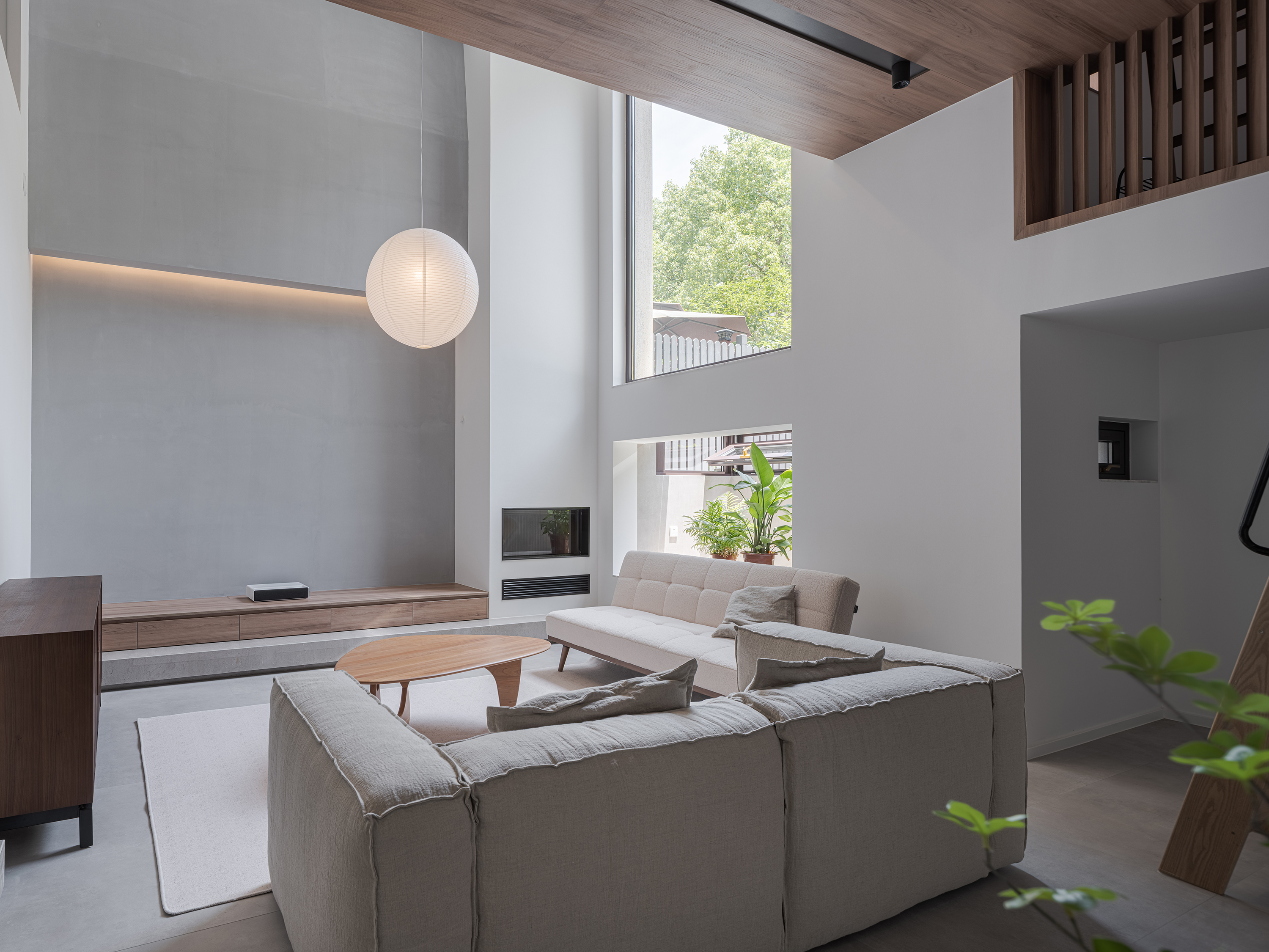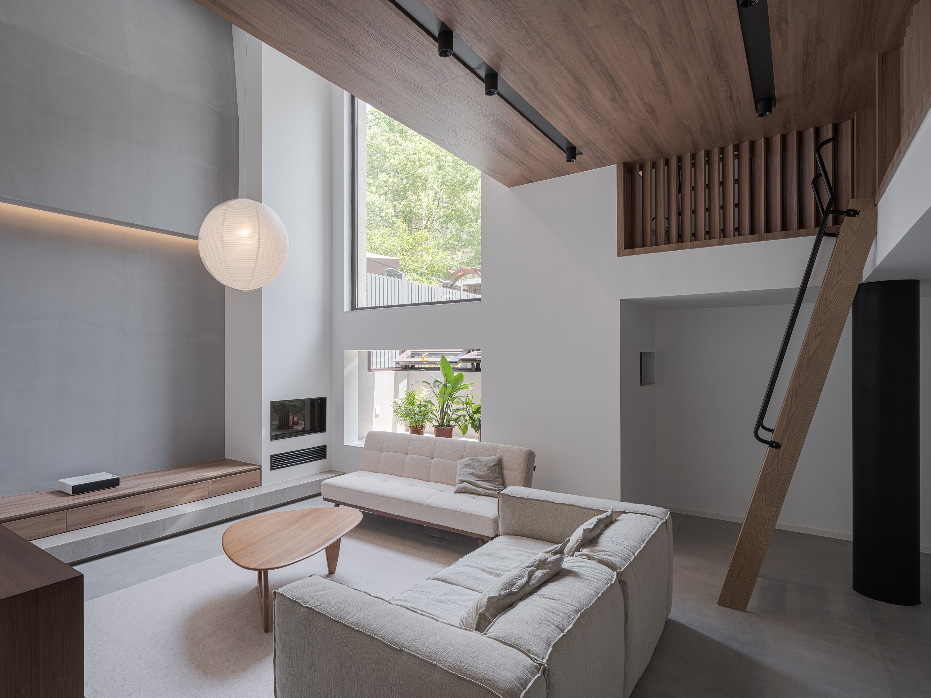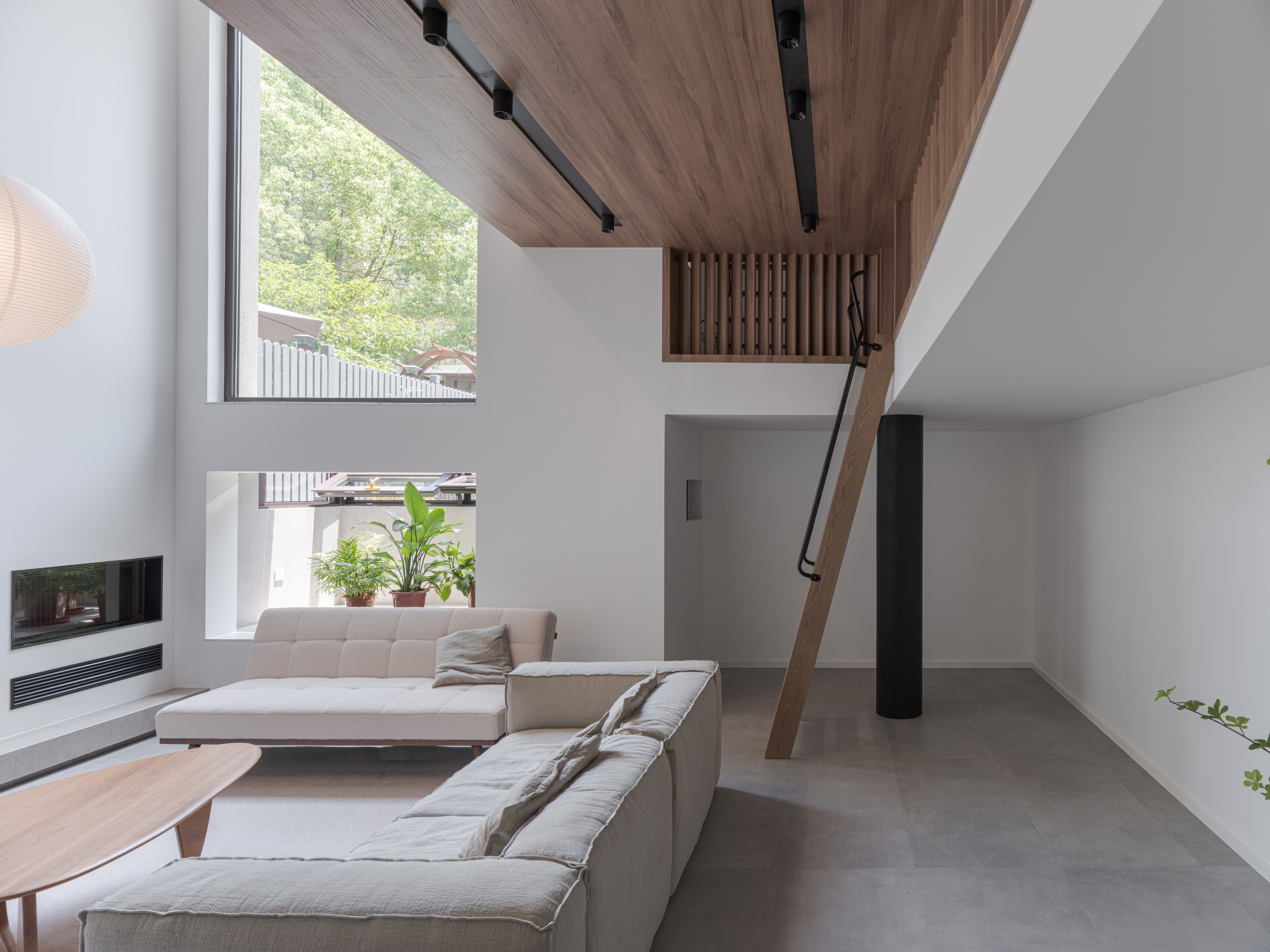 1. 地下室层高仅两米,且采光通风皆受限,我们于是打开了一楼的地面,把原地下室立面上并入了一楼,形成一个拥有超高挑空空间的客厅,采光等问题顺势得到解决。