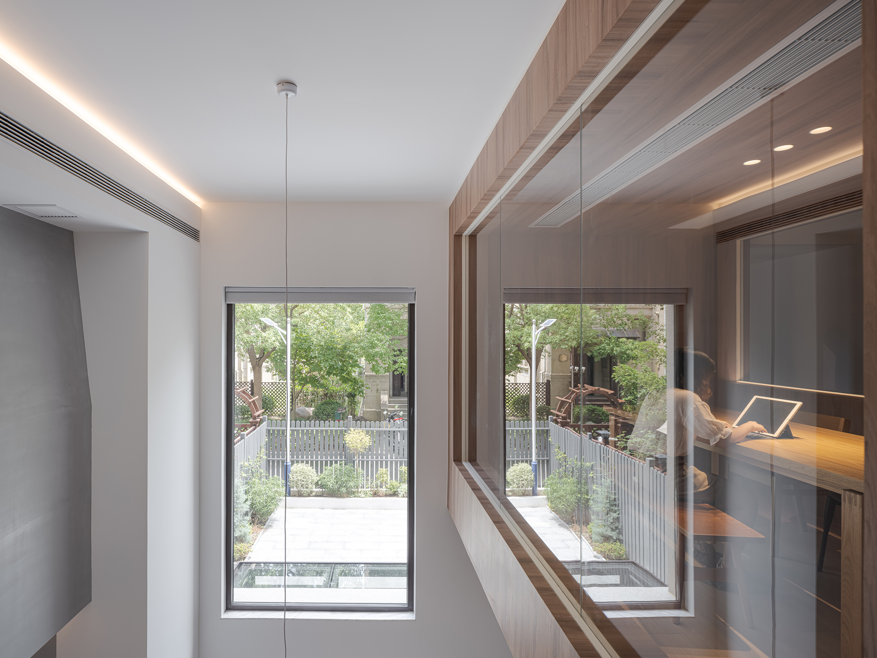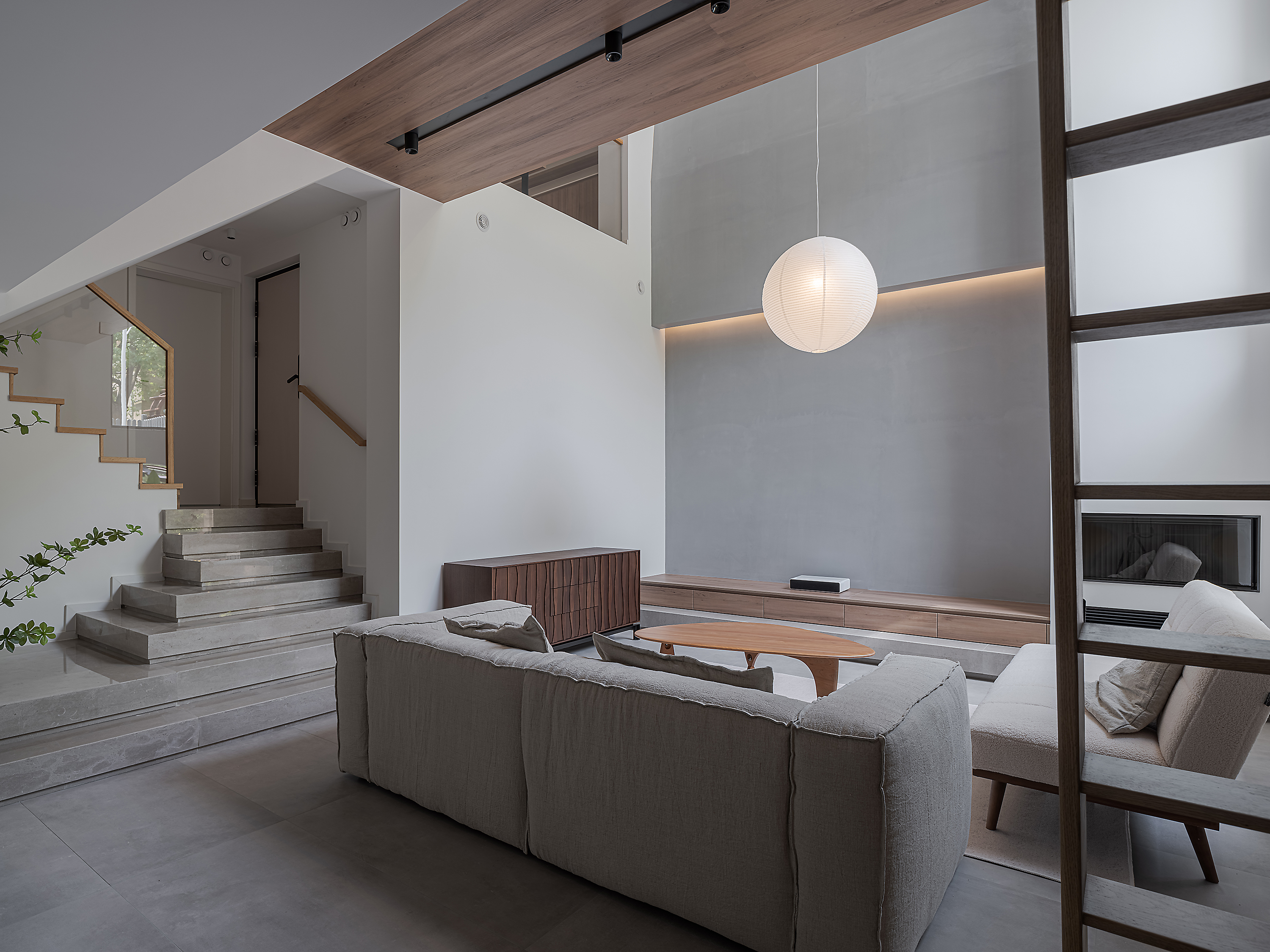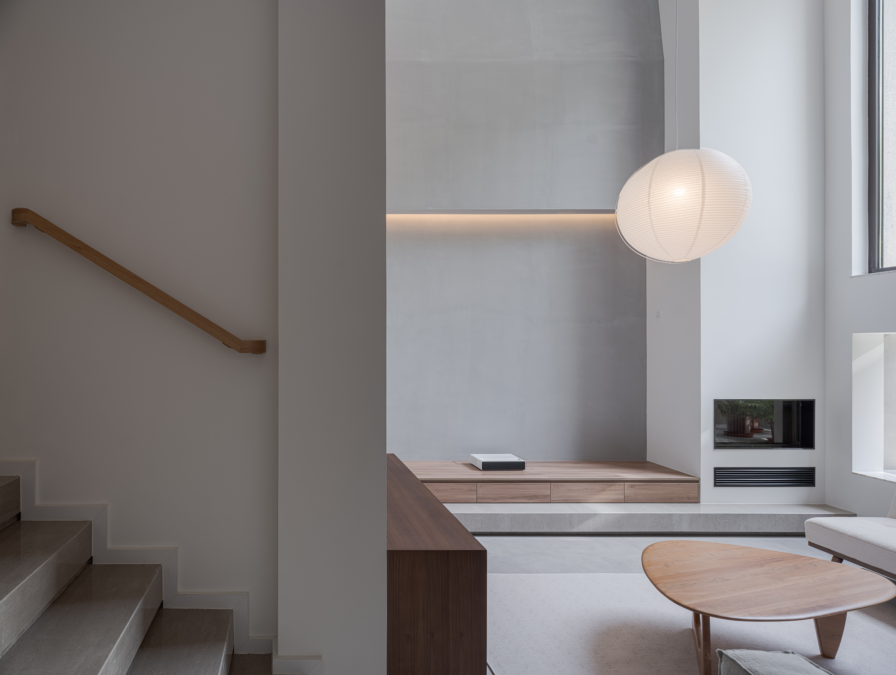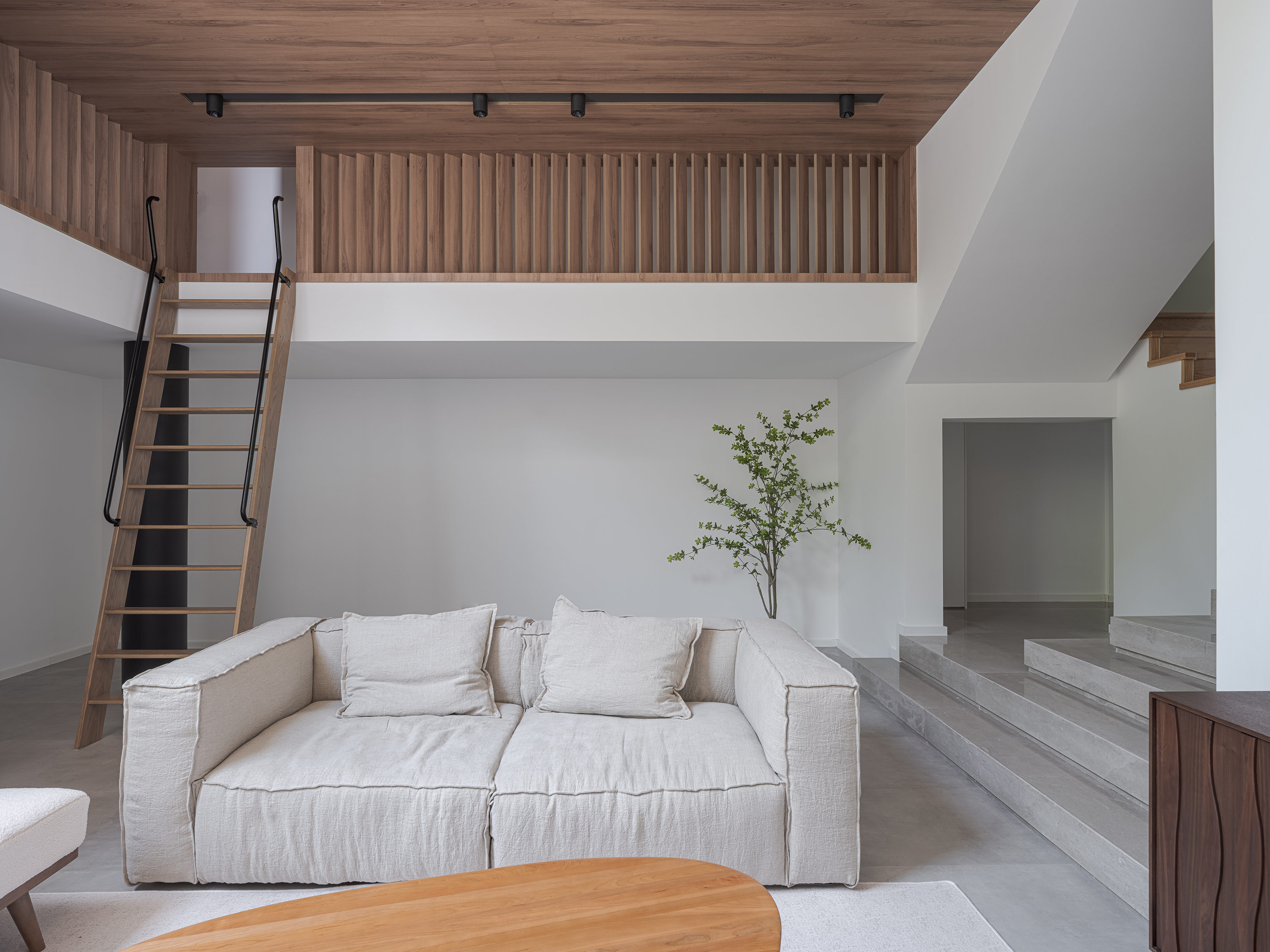 1. 地下室层高仅两米,且采光通风皆受限,我们于是打开了一楼的地面,把原地下室立面上并入了一楼,形成一个拥有超高挑空空间的客厅,采光等问题顺势得到解决。