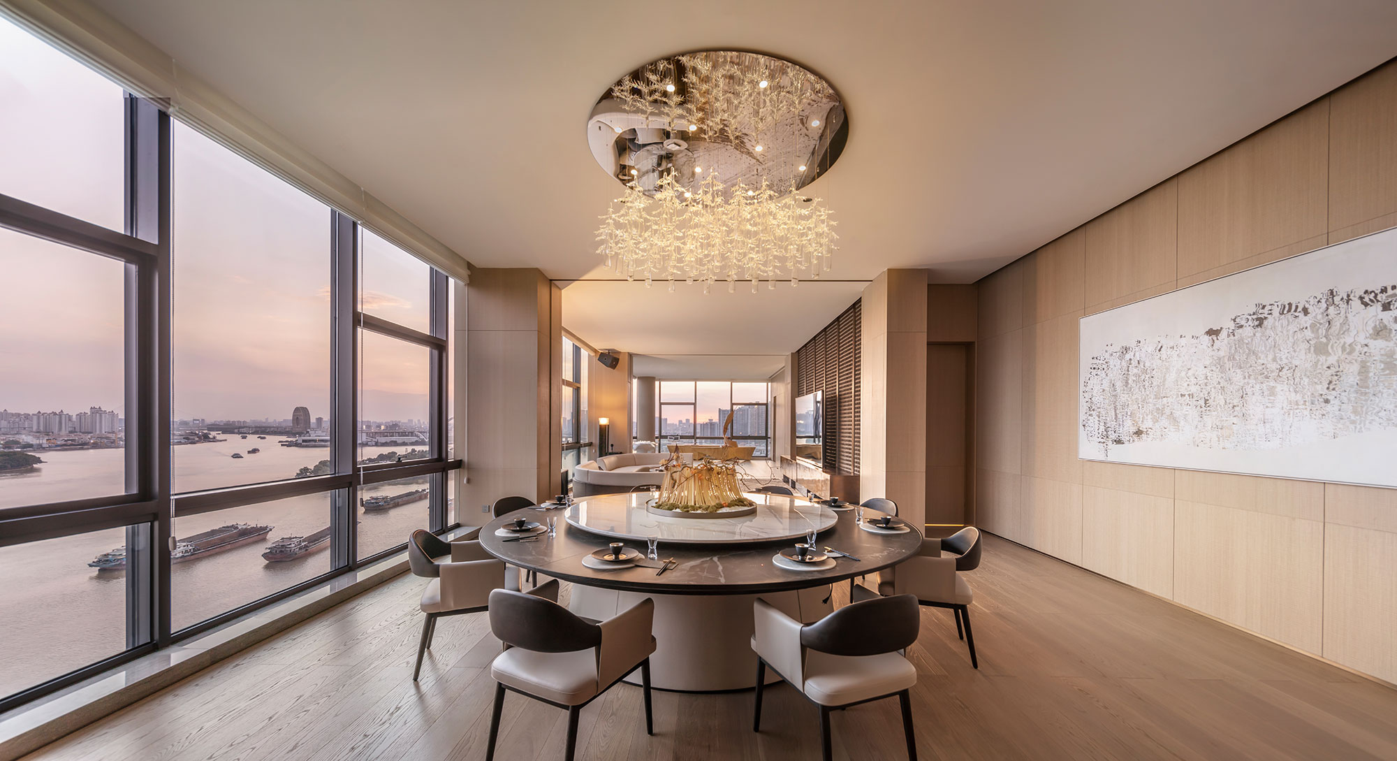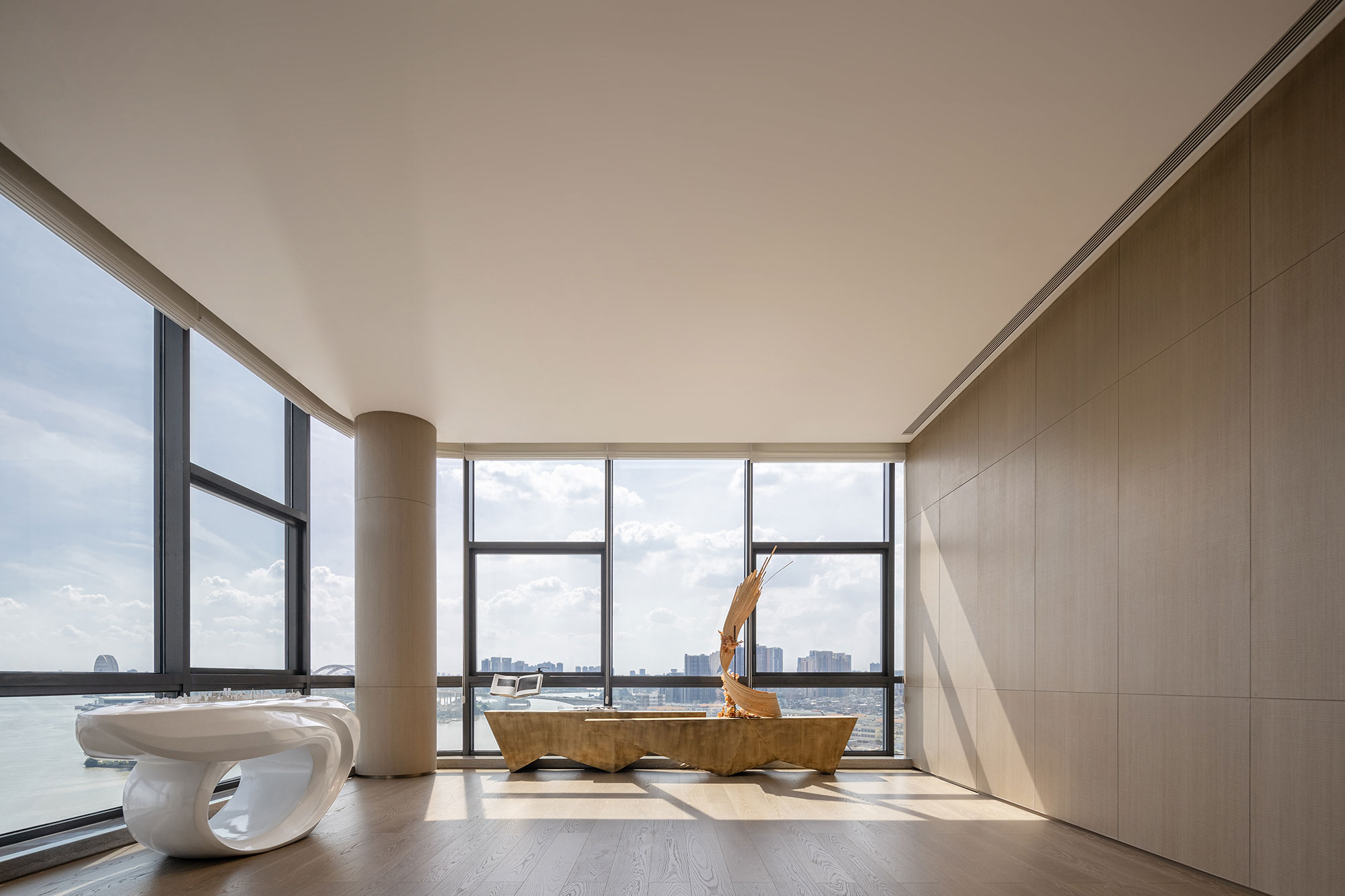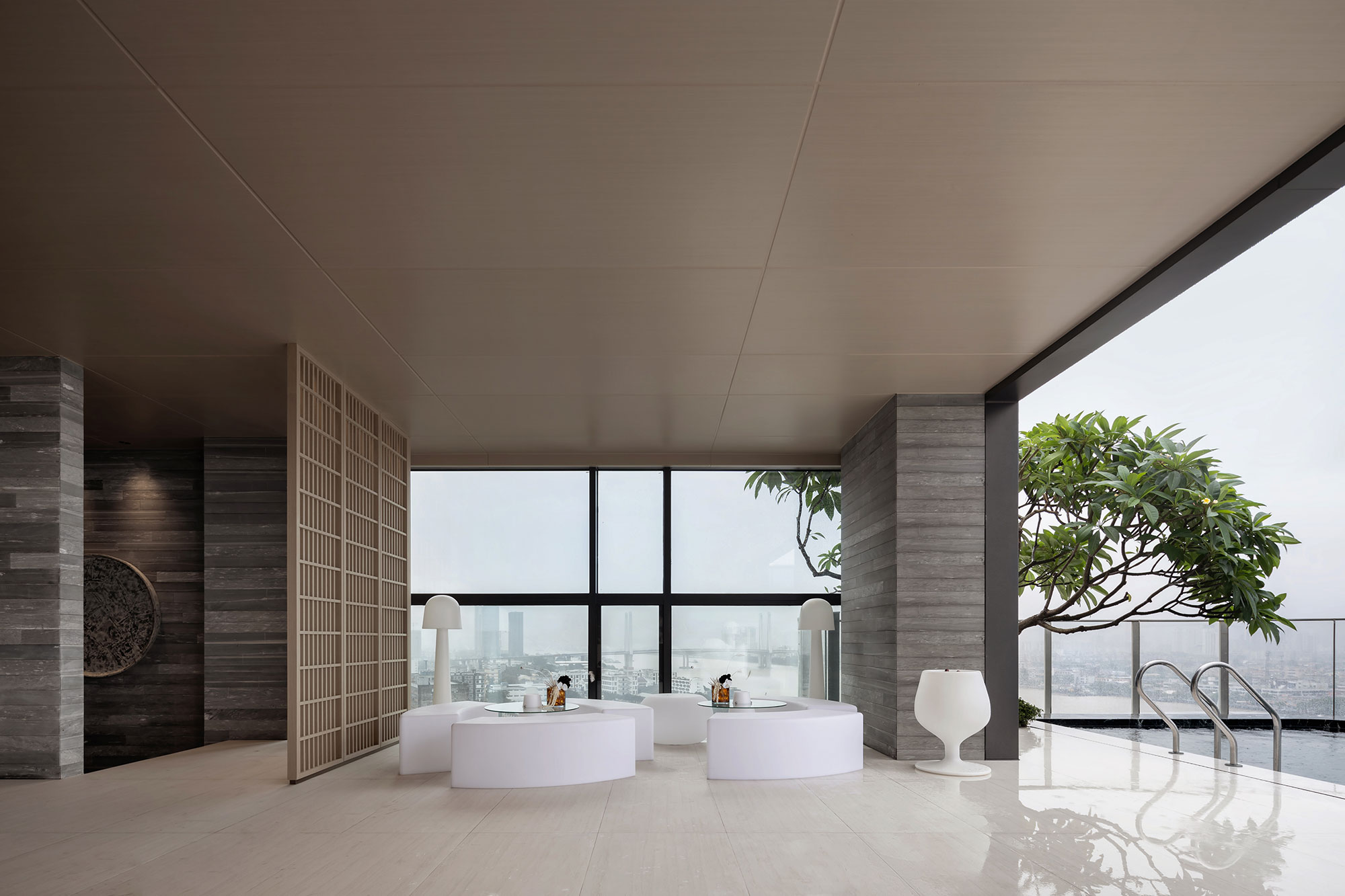 空间布局:在窗外的无界景致与当代空间艺术的相映中,藏纳的尽是顶流圈层的审美品味与先锋意识。游走于其间,无论高低尺度、纯木材质与弧线造型的精致布局,抑或细节处写意层层碧波的地毯、蜿蜒环绕的竹编装置,皆以尊贵轻奢的仪式感,投射出别致的国际化都市格调。