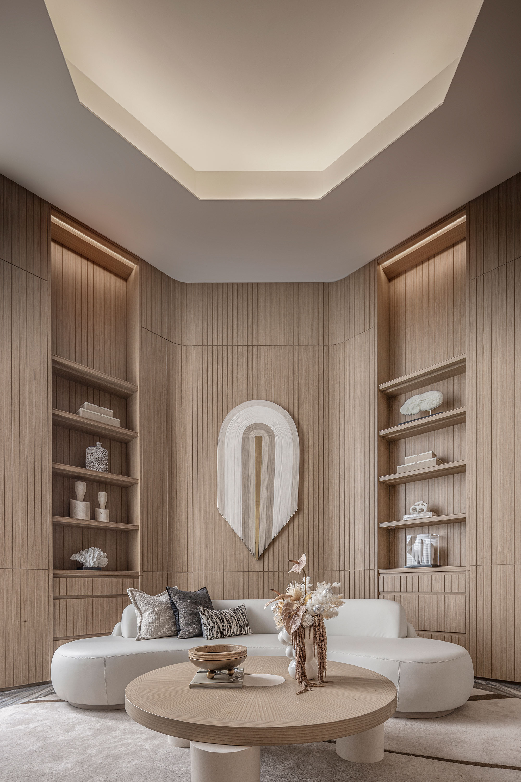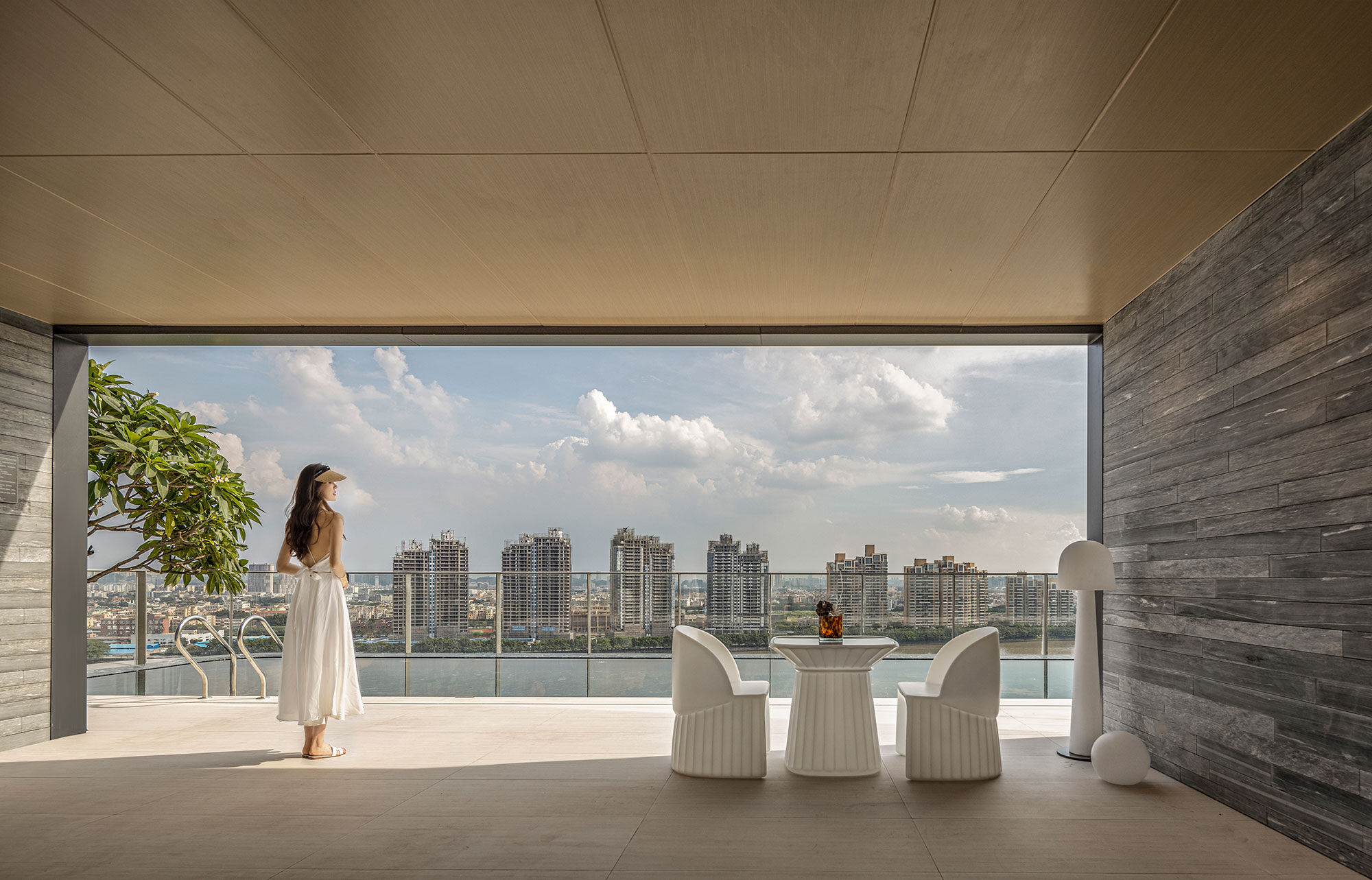 用户体验:“场景的营造,始于对艺术情境的创造,最终落点于规划生活、实现生活的根本目的。”在此,设计师化身为在场的体验者,以简白的艺术弧线,构设出优雅的泳池休息区。人围坐其间,人与自然和谐共生的国际滨江隐贵生活就此畅然开启。
