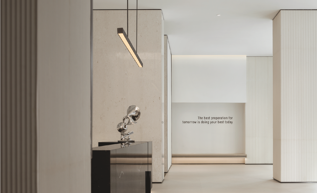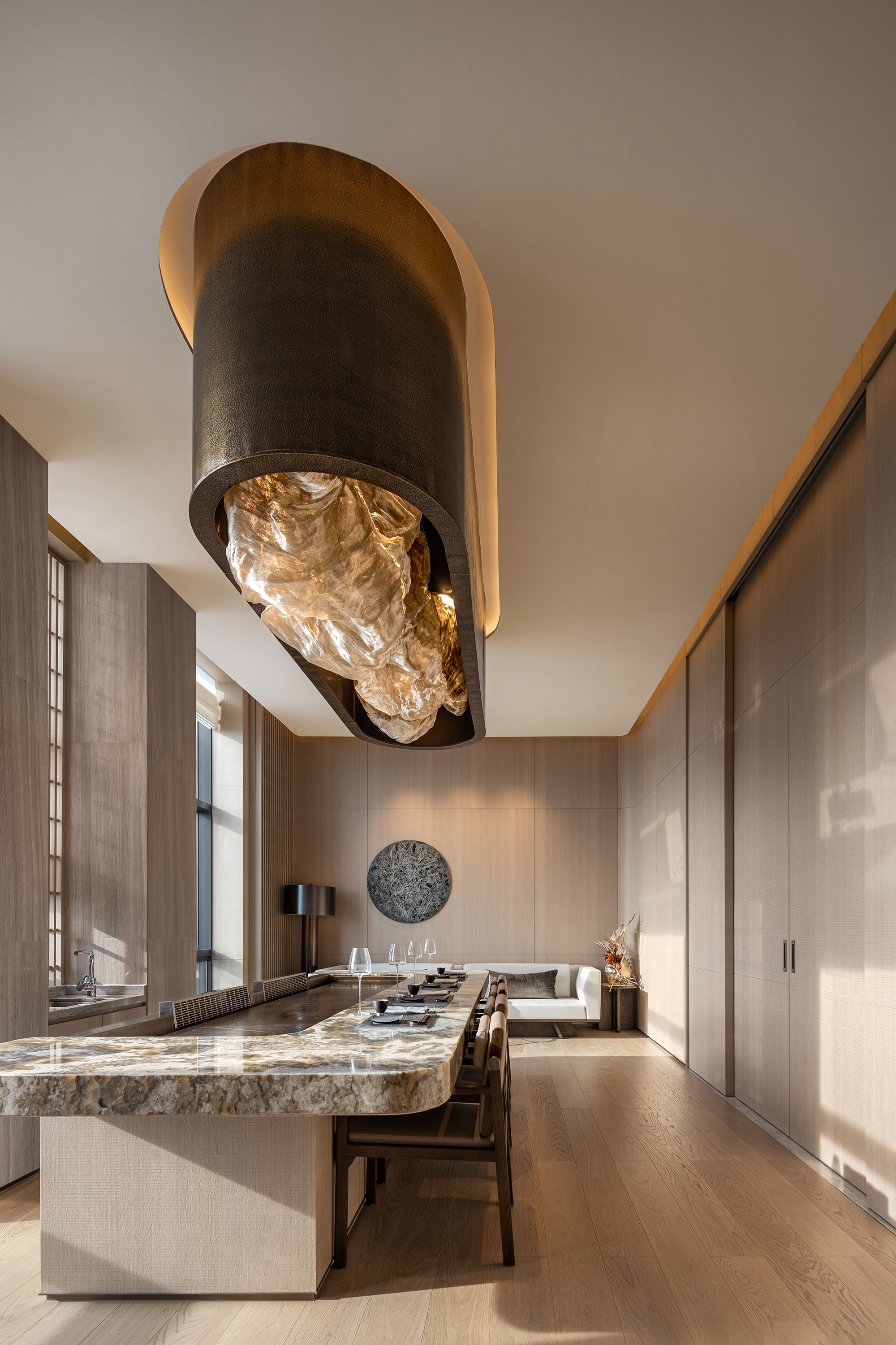 设计选材:落于空间气度的描摹中,一缕颇有手工编织质感的艺术灯饰,是对涌动江水的诗意取象,搭配粗粝的金属磨砂与通透的花纹大理石,诠释着奢华生活的极致体验。