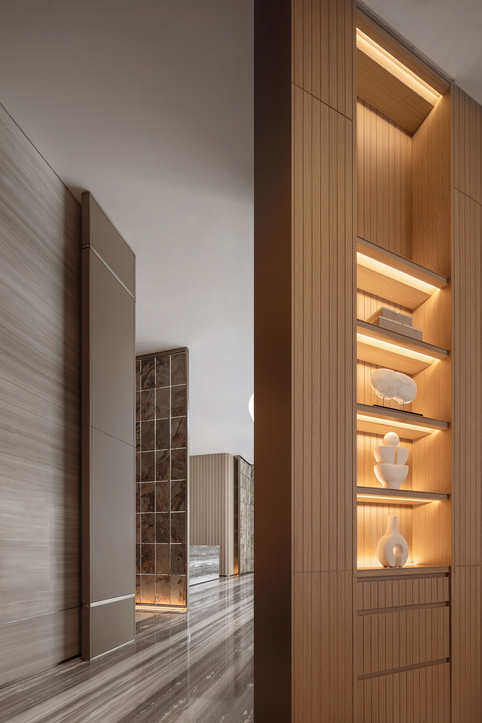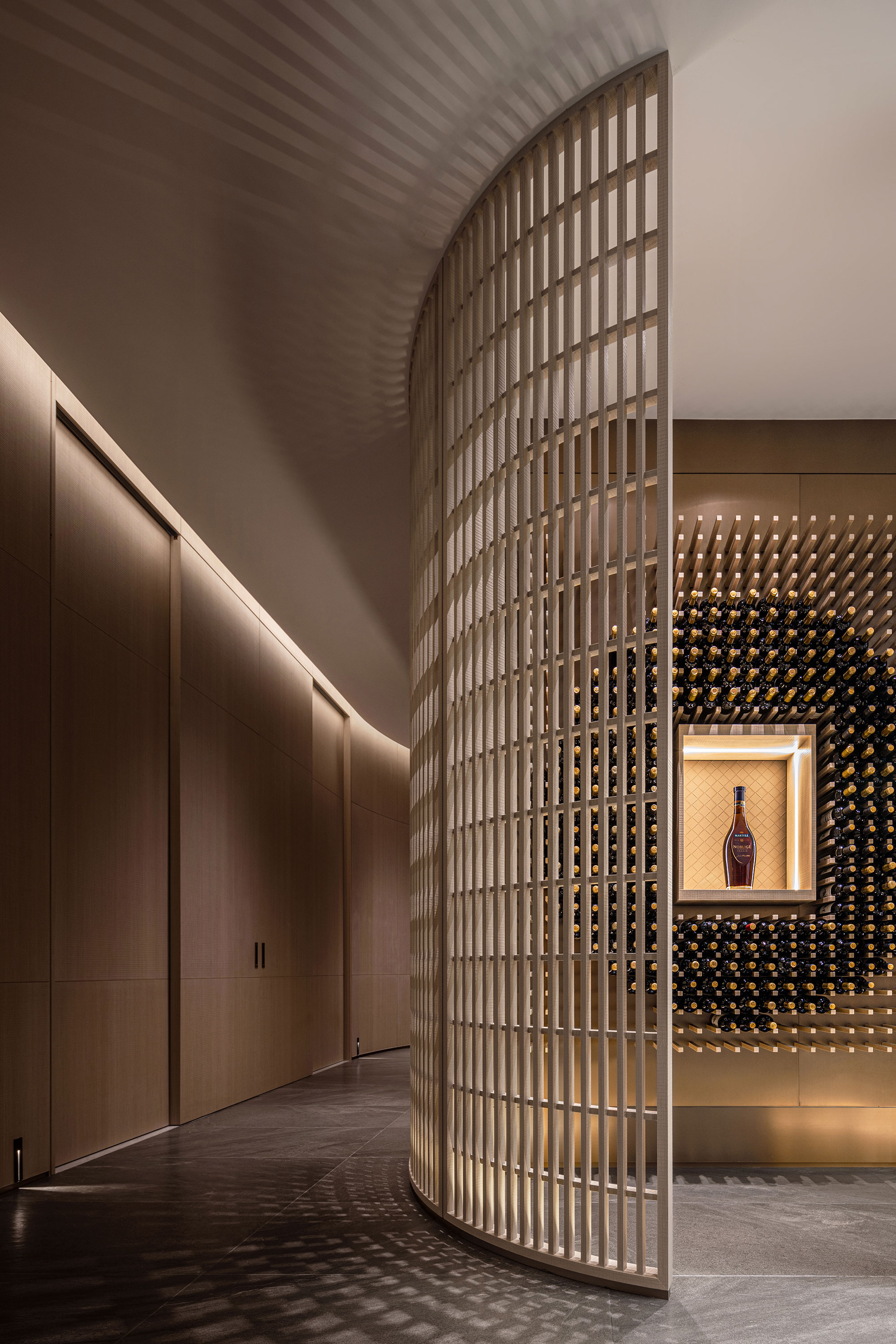 转入廊道,连通天花的木艺隔层,被布置为一处典雅的藏酒架。向内里探索,这里是高雅品味的映射,更作为空间的一条故事线,串联起圈层社交与洽谈商务的多重维度。 -