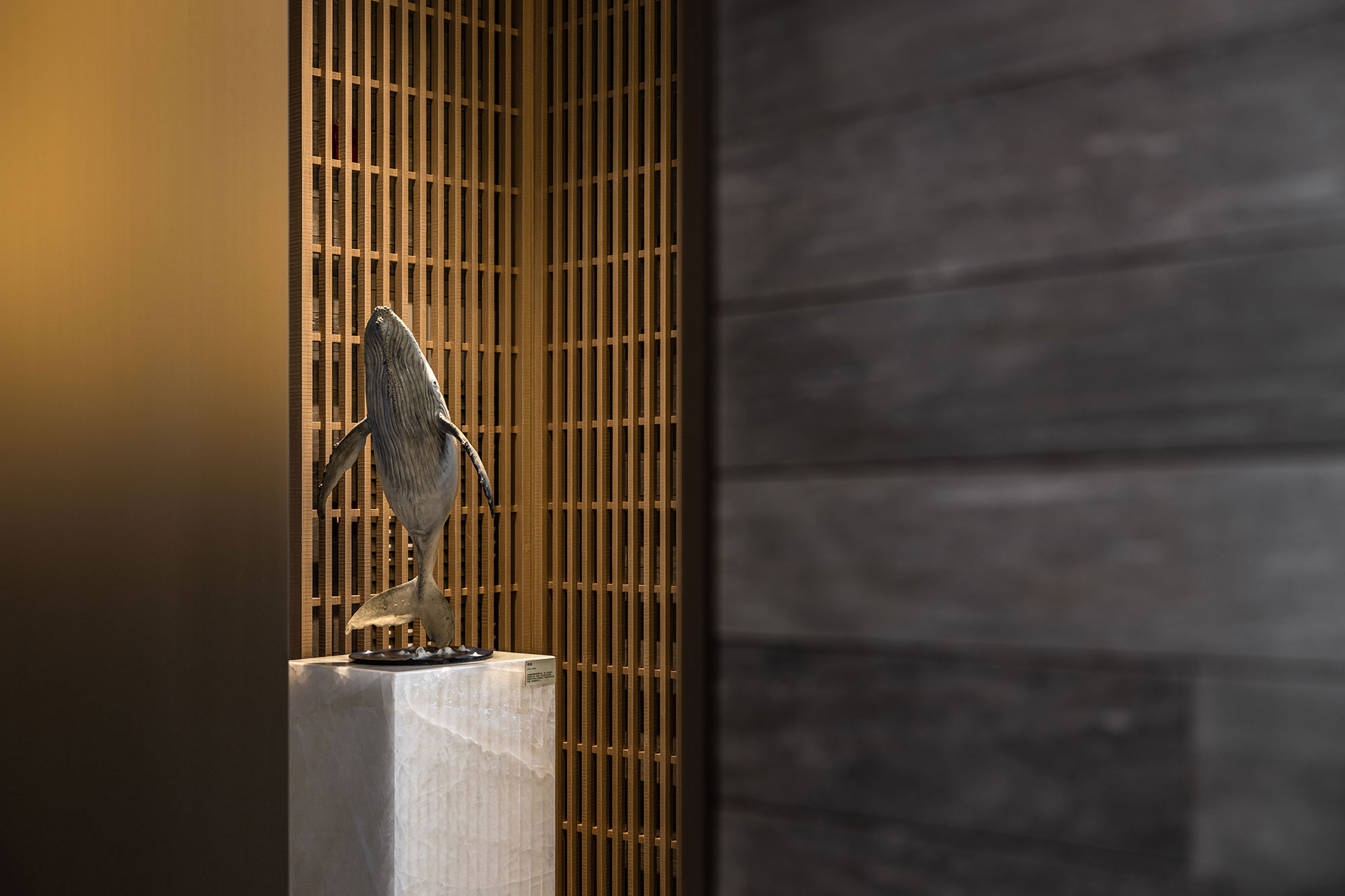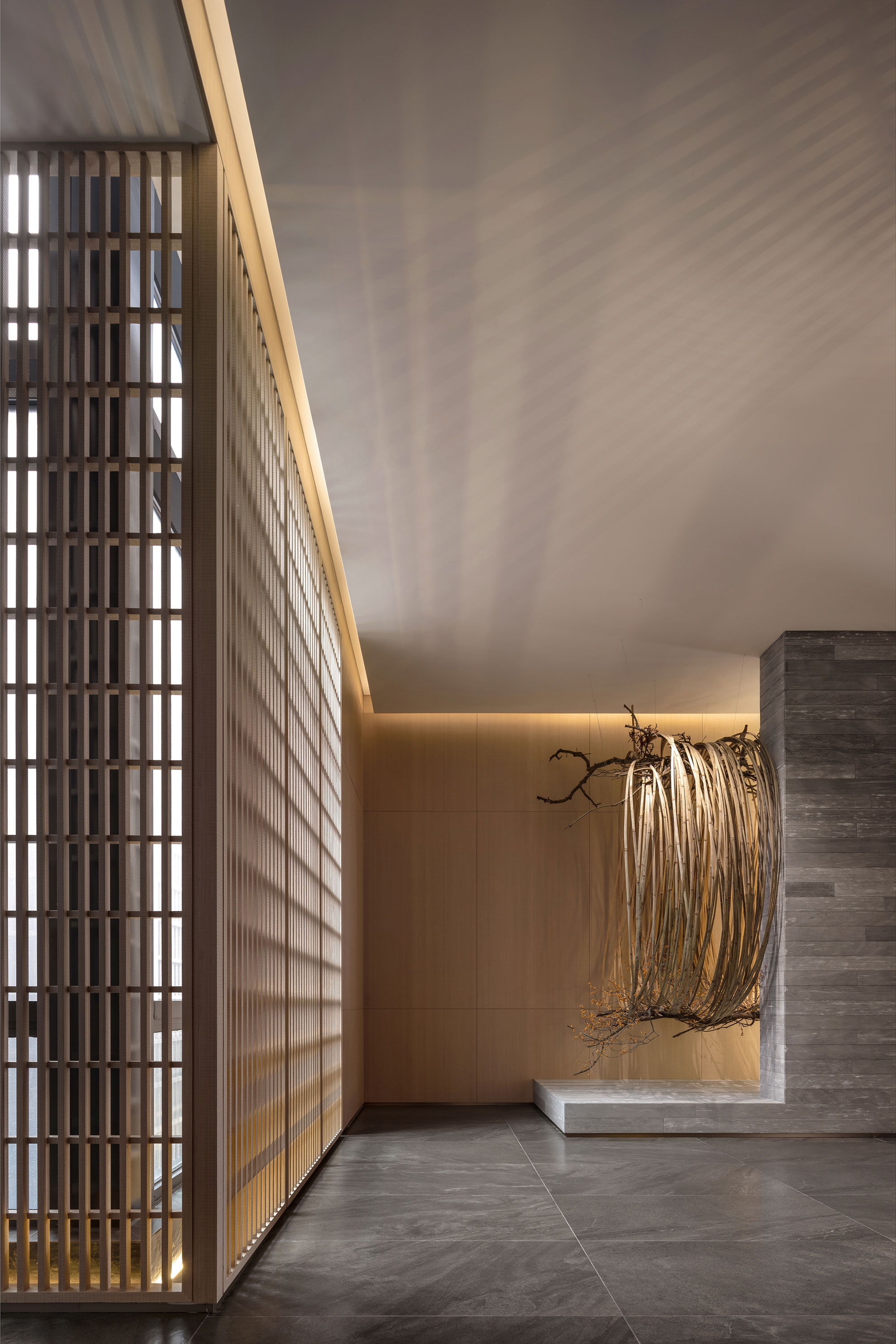 更衣区的设计以素白大理石与大面积木质为架构,加之暖黄光线的萦绕,与一隅的鱼形小品,使空间流动着温润简雅的人文意境氛围。当人置身于其中,便被尊贵优雅的仪式感与私密性包裹,沉浸于高奢而舒惬的体验。 -