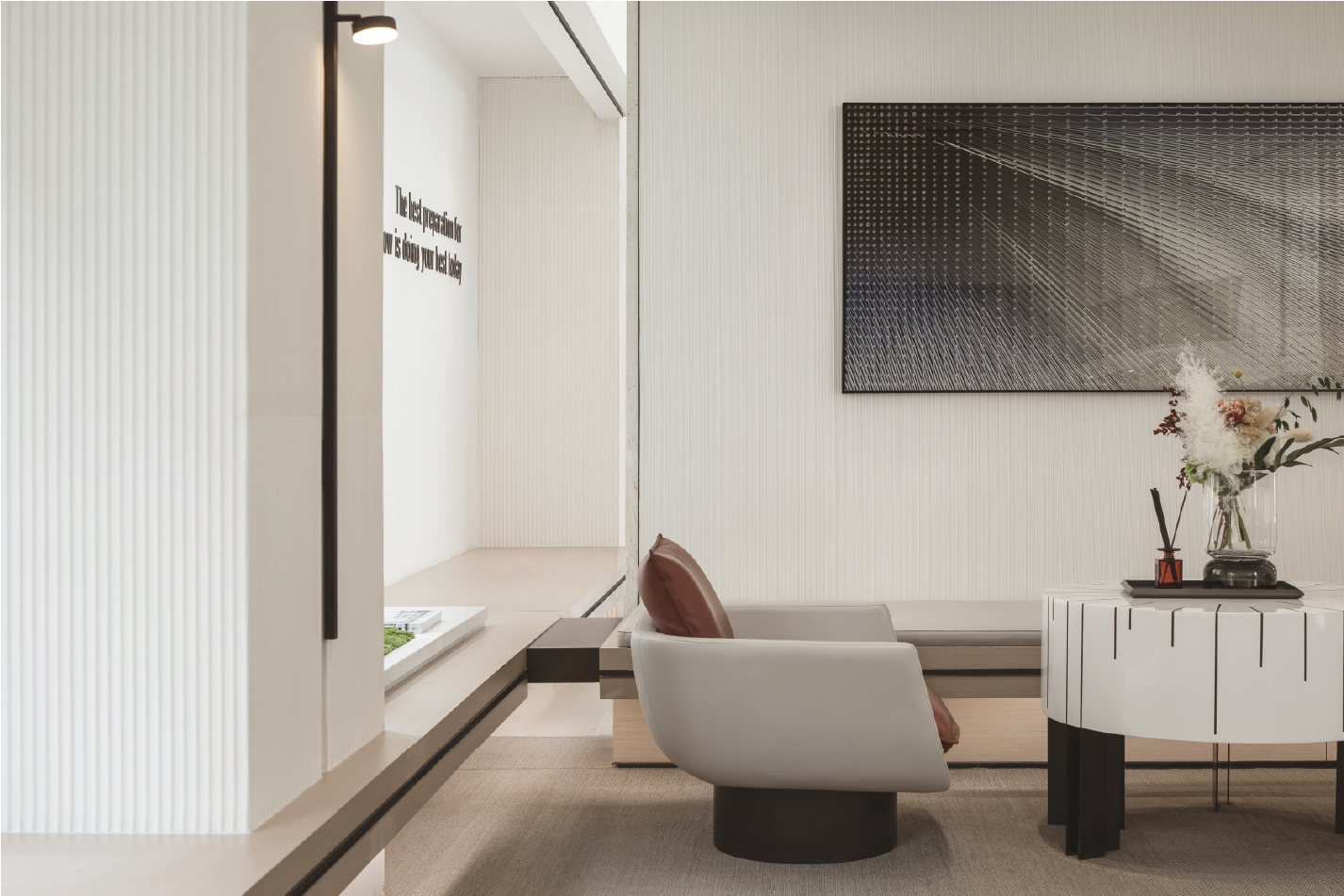 空间意境:从设计技法角度上讲,极简手法下的点线面构造,不止与几何、线条语素相对应,其中更关乎材质与工艺,它们的存在交织为一个整体,共同构就着空间的表现形式与观感。