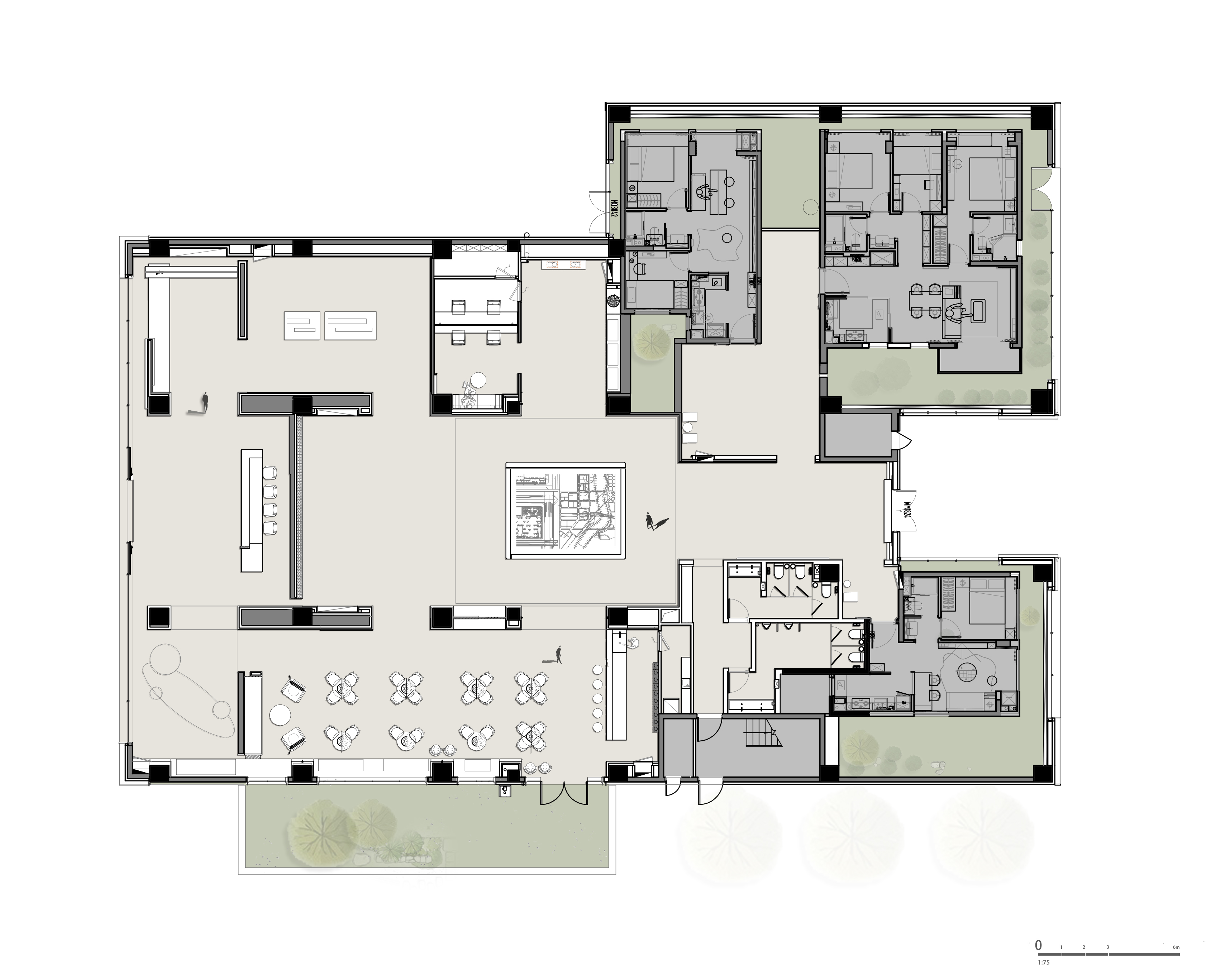 在这里,空间视觉被巧妙地贯连。在红棕这一暖色调与亮面大理石的铺叙上,点状灯光与自然光线的融合,令人们感觉到的不止有柔和的空间向度,还有窗外的一片葱茏绿意。 -