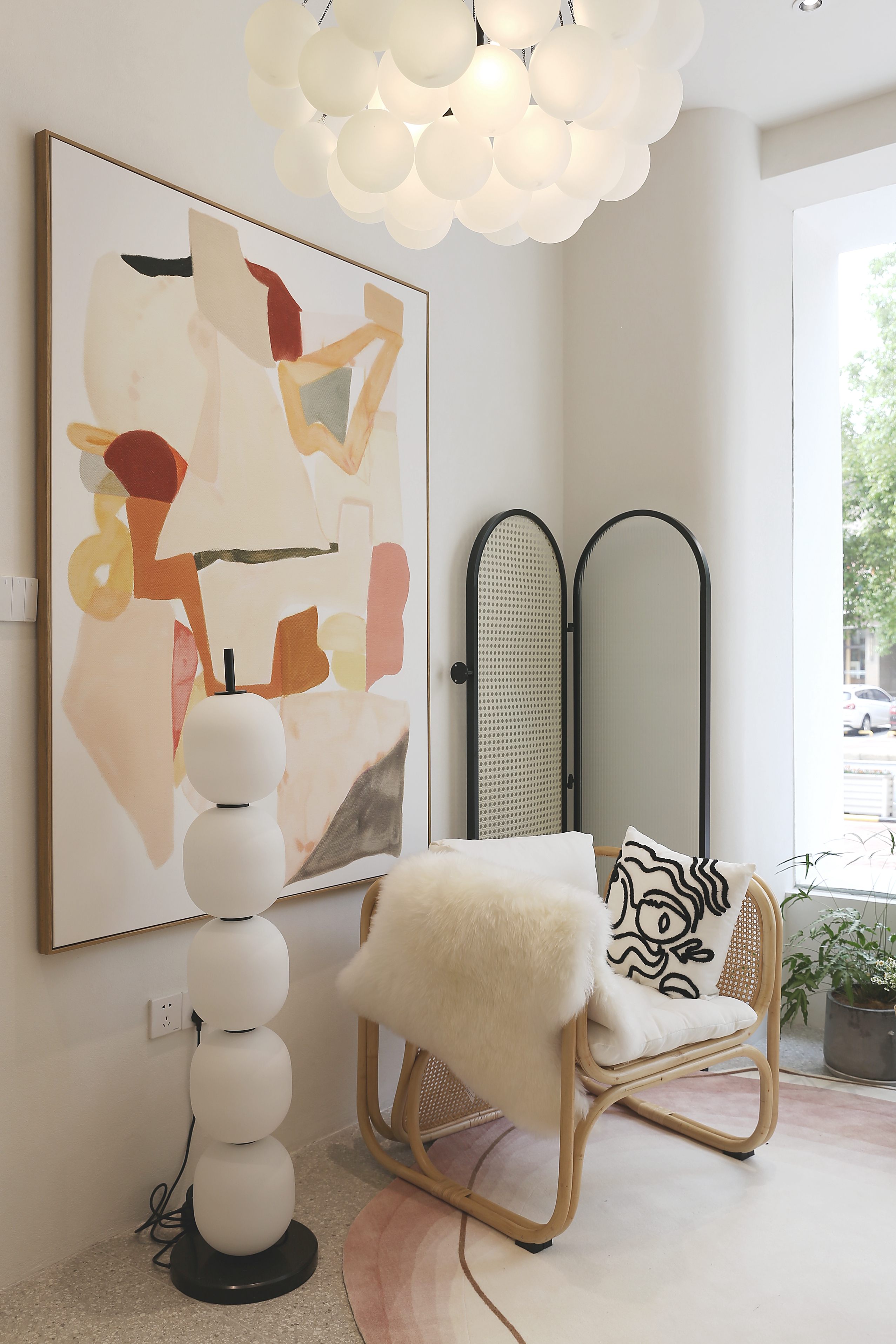 设计选材:本案摈弃了一切奢华昂贵的用材,也尽可能规避直线造型的尖锐和死板,只通过颜色、肌理、形状、和光来描绘自然美学空间的素雅特性。大面积运用的灰泥涂料,环保、价低,且呈现出的肌理质感恰到好处。低饱和度的奶茶色赋予空间温暖治愈的基调,自带高级感