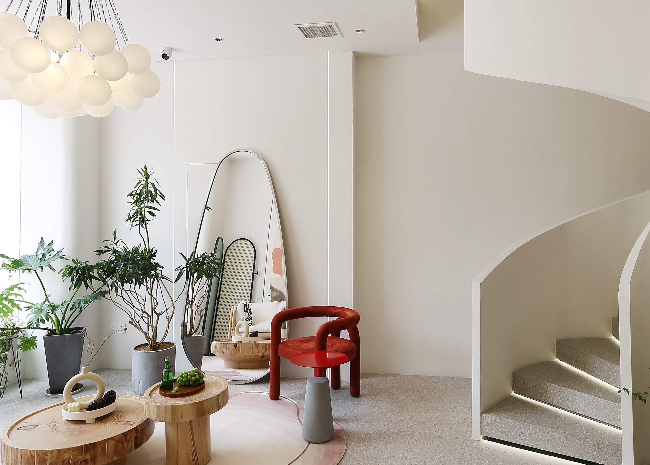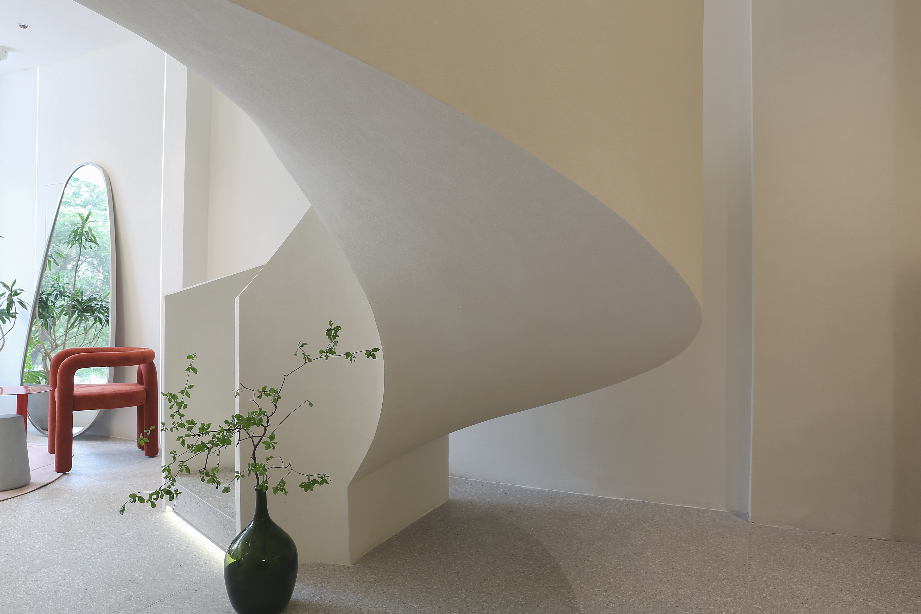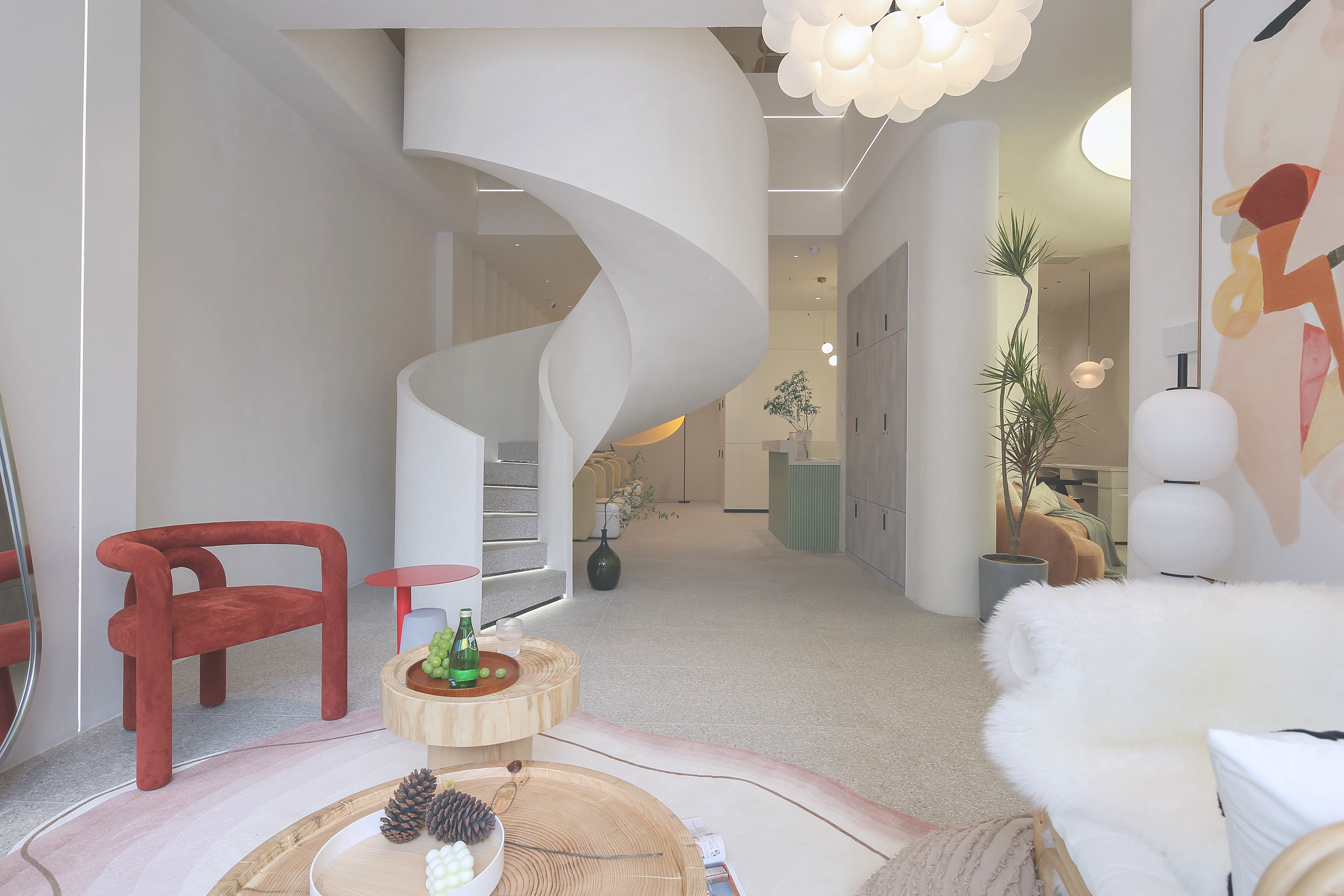 灵动的弧形与圆润的曲面元素由外至内 流畅的楼梯圆弧造型与拱形门洞 摒弃了直线造型的尖锐与死板 传达视觉空间的柔和与纯粹