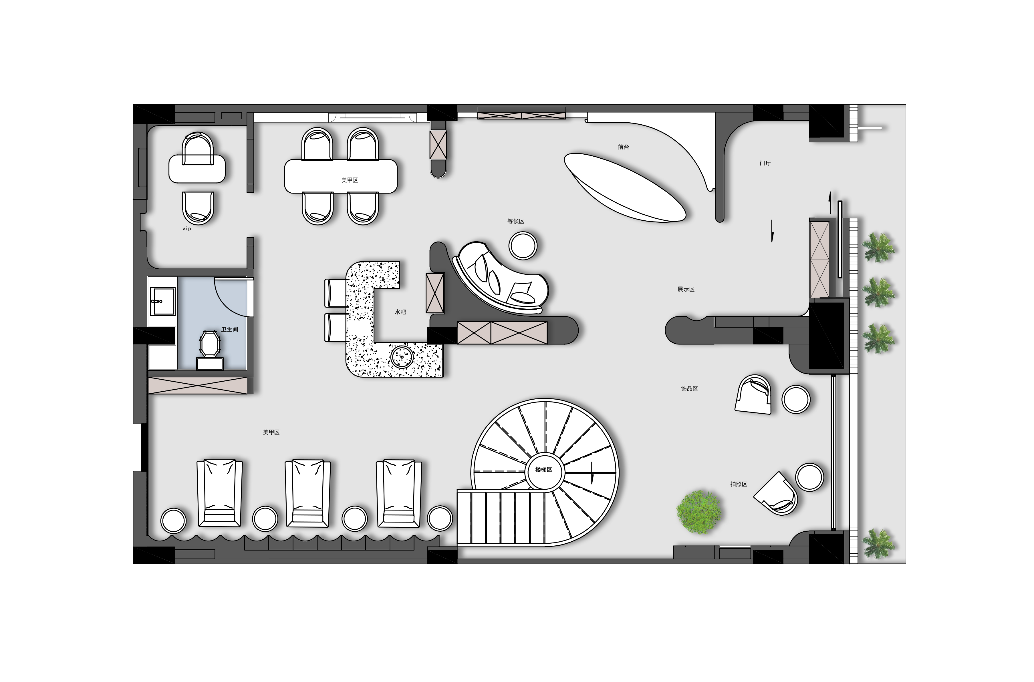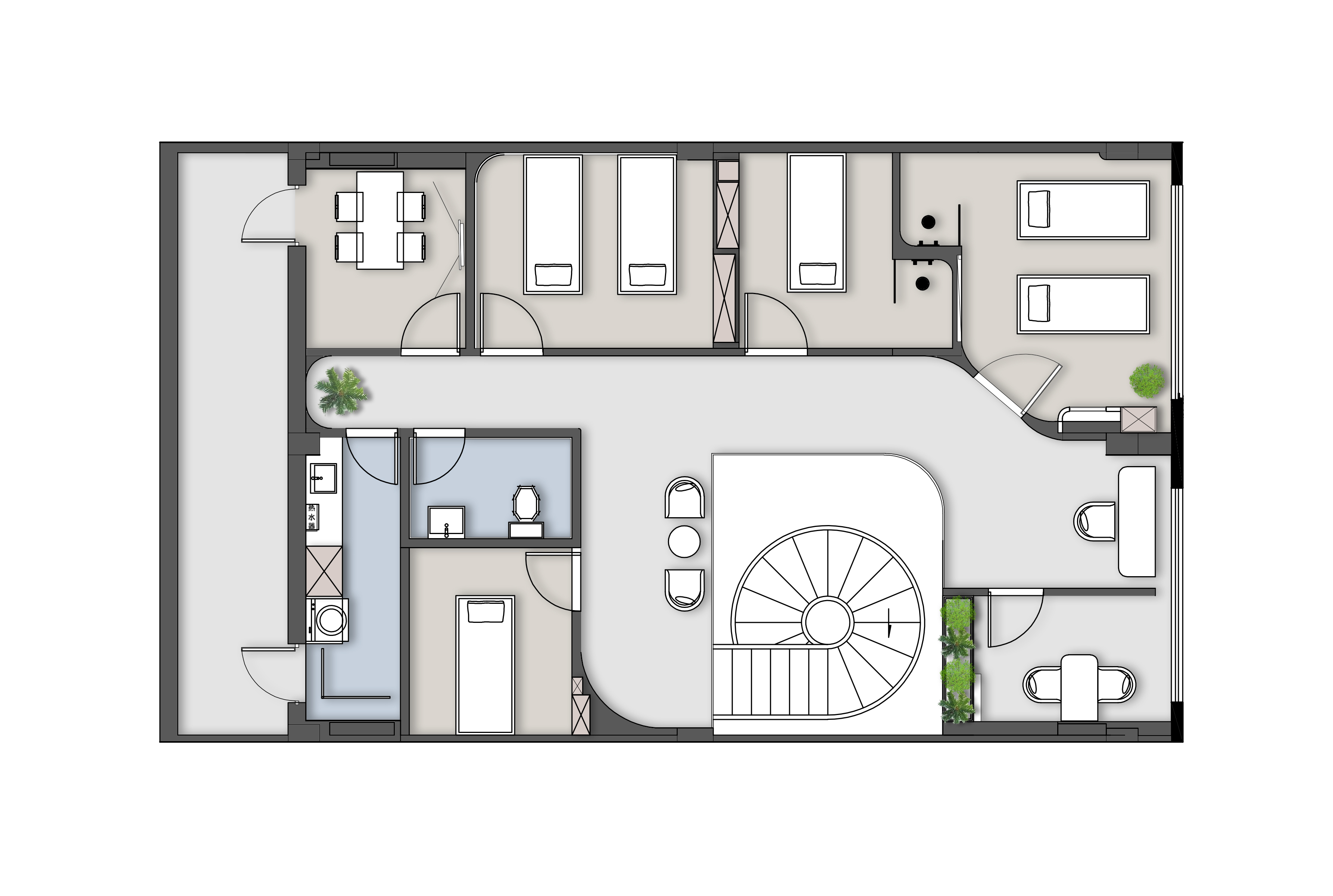 空间布局:本案空间上以旋转楼梯为造型及空间分隔的重点,塑造空间的整体性、建构性和对话性,旋转楼梯造型带来延伸视觉的错觉,在光影作用下拉长空间纵深感,配合二楼顶面水波纹不锈钢材质,勾勒出虚实界面。弧形和曲面的元素由内至外,建构优雅的视觉印象,放大各个空间的视觉感官。