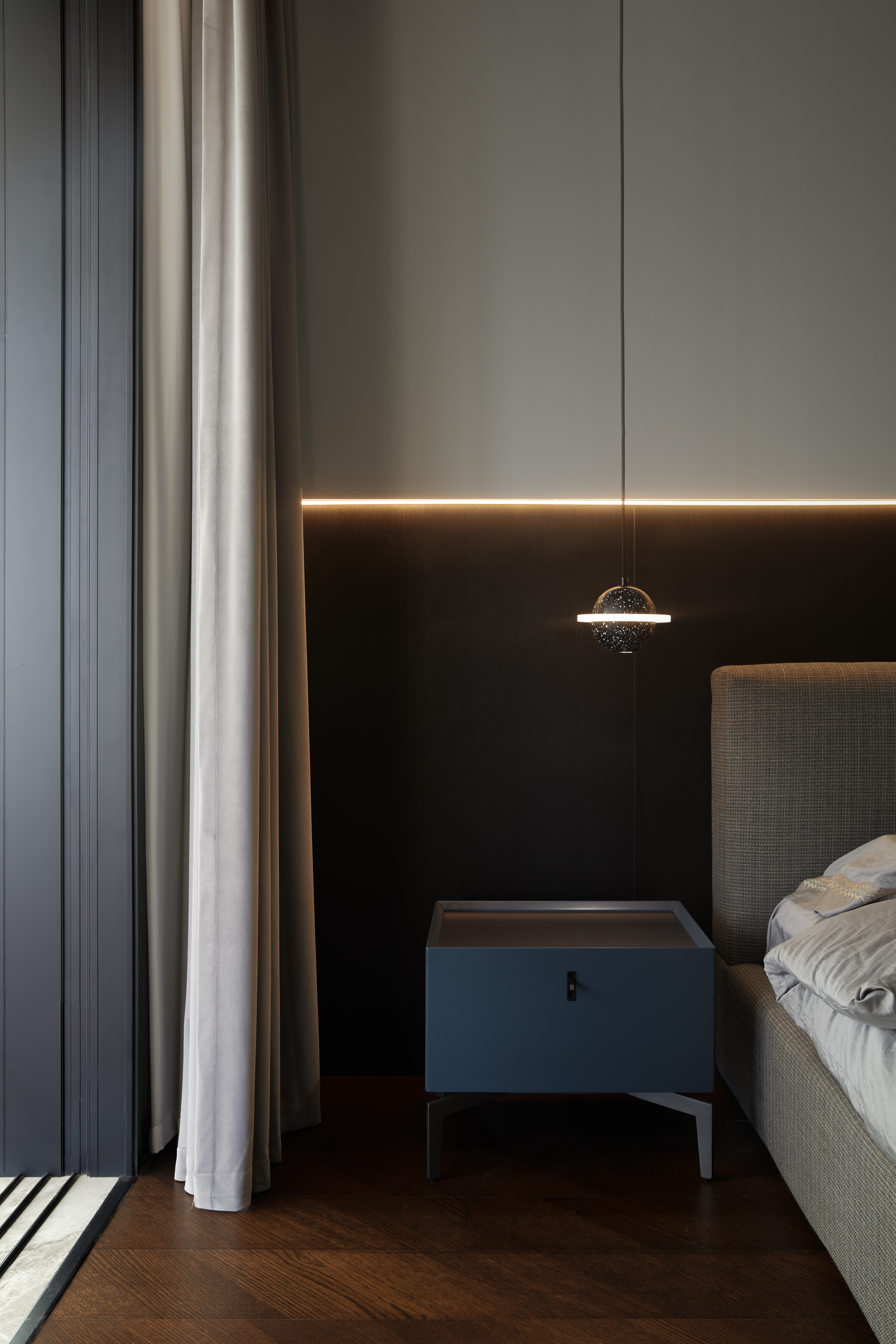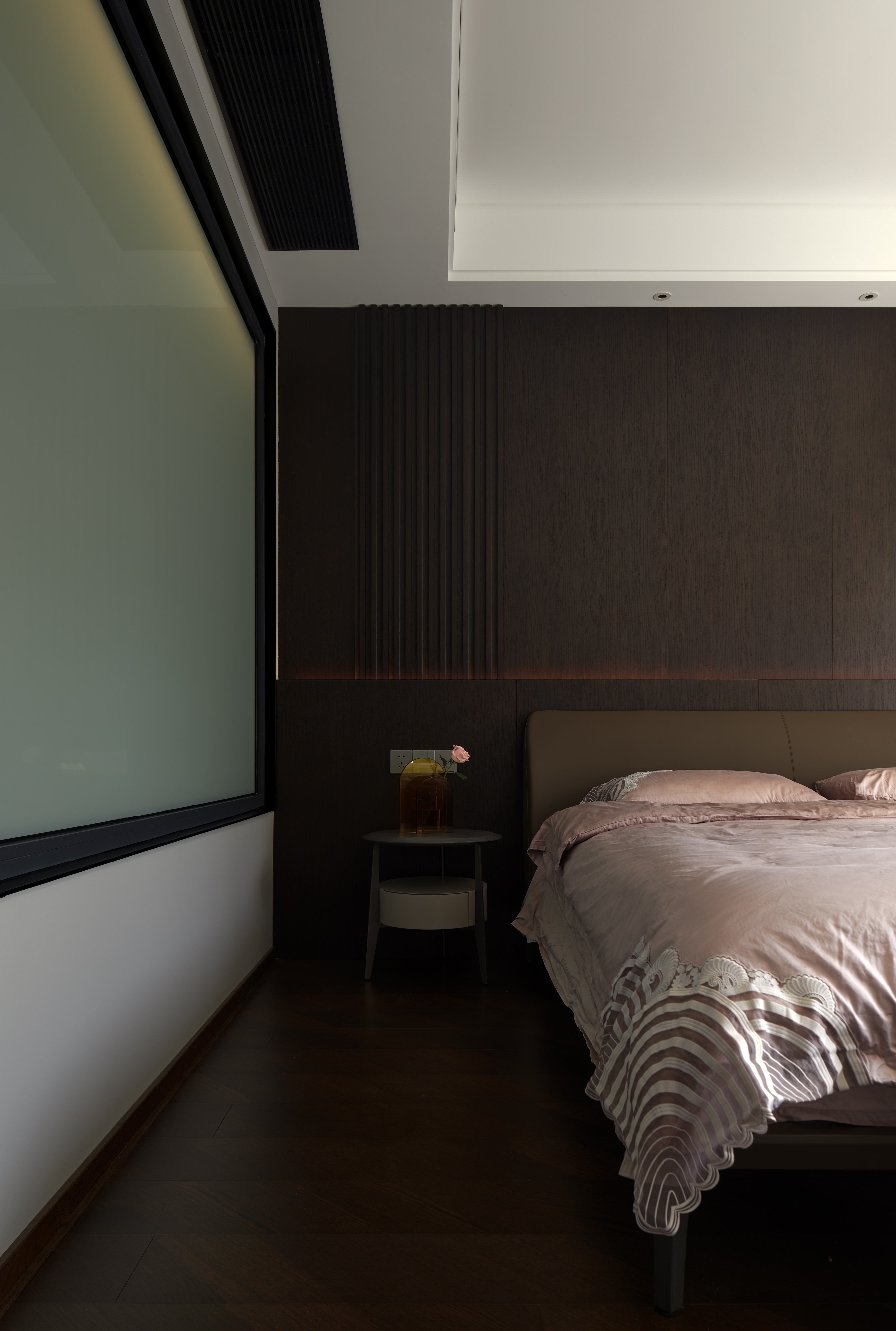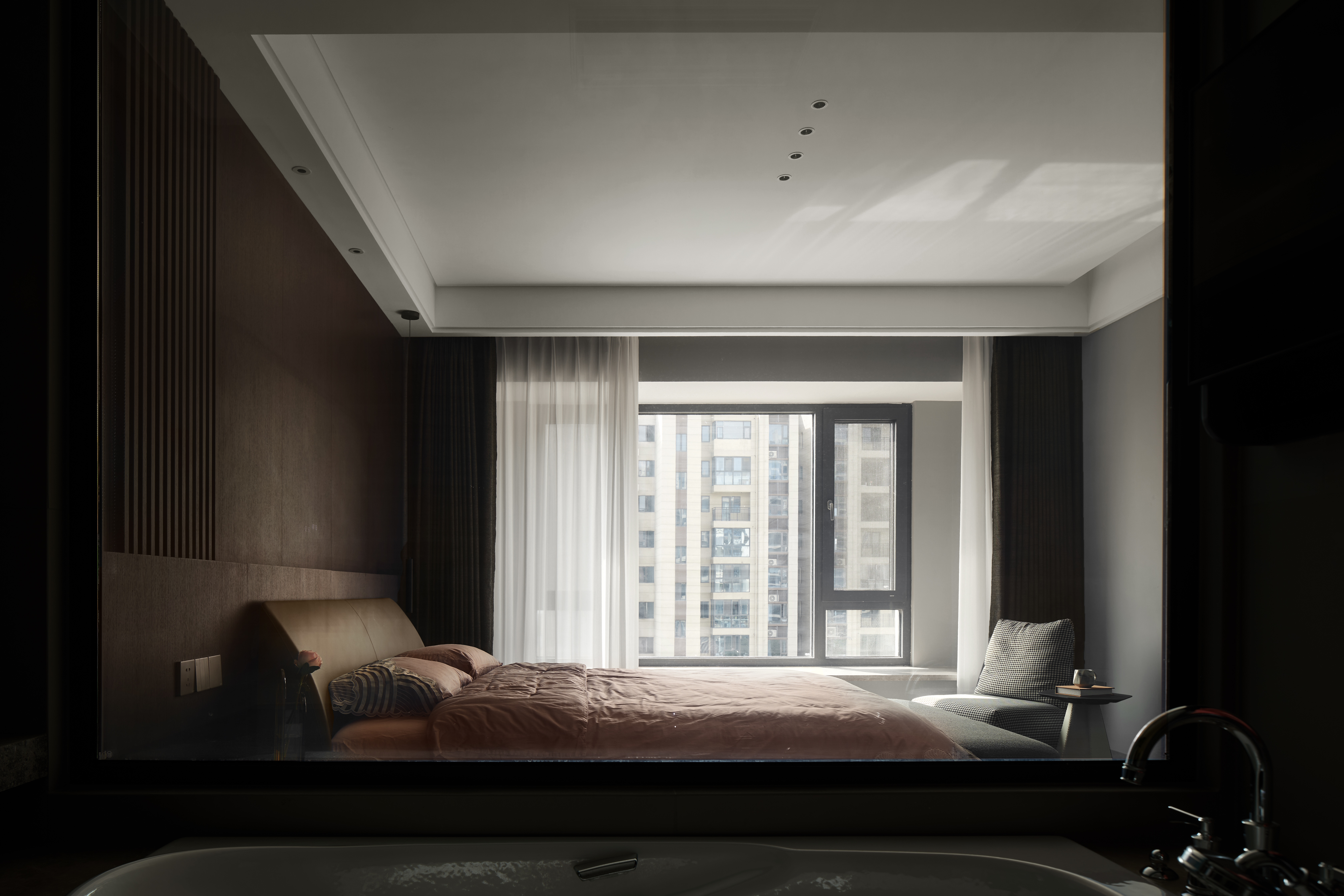 空间意境:空间的高级感无需靠堆砌来完成,适当的留白是更高阶的呈现。酒店套房式的设计思维,将浴室和卧室由玻璃隔断隔开,创造荧幕感的虚拟空间。柔软舒适的大床,皮质靠枕搭配浅色系丝质床品,营造“轻奢高级又有质感”的静谧之所