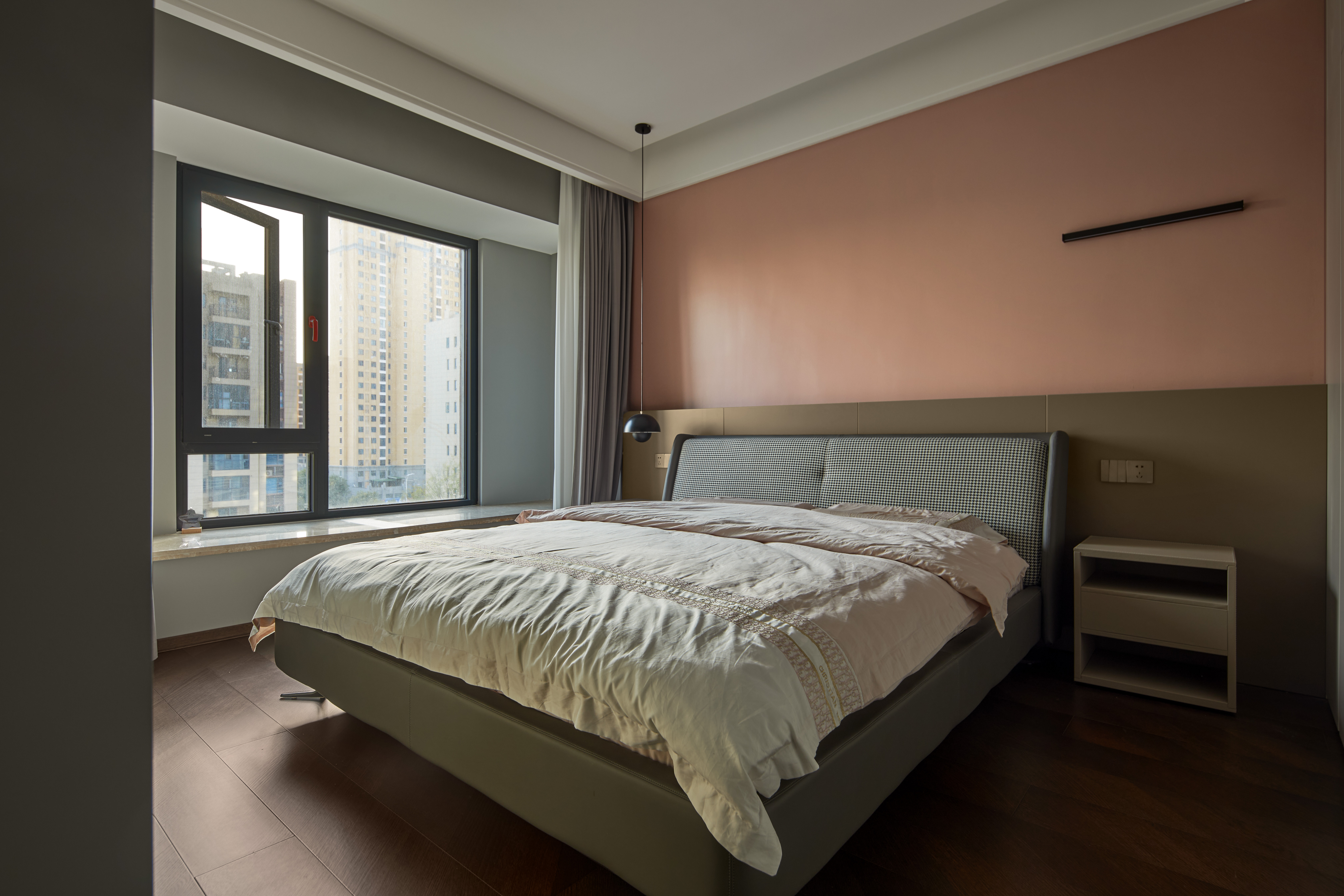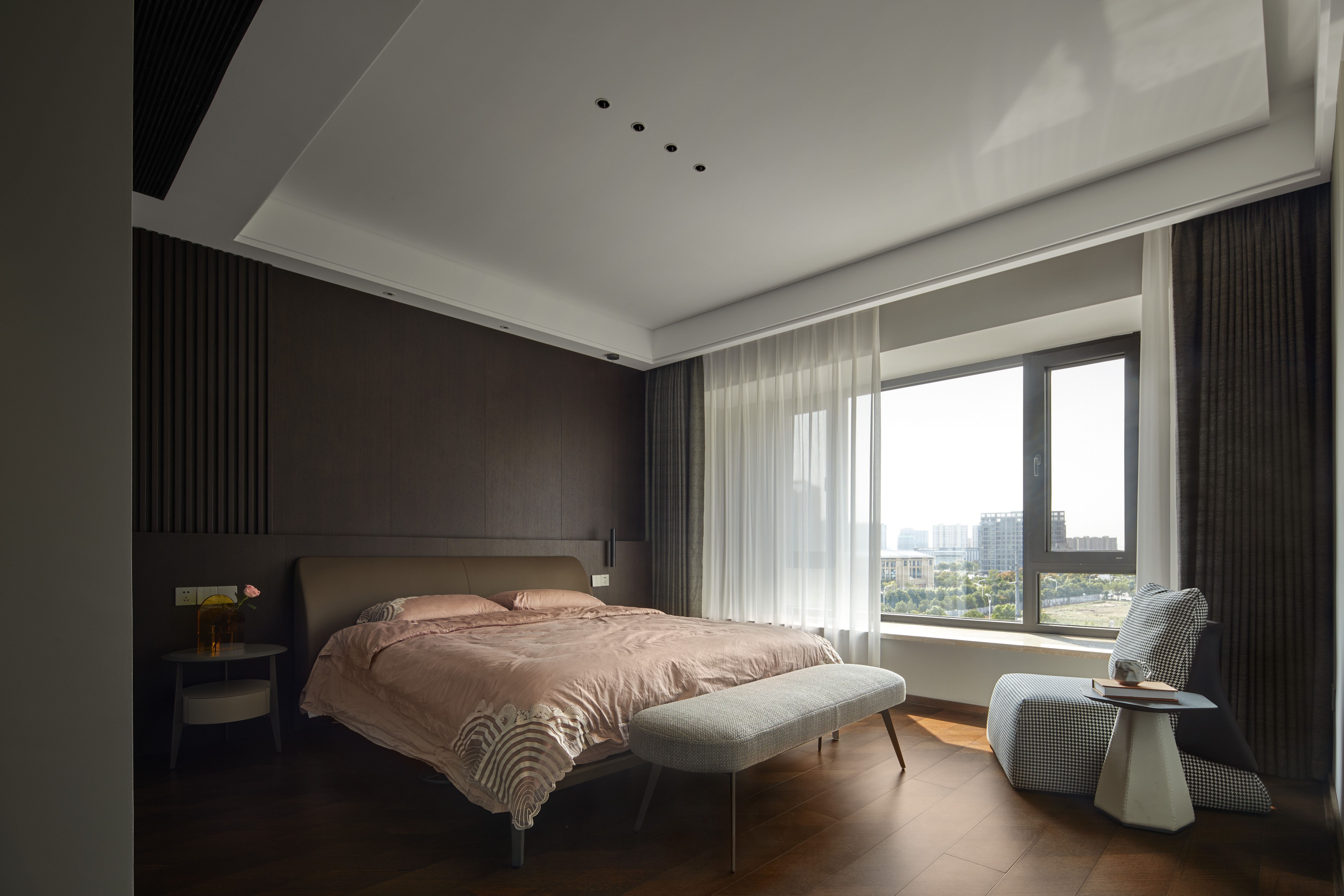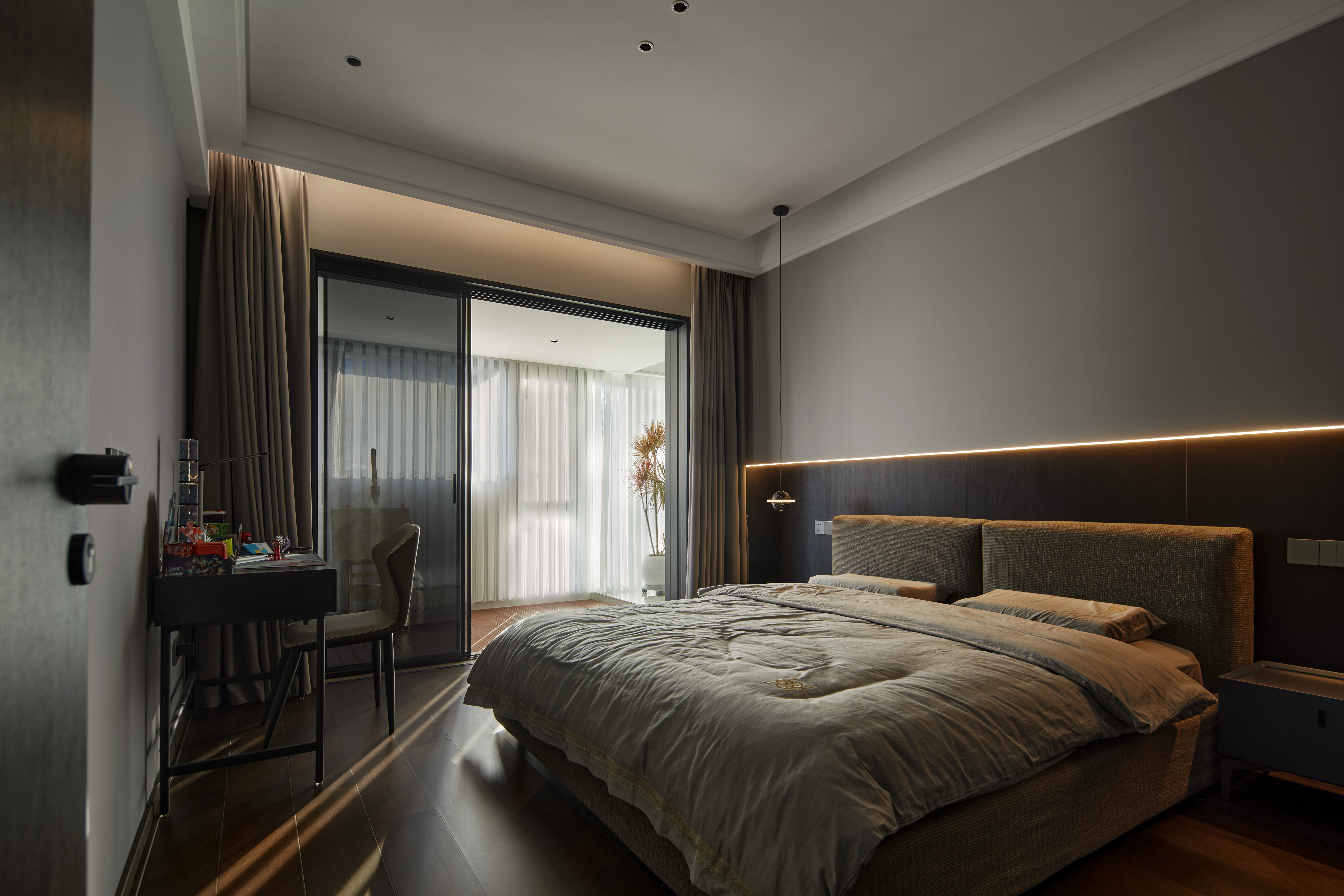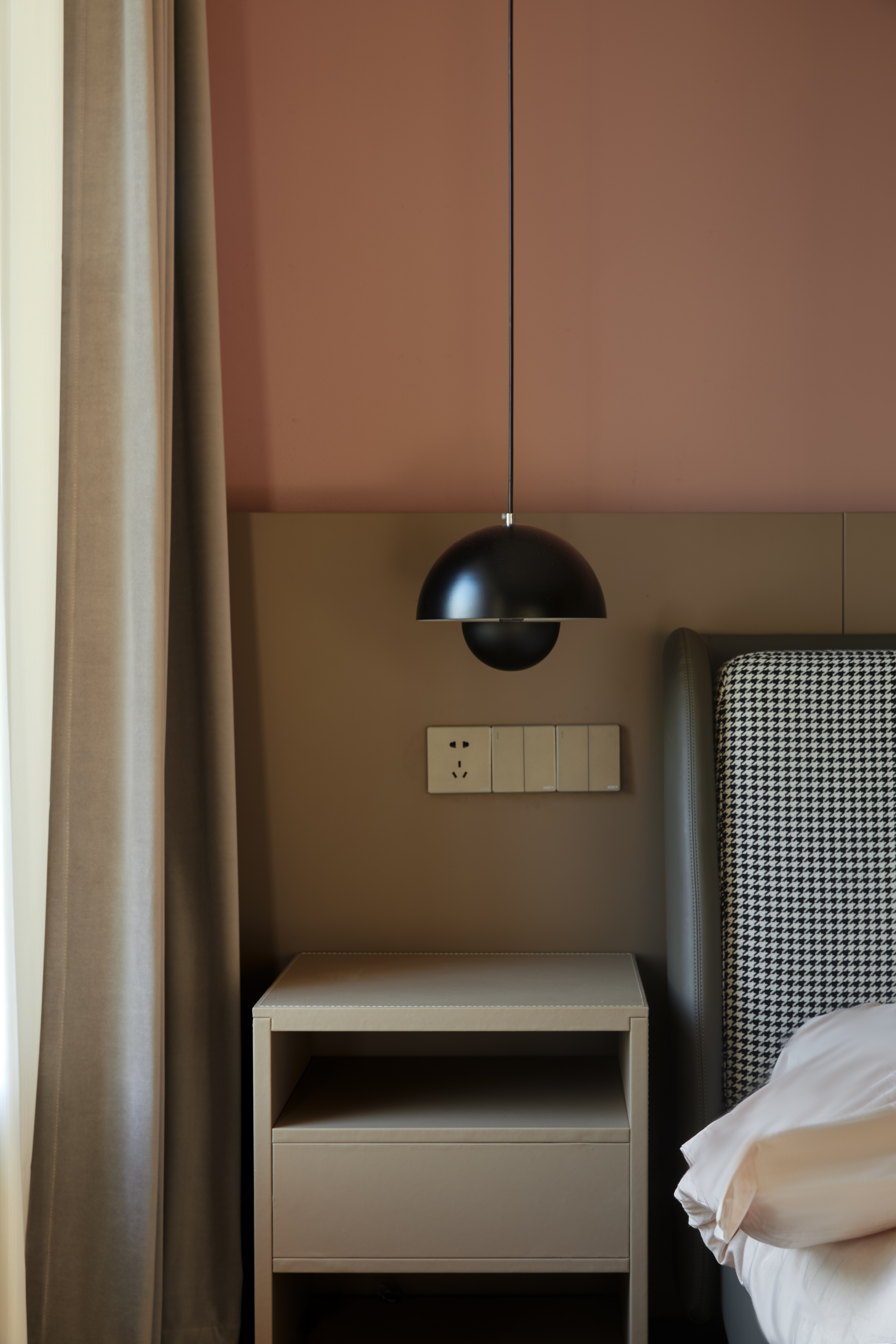空间意境:空间的高级感无需靠堆砌来完成,适当的留白是更高阶的呈现。酒店套房式的设计思维,将浴室和卧室由玻璃隔断隔开,创造荧幕感的虚拟空间。柔软舒适的大床,皮质靠枕搭配浅色系丝质床品,营造“轻奢高级又有质感”的静谧之所