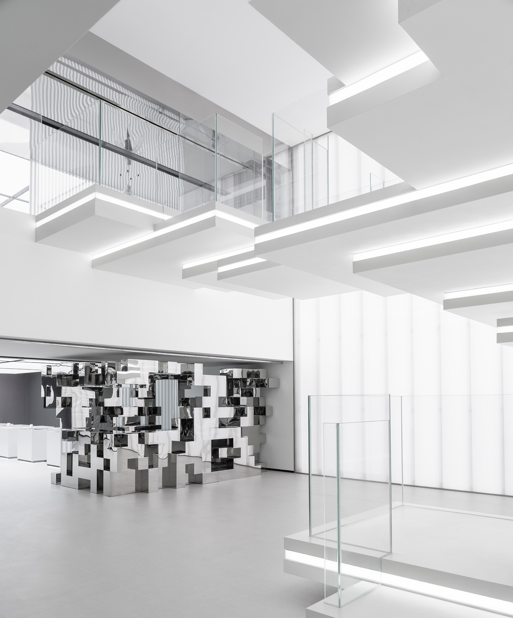 空间意境:我们用大面积的白色将空间包裹起来,再以银、白色系的不同材质去创建功能元素,搭配线或面的灯光设计,产生“多重曝光”效果;利用体块的组合,在线条与镜面的辅助下形成一定程度的空间压缩感,如此视觉“特效”的叠加,未来世界的科幻感也就自然地被强化了。