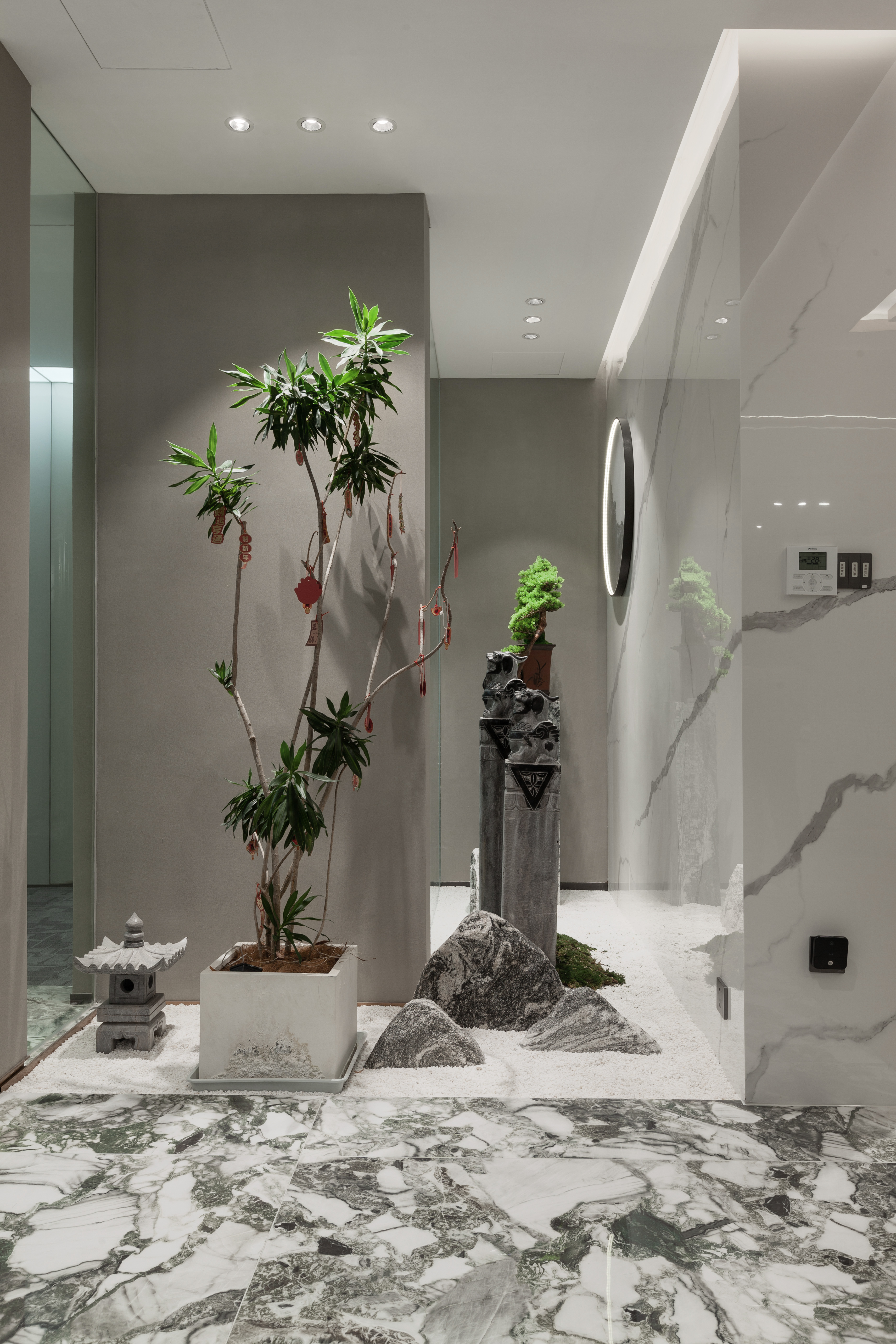 门厅石材地面和内部区分开来形成独立空间,与干景相融合达到虚实相结合的效果,干景区再搭配些石雕和石灯等,使整体效果更加丰富多彩!