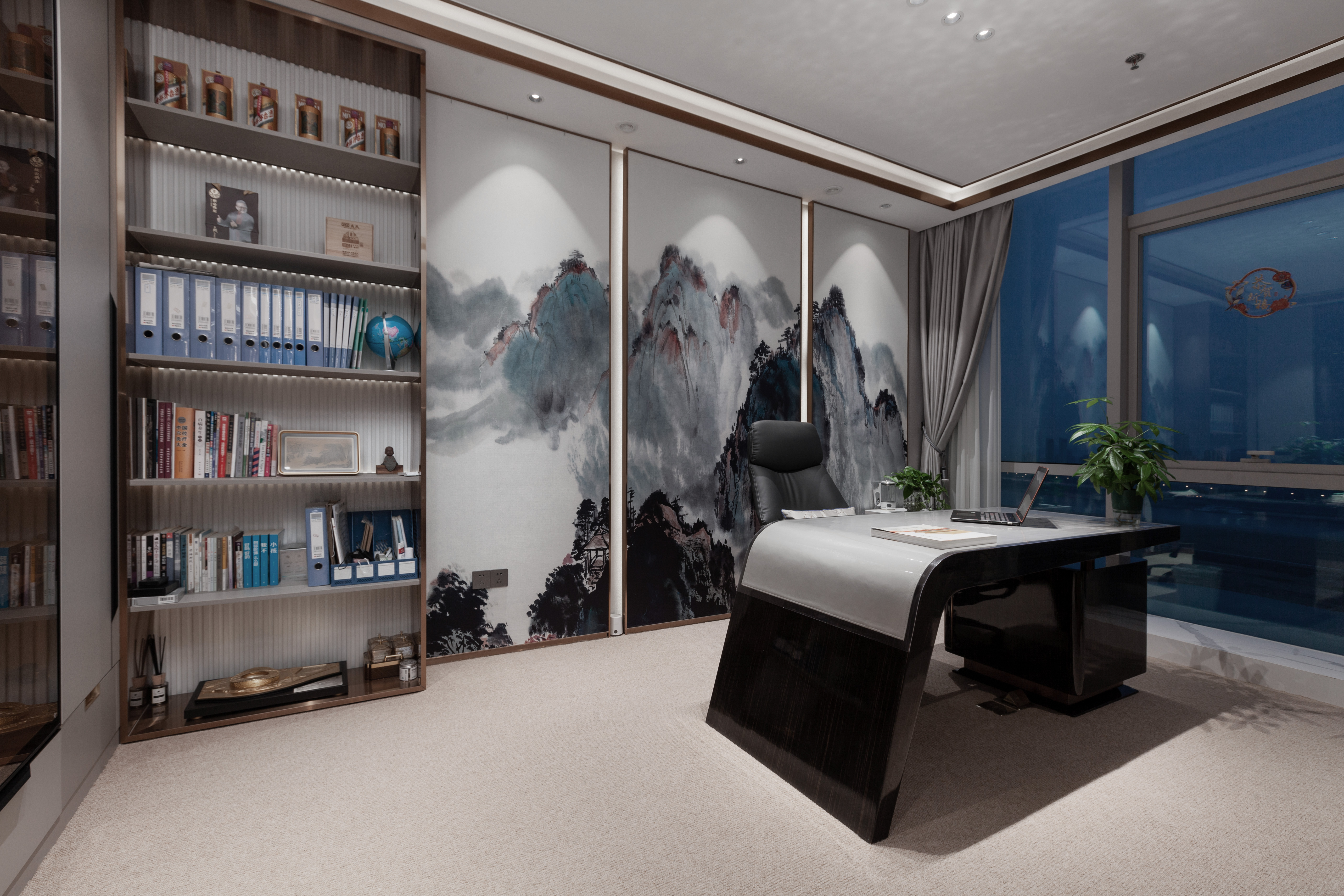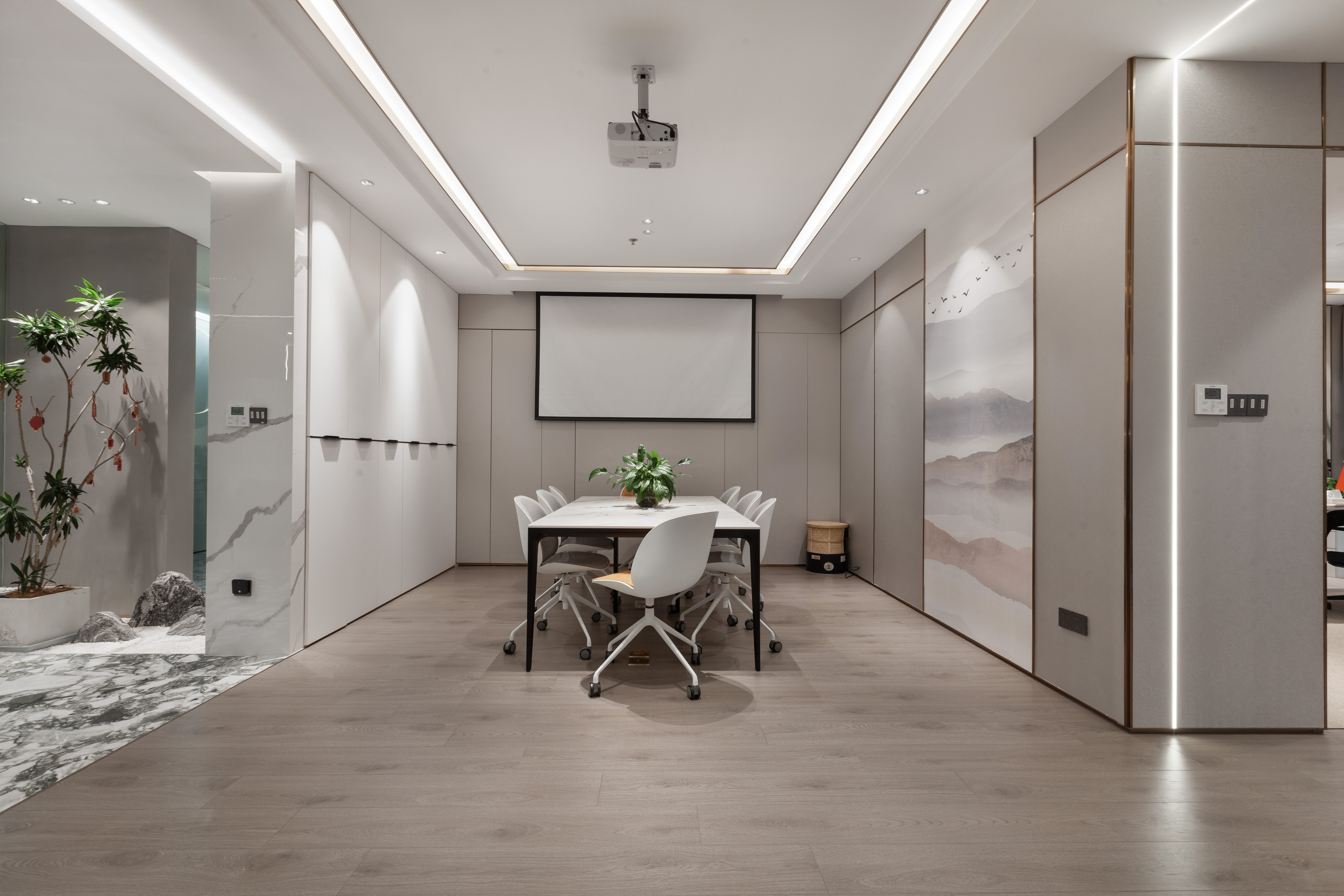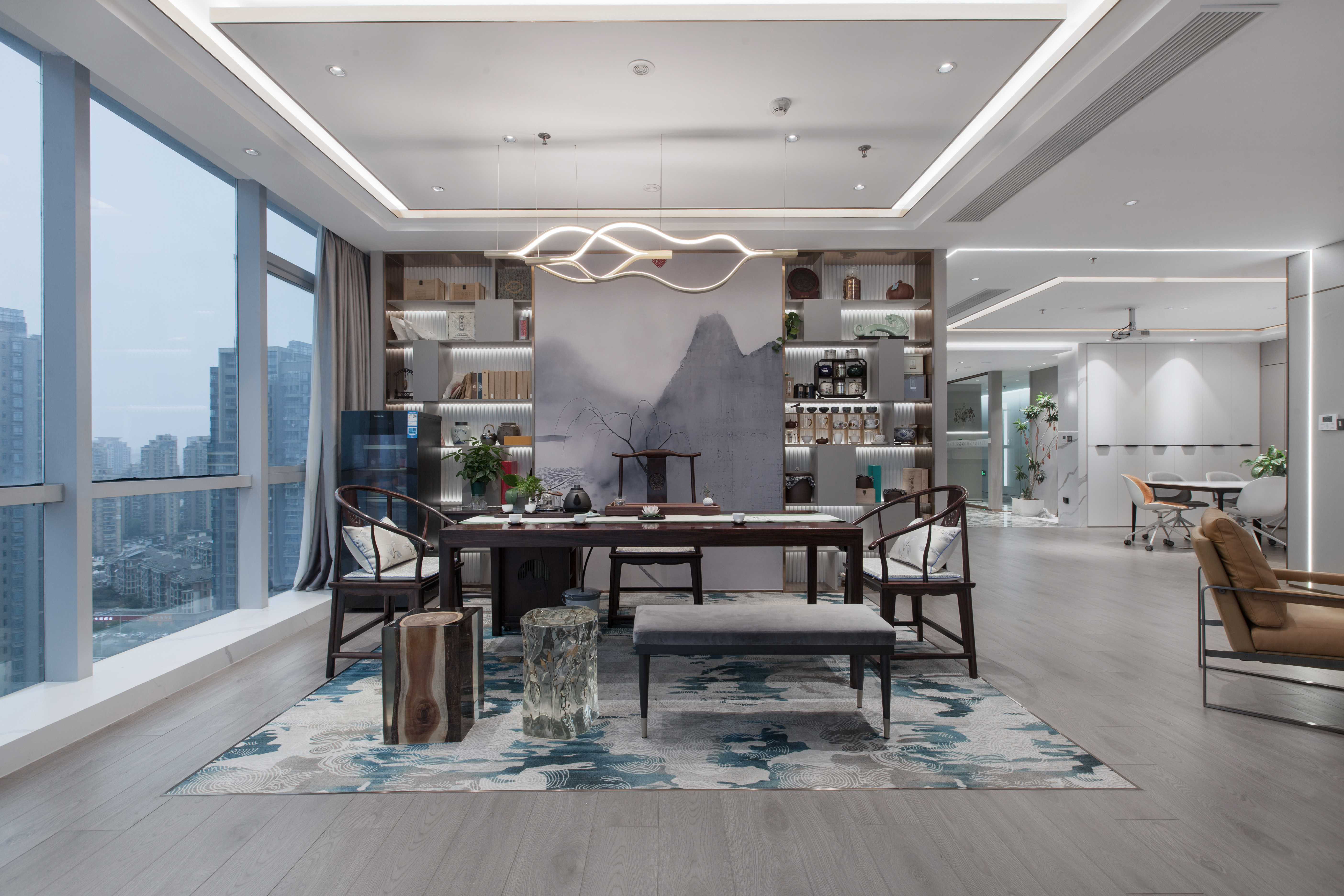 办公室与茗品区相呼应亦有依山傍水之感,搭配纯色素雅的地毯,使空间更加纯粹.