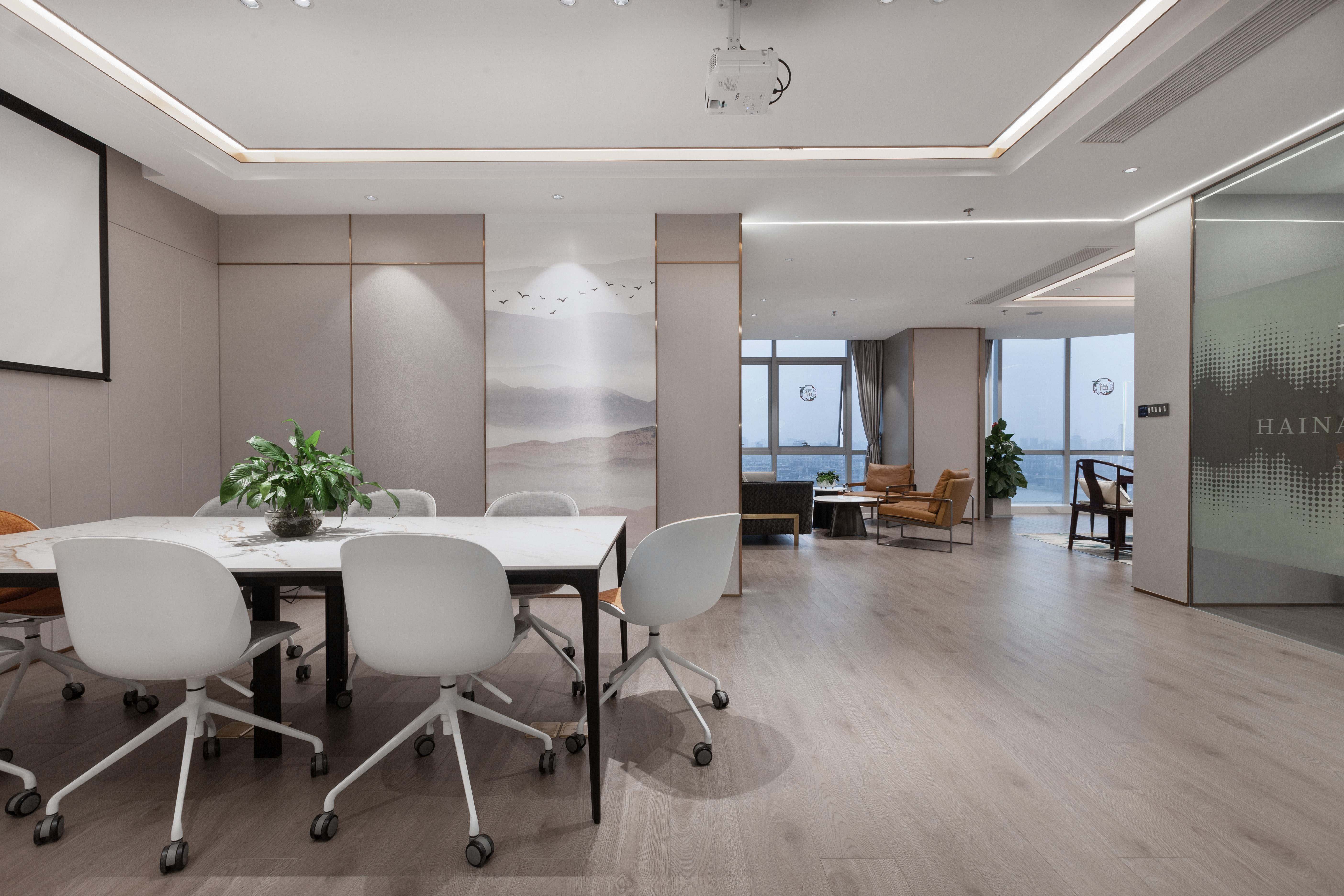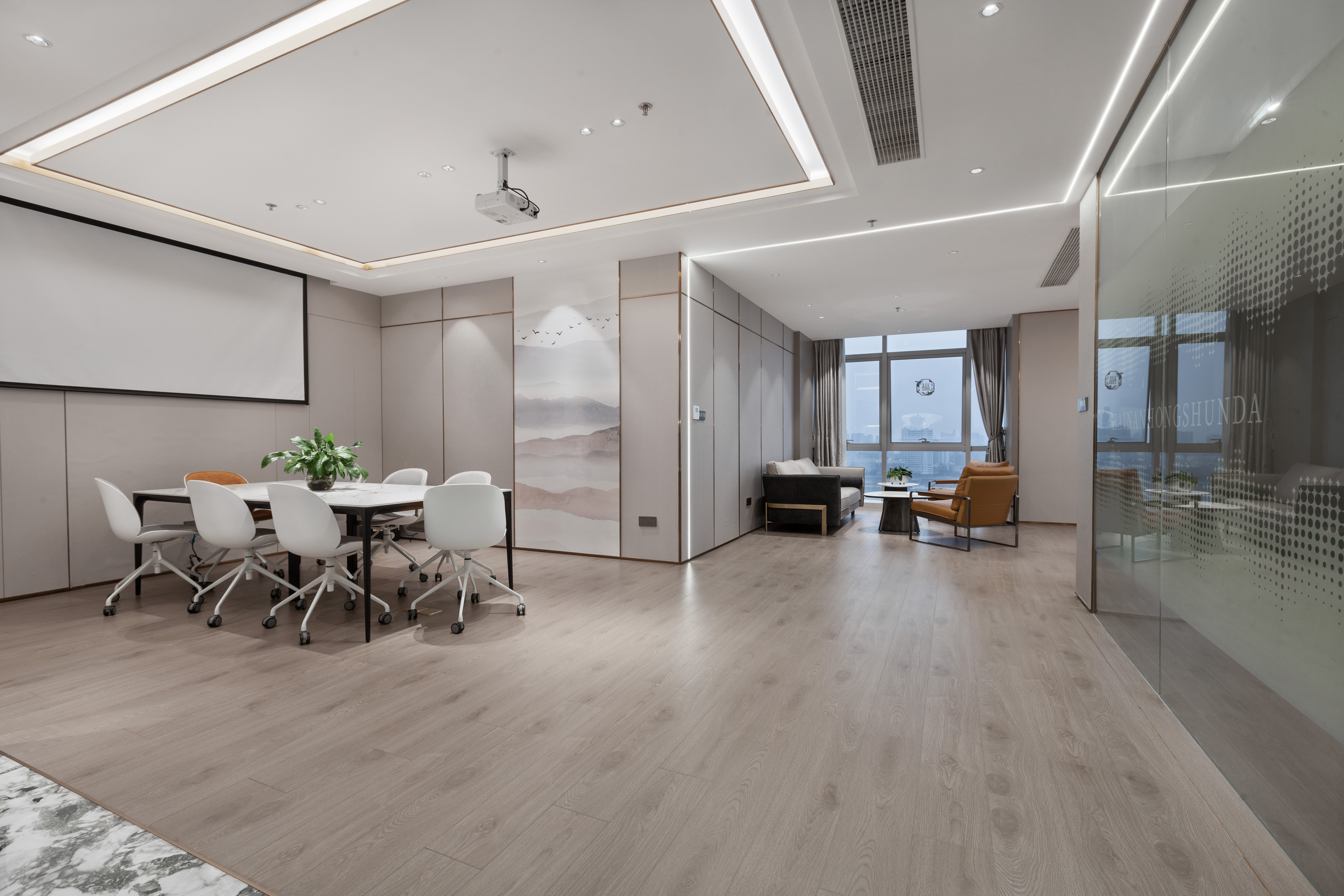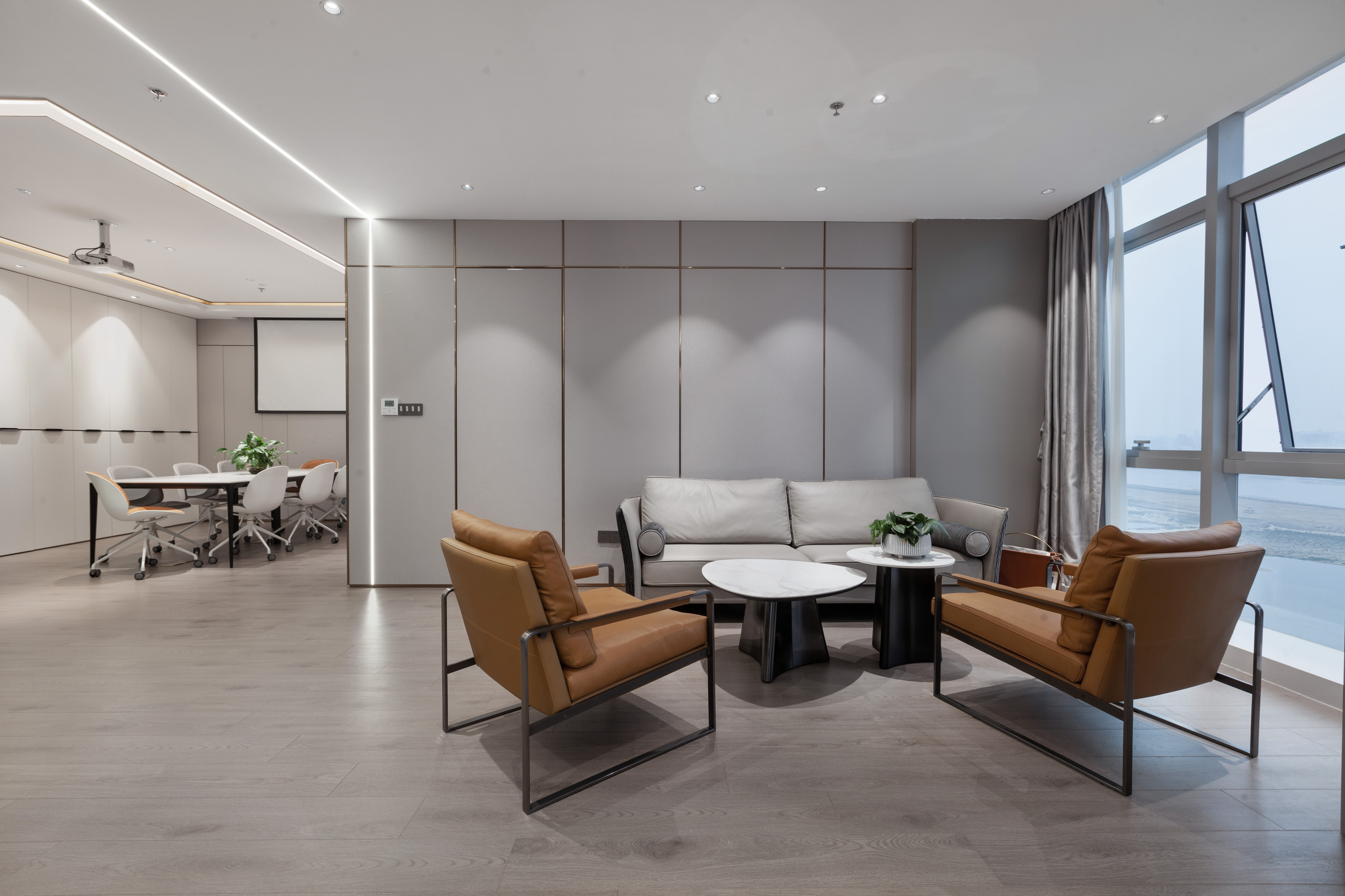 会客区现代舒适的皮质沙发, 在会客交谈的同时,望向落地窗外,不经意就能想起王勃在诗句中所描绘“落霞与孤鹜齐飞,秋水共长天一色”的绝美景色!