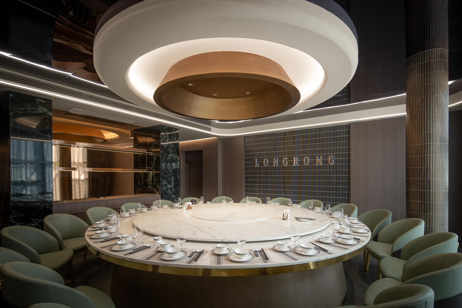 餐厅部份优雅的珍珠吊灯和顶面的PU线条搭配为整体空间增添氛围。