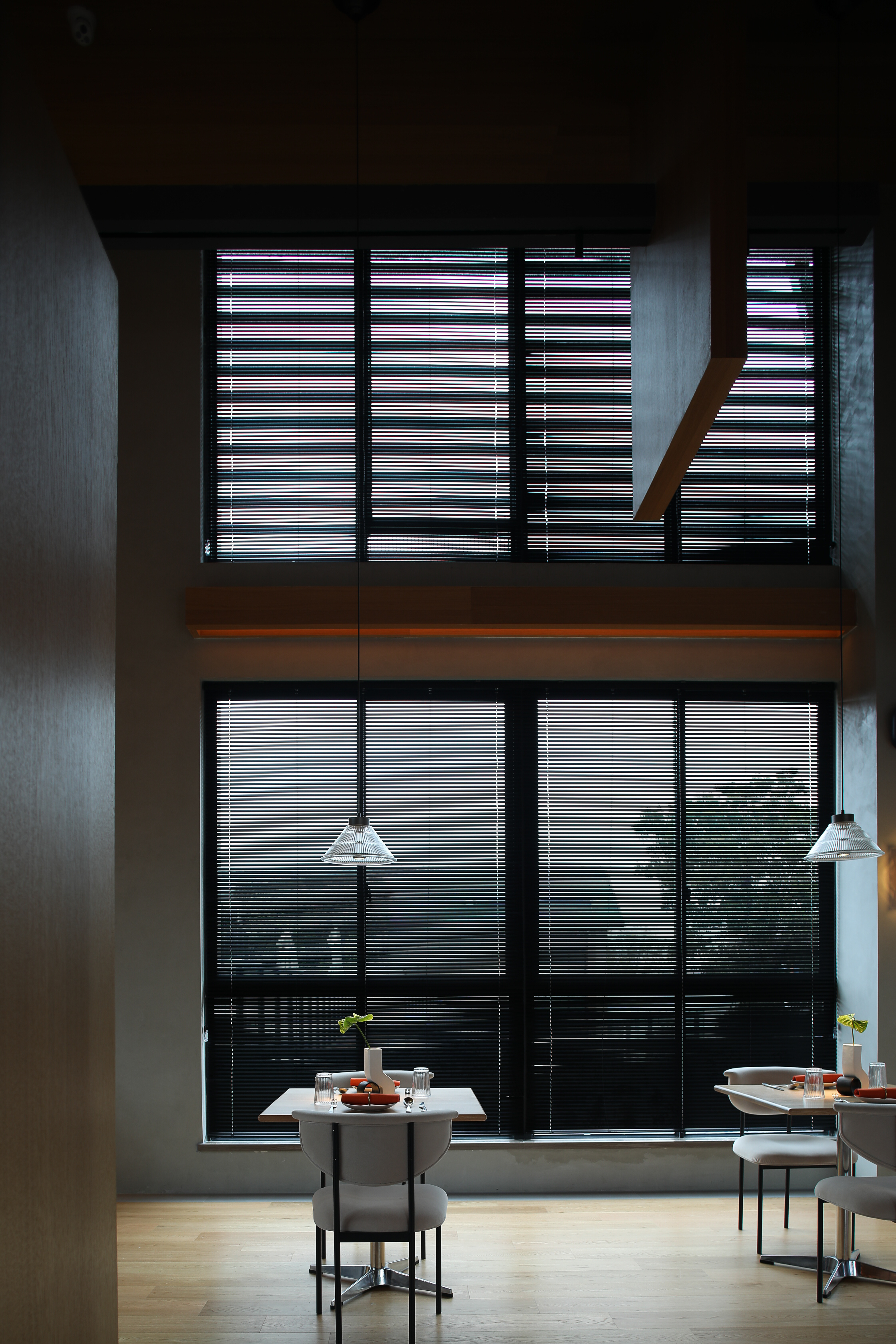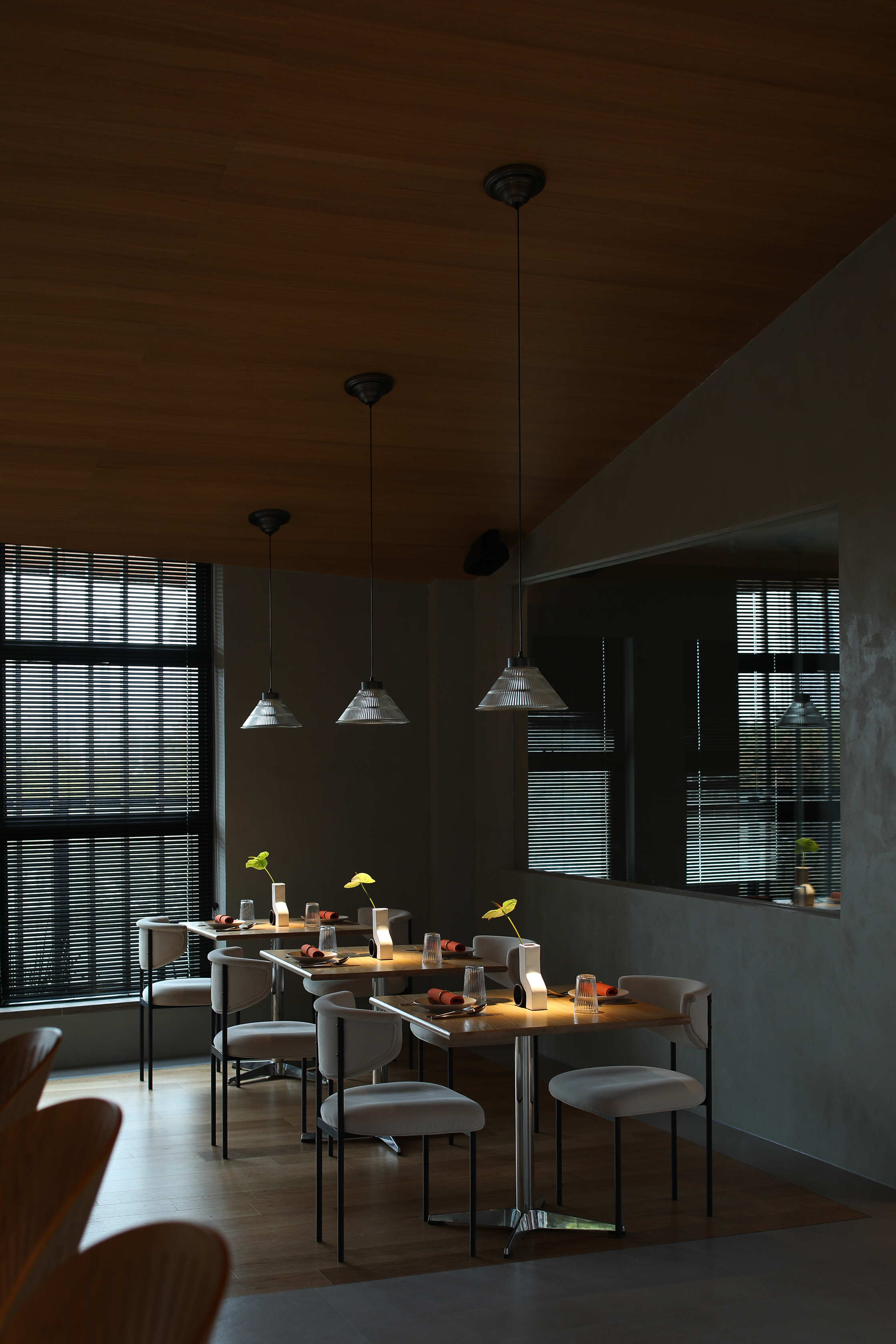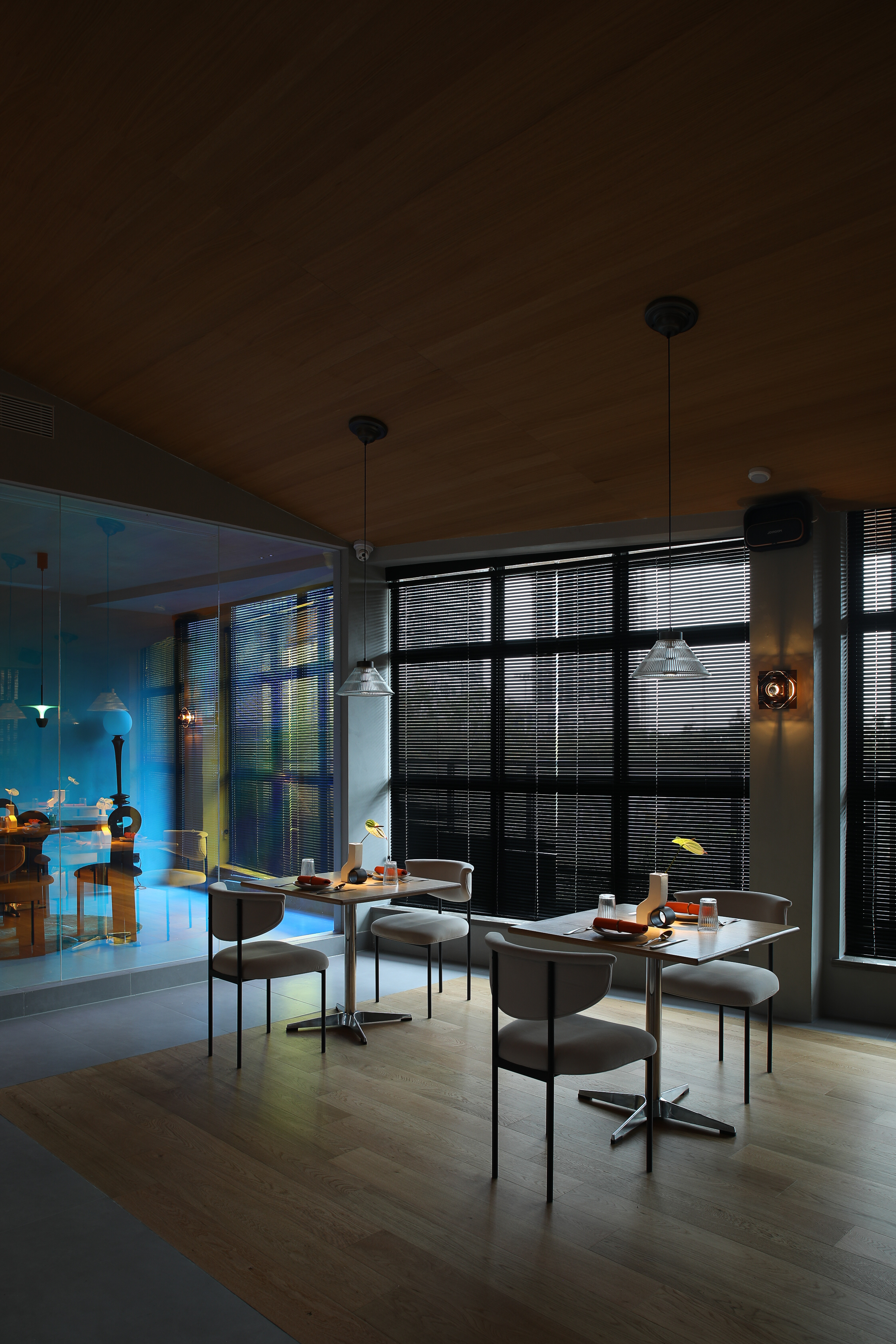 依托永年江畔,打造氛围感的湖景餐厅 ,如同餐厅主营的融合法餐和精酿啤酒,我们希望空间是具有丰富观感和层次的。
