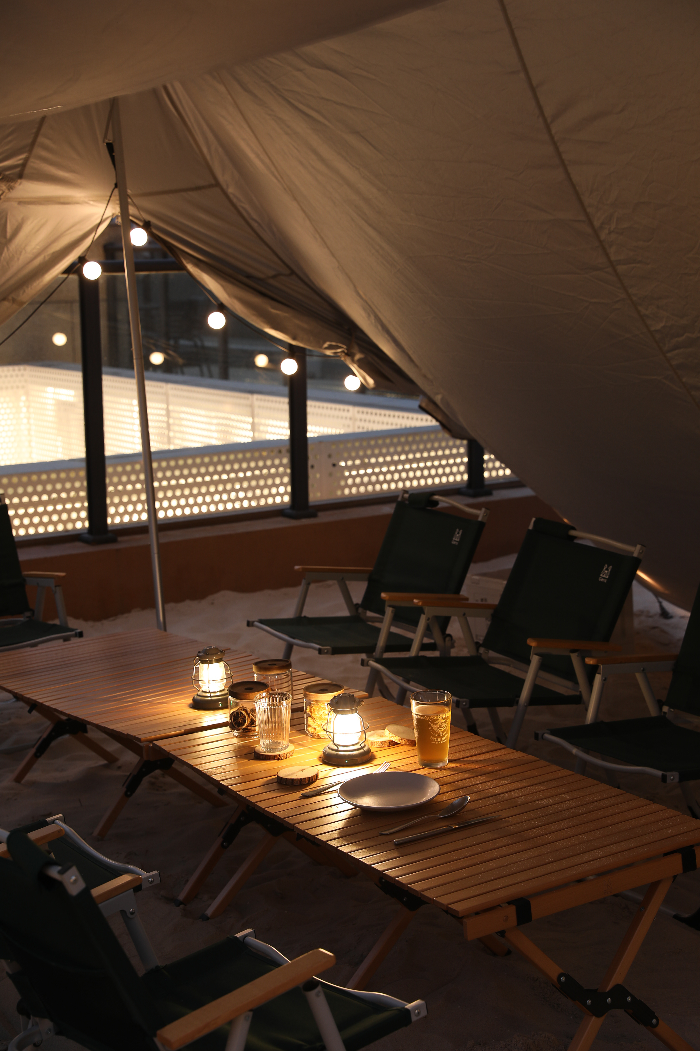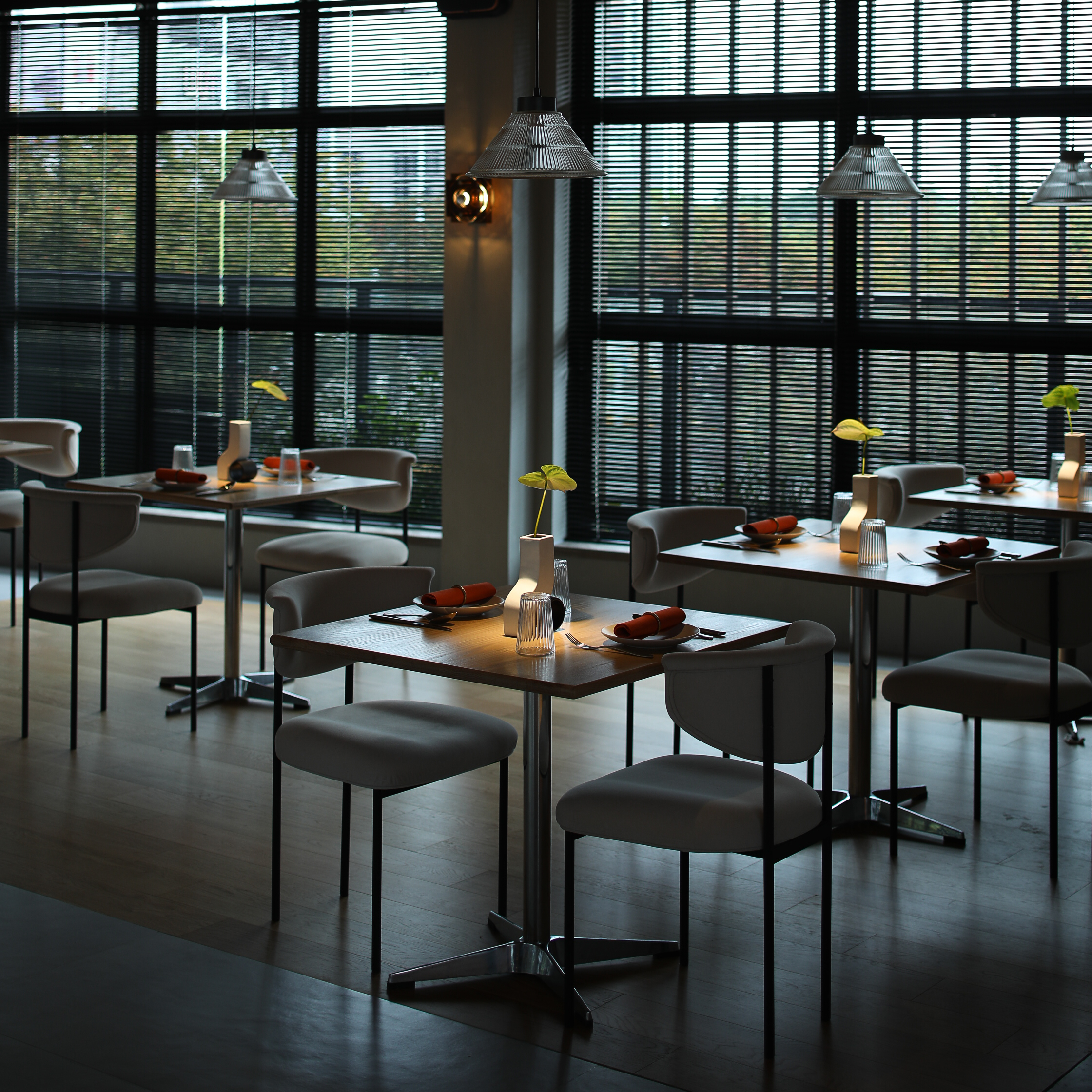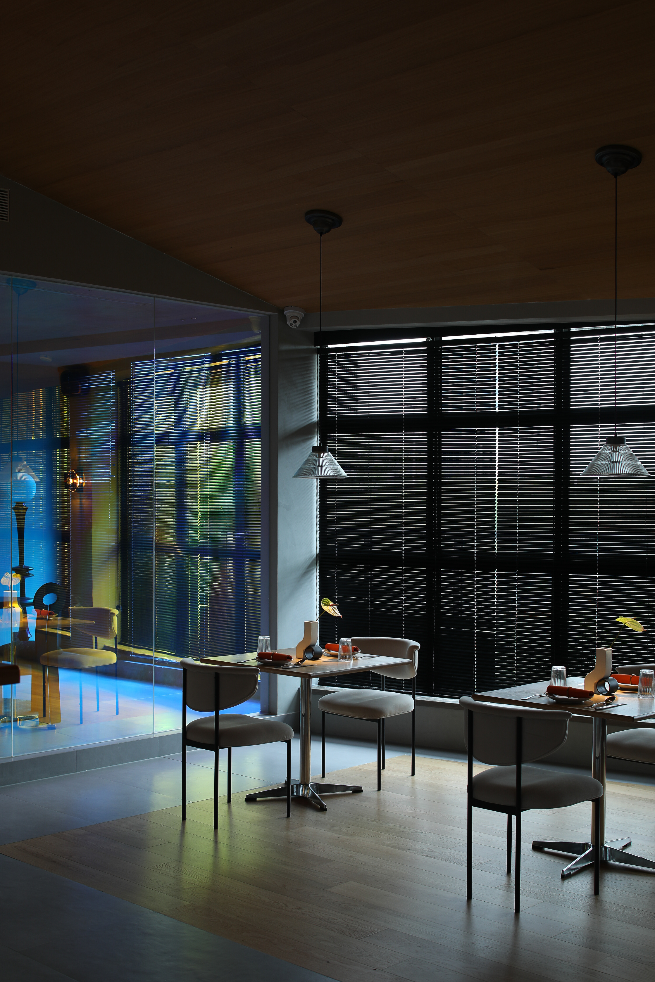 依托永年江畔,打造氛围感的湖景餐厅 ,如同餐厅主营的融合法餐和精酿啤酒,我们希望空间是具有丰富观感和层次的。