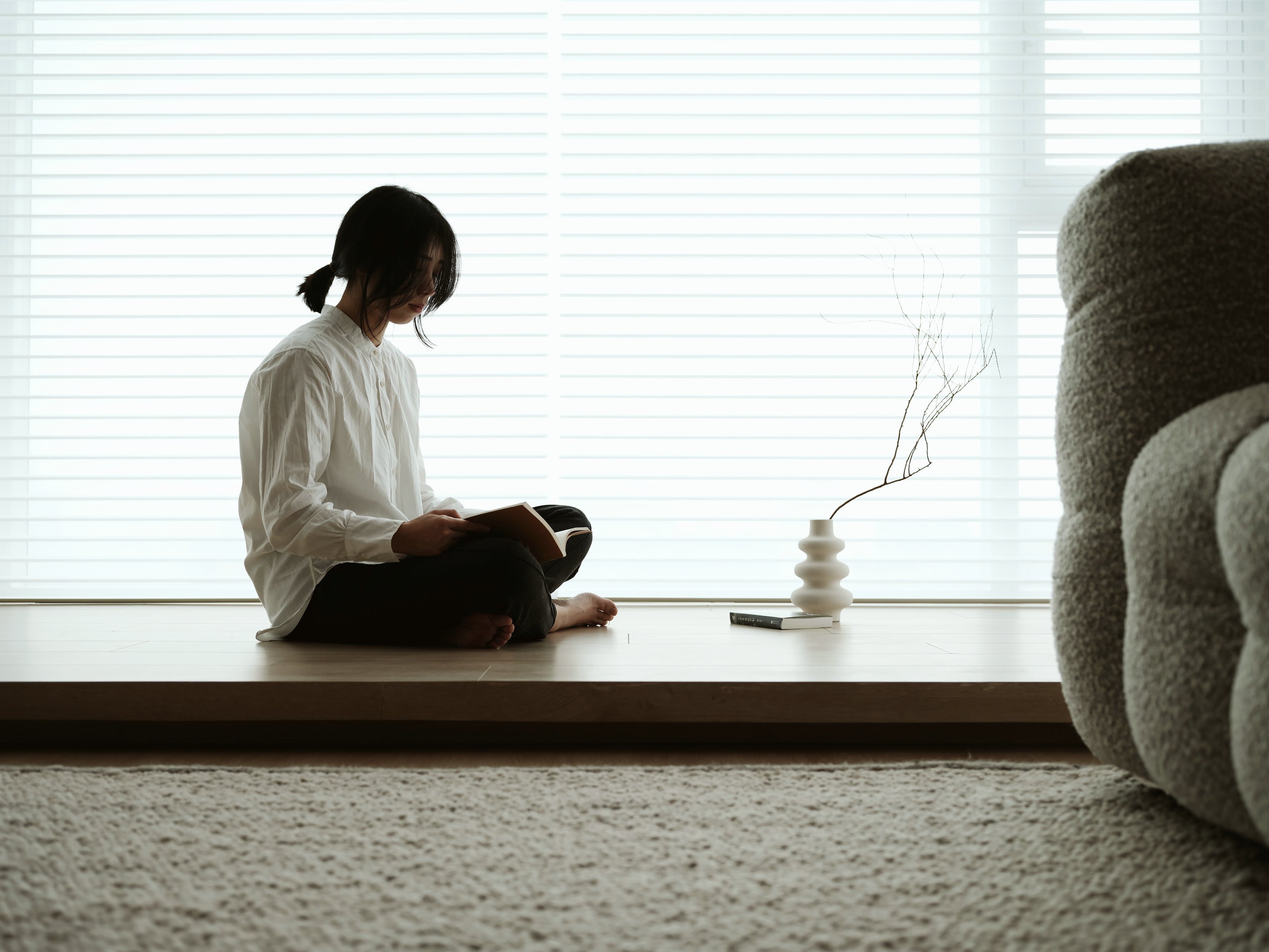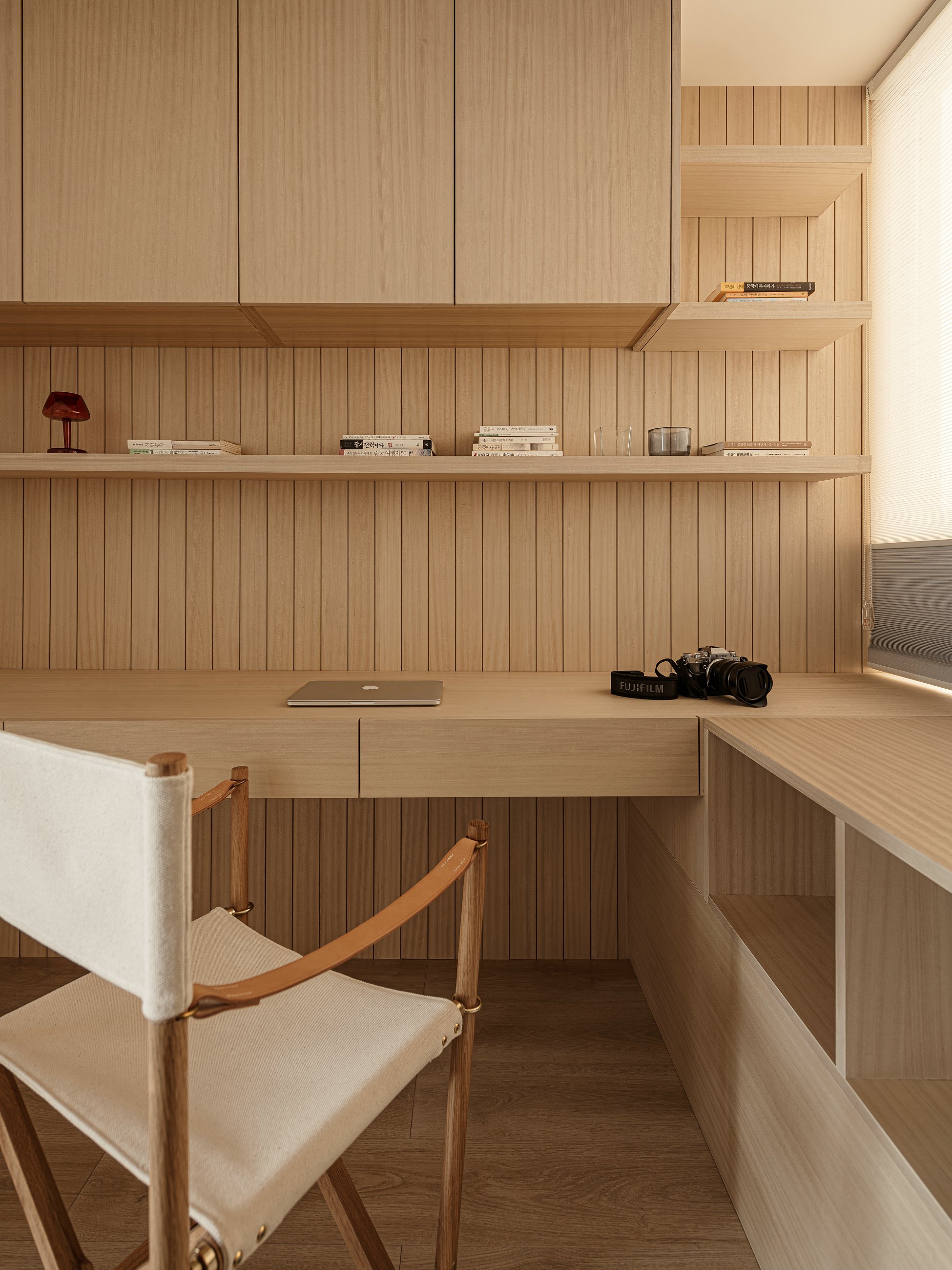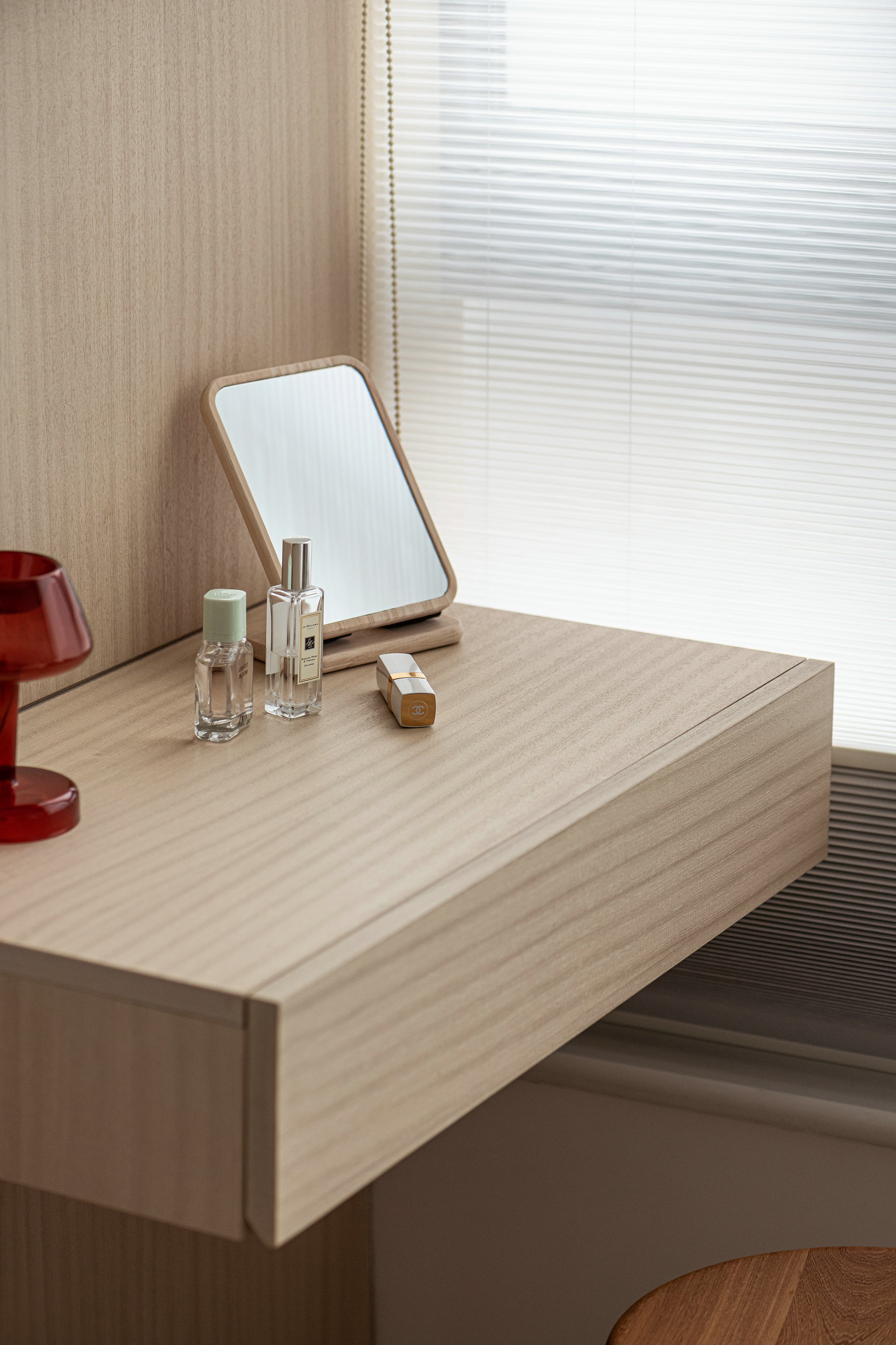 空间意境:女主人是韩国人,根据业主自身的背景和爱好,选用木质、白色基调涂料、布艺等材质,依据定制柜做墙面造型处理,上下悬空而置,拉伸空间感,同时结合户型仅有能发挥的过道空间,顶面、墙面以建筑的手法做“梁位” 装置,引入空间,增强结构感,形成独有空间意境。营造温馨而独特的家