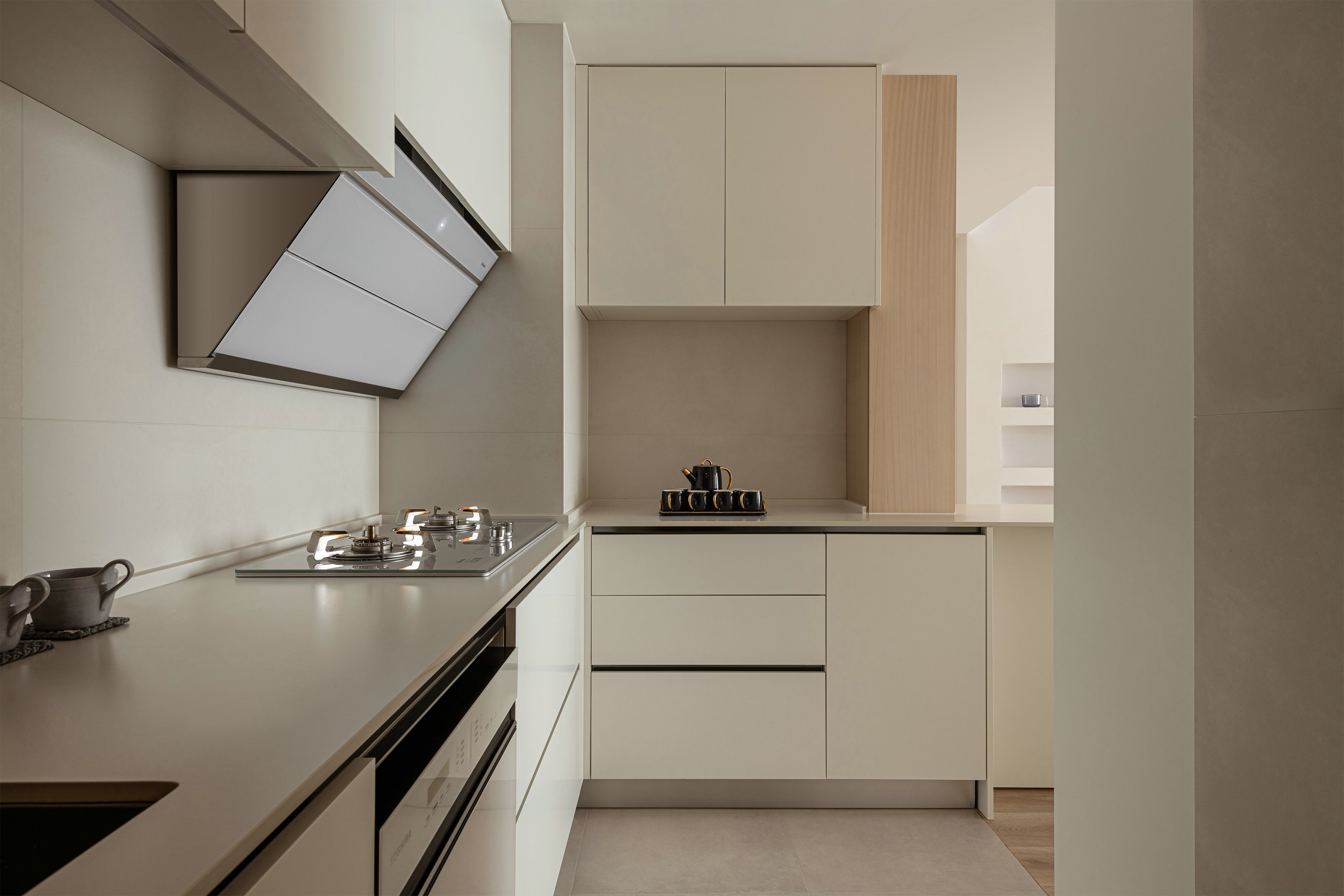 空间布局:1.打开厨房与餐厅隔墙,做开放式厨房,厨房向餐厅延伸操作台面增加收纳,与餐厅岛台连接,拓宽视野和采光。 2.利用过道空间增加西厨收纳柜,拆除原卫生间与餐厅仅有可拆墙体,结合墙体尺寸,利用西厨收纳柜与冰箱整体设计衔接。 设置导台连体餐桌,为屋主实现LDK一体化设计,让厨房、西厨、餐厅三个空间形成联动,多元化使用场景。 3.拆除原客厅阳台推拉门,把阳台纳入客厅空间,阳台设置地台,看向外面的视野更佳,与客厅形成高低层次,满足屋主茶道、花艺的需求,增强趣味性。 5.因户型改做3房,过道尤其拥挤,利用悬浮隔断做卫生间做干湿分区,减少视野拥堵,扩大过道采光。