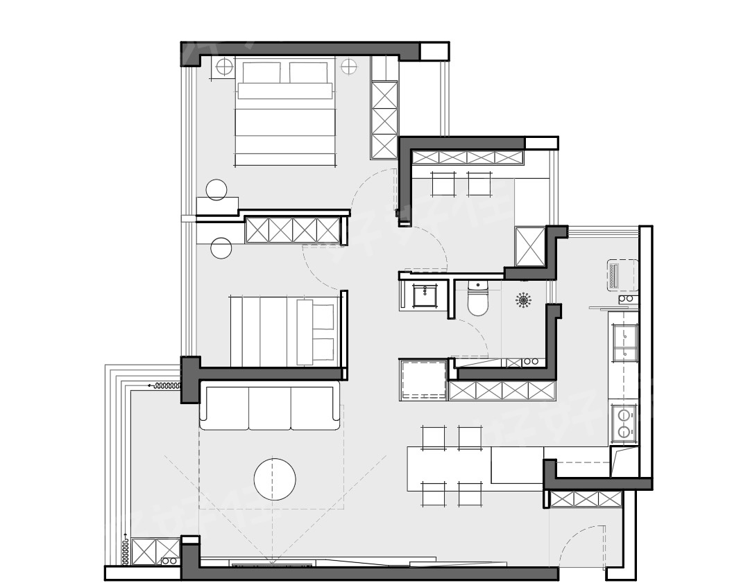 用户体验:户型与空间:1.在户型面积较小的基础上满足屋主多个功能空间需求。 2.在承重墙较大的情况下,利用原建筑结构细分空间尺寸,让每个空间的利用率变大,收纳变大。 3.结合屋主功能需求和原建筑本身缺陷做功能合理,同时增加屋主的空间趣味性和多样性。