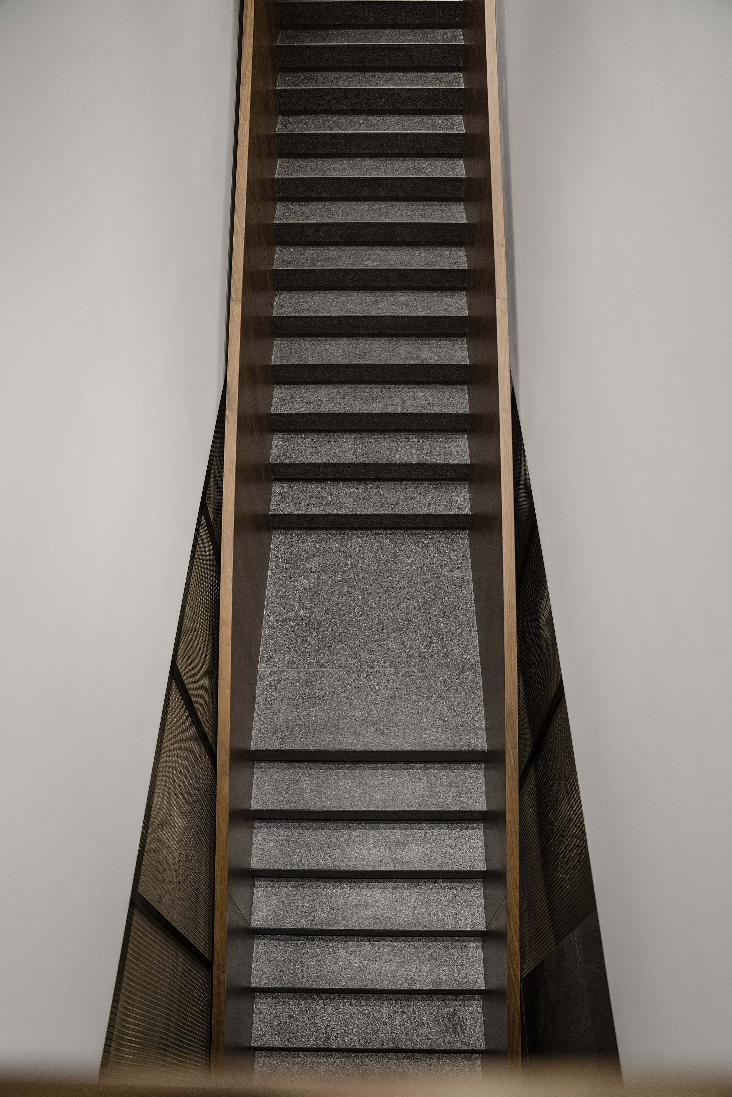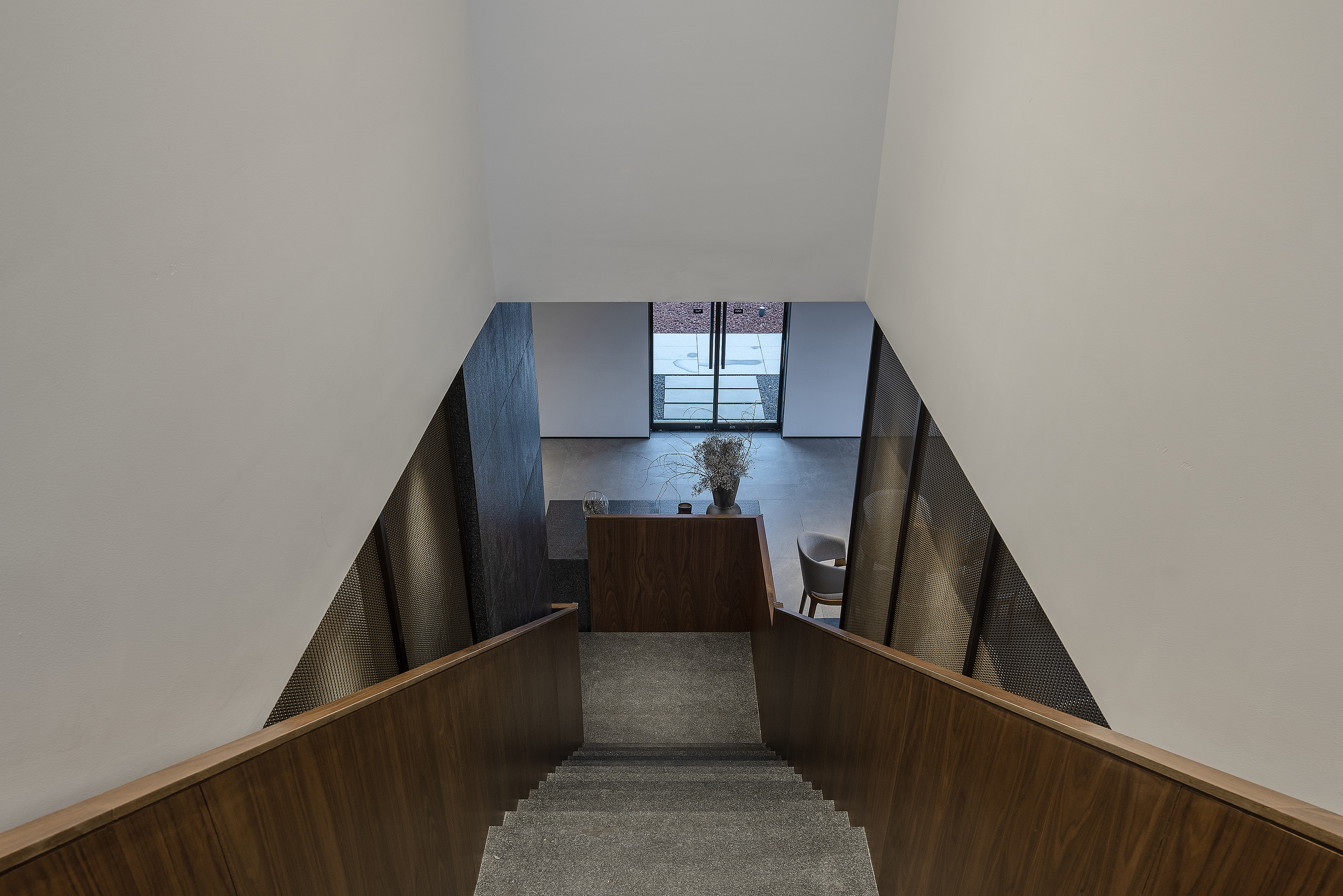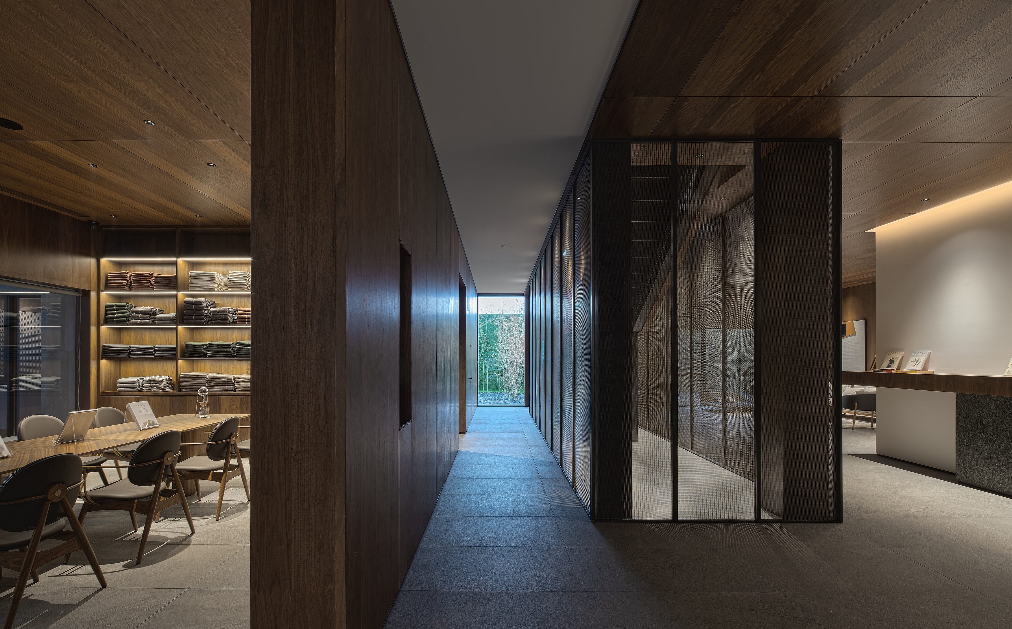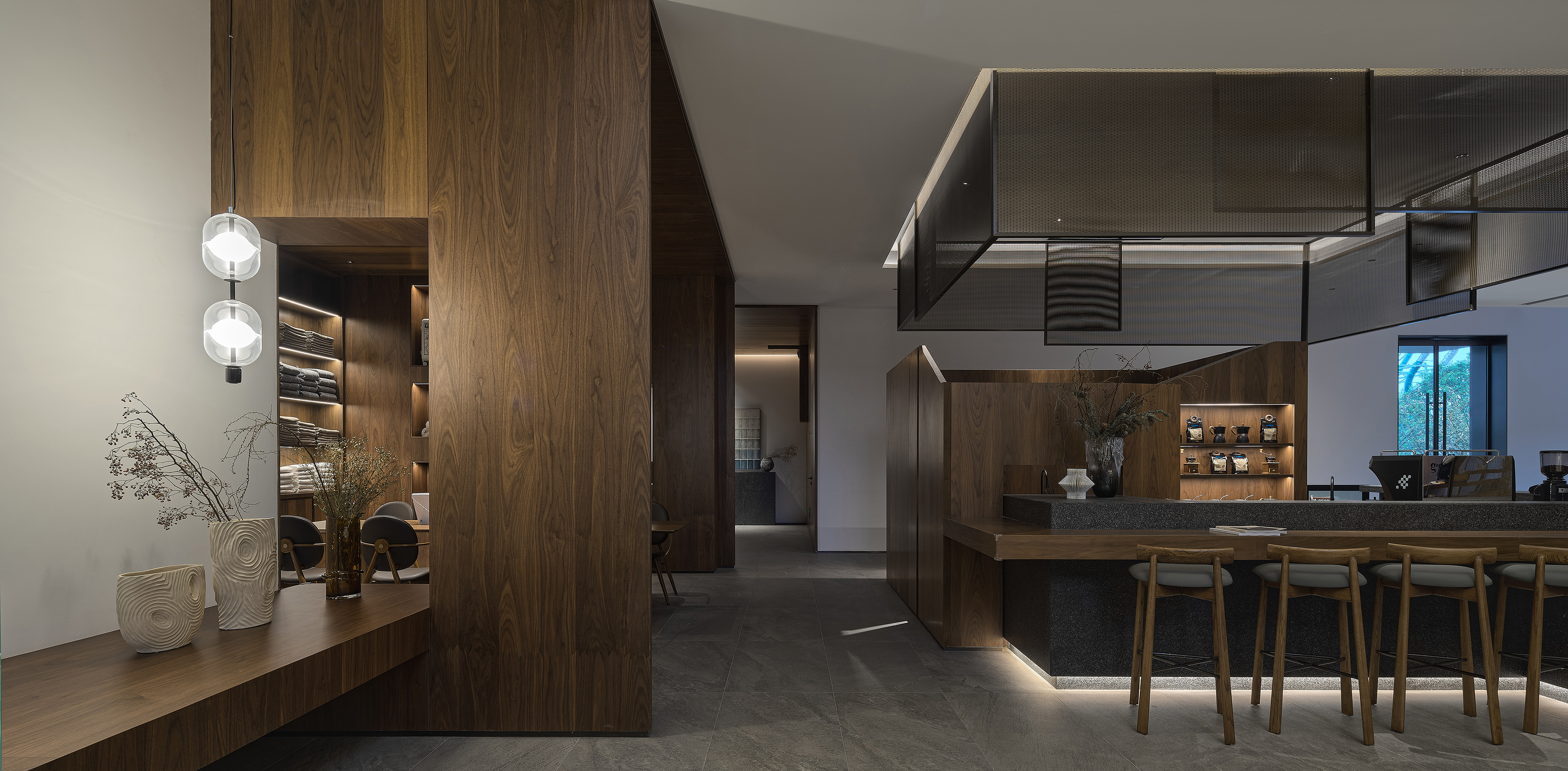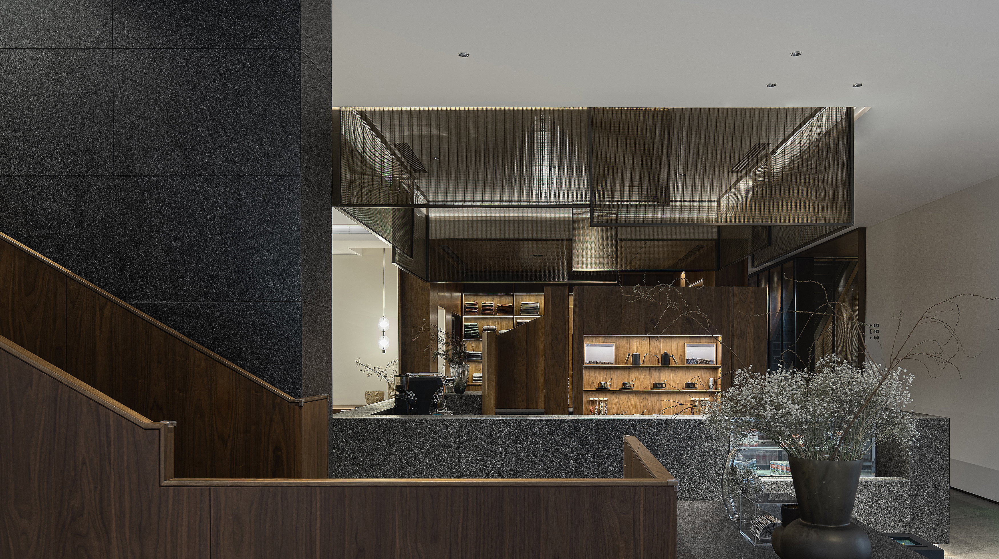 设计选材:整体设计材料的选择追求自然,地面采用水泥色地砖,墙面大面积的使用乳胶漆搭配胡桃木饰面,还原空间的本真;局部采用深色水洗面石材,增加空间视觉体块造型,结合金属帘屏风,让空间虚虚实实朦胧有趣。