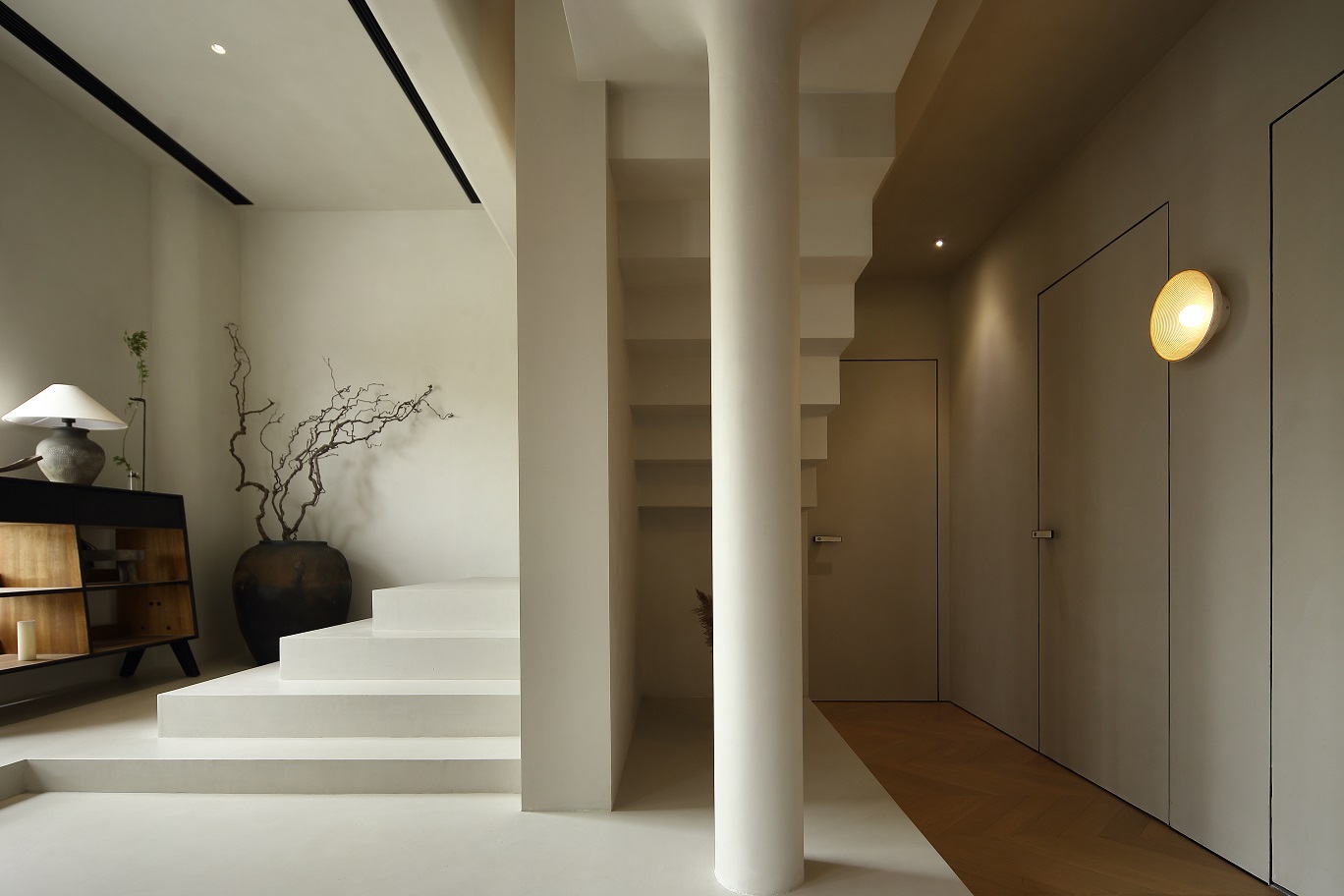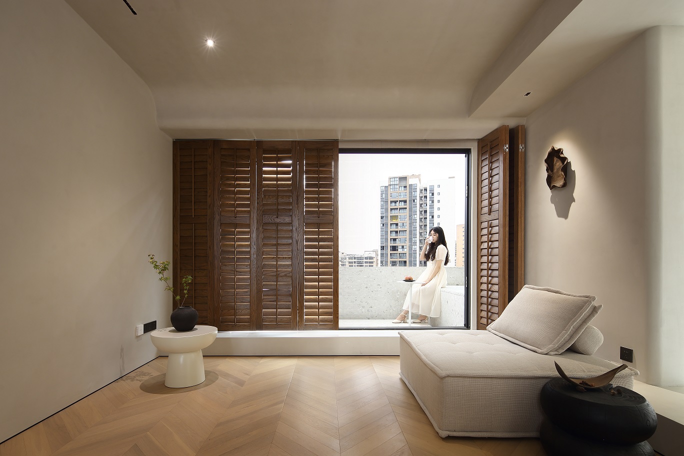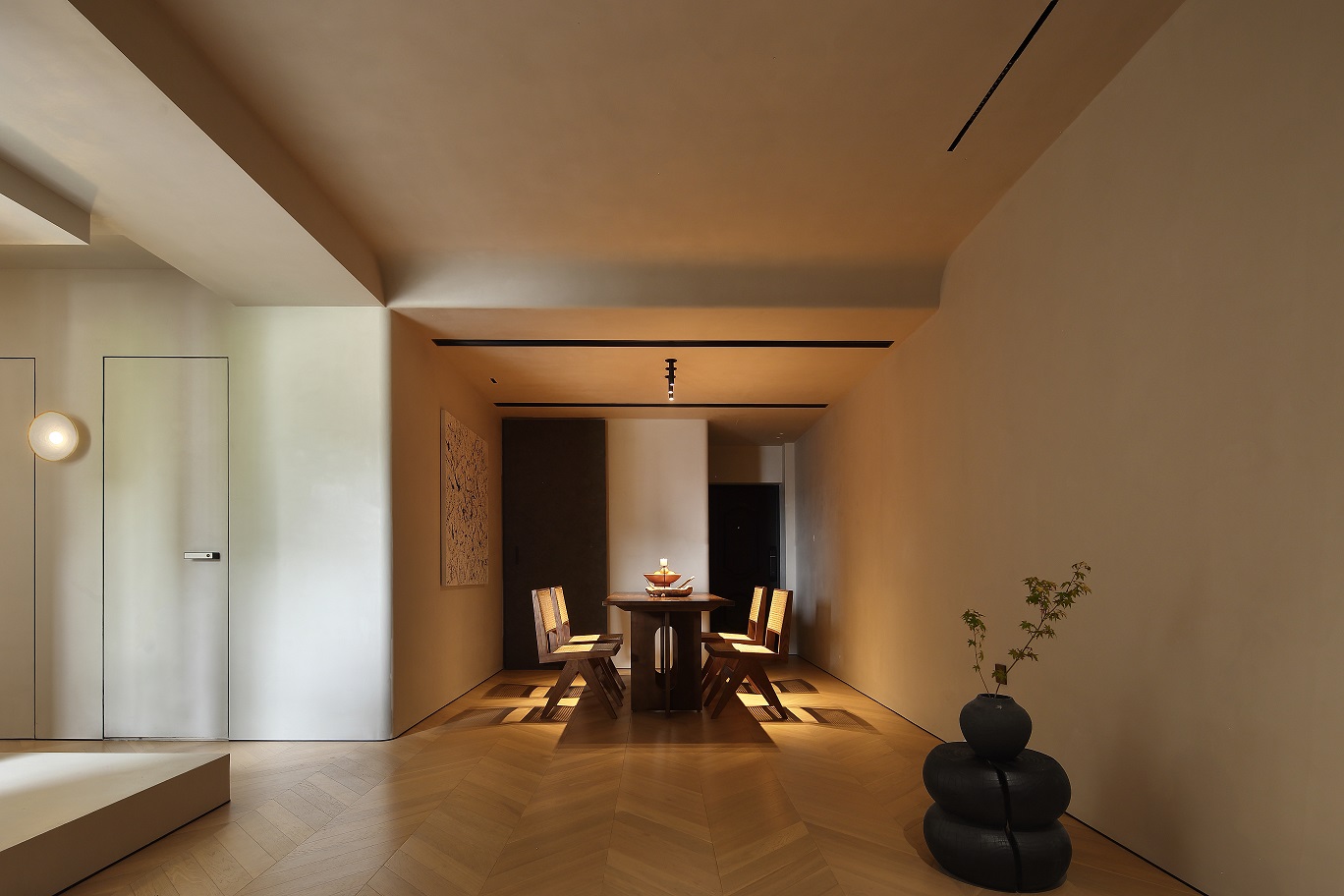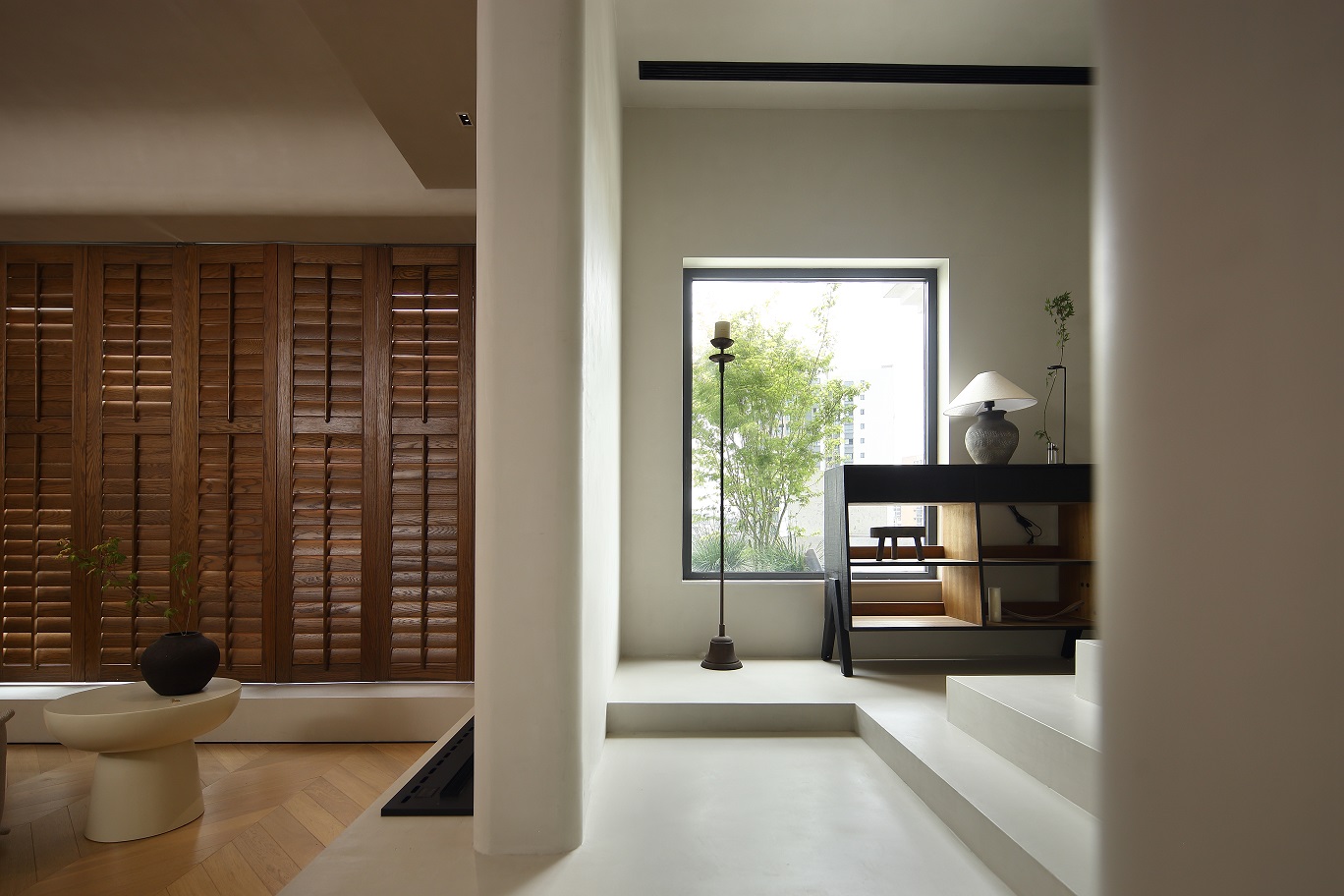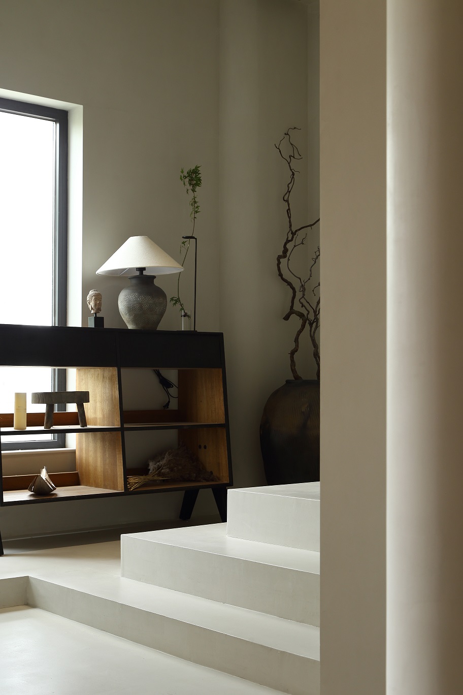 设计选材:除回归空间本质,亦衬托出空间器物,以及窗外打造的一花一木。器物虽不言,但仿佛又诉说着故事,微水泥搭配原木地板,细腻的材质肌理与光线相互交叠。