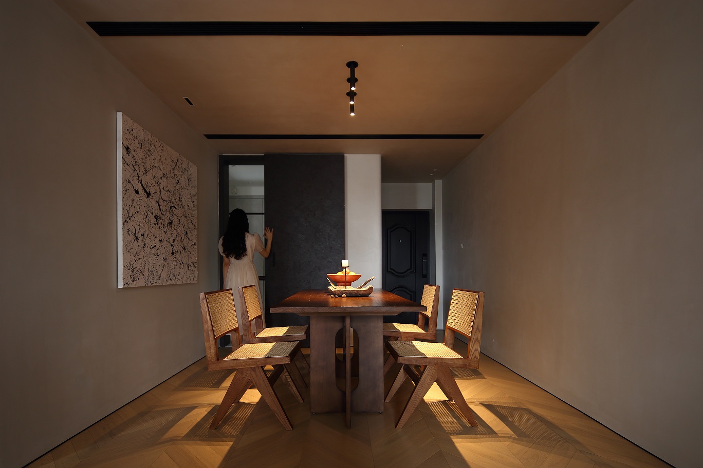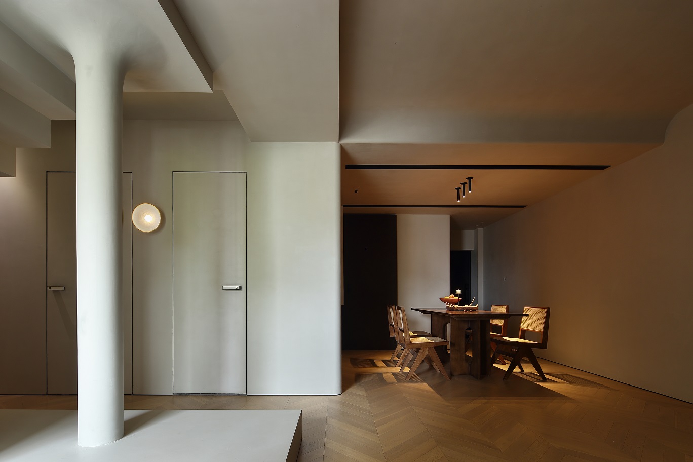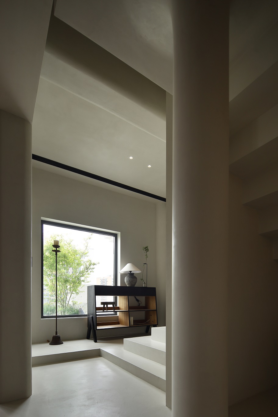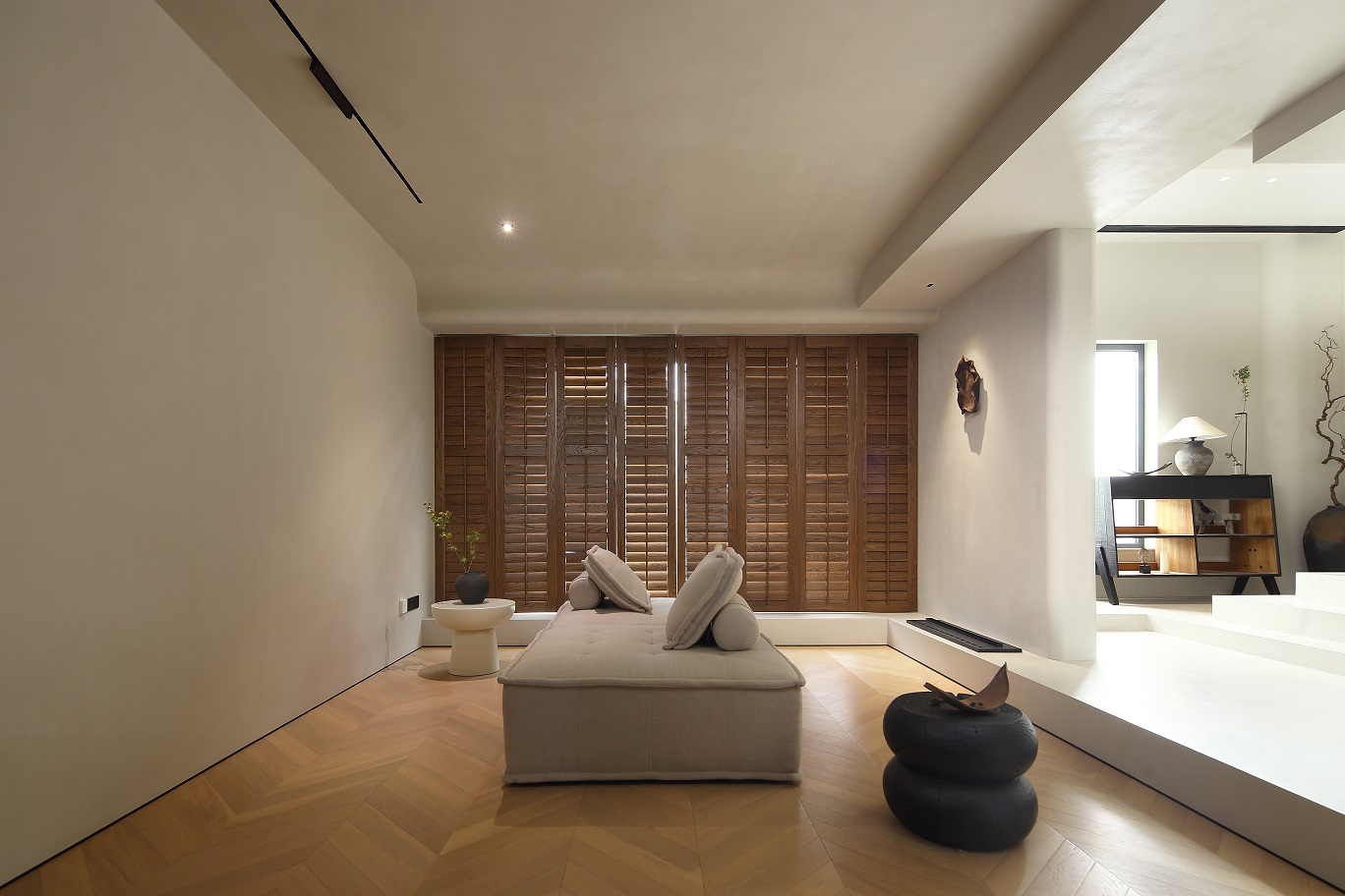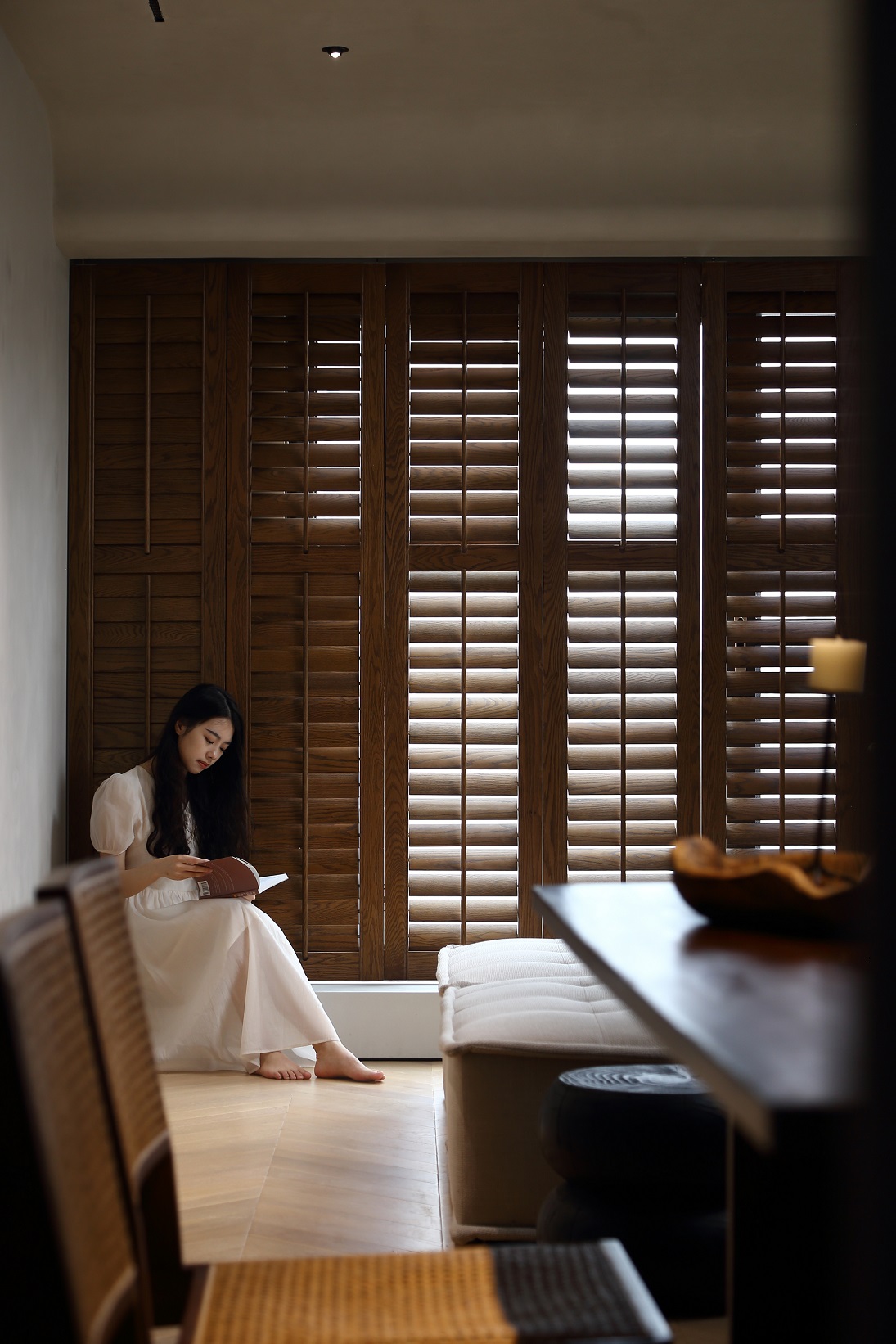设计选材:除回归空间本质,亦衬托出空间器物,以及窗外打造的一花一木。器物虽不言,但仿佛又诉说着故事,微水泥搭配原木地板,细腻的材质肌理与光线相互交叠。