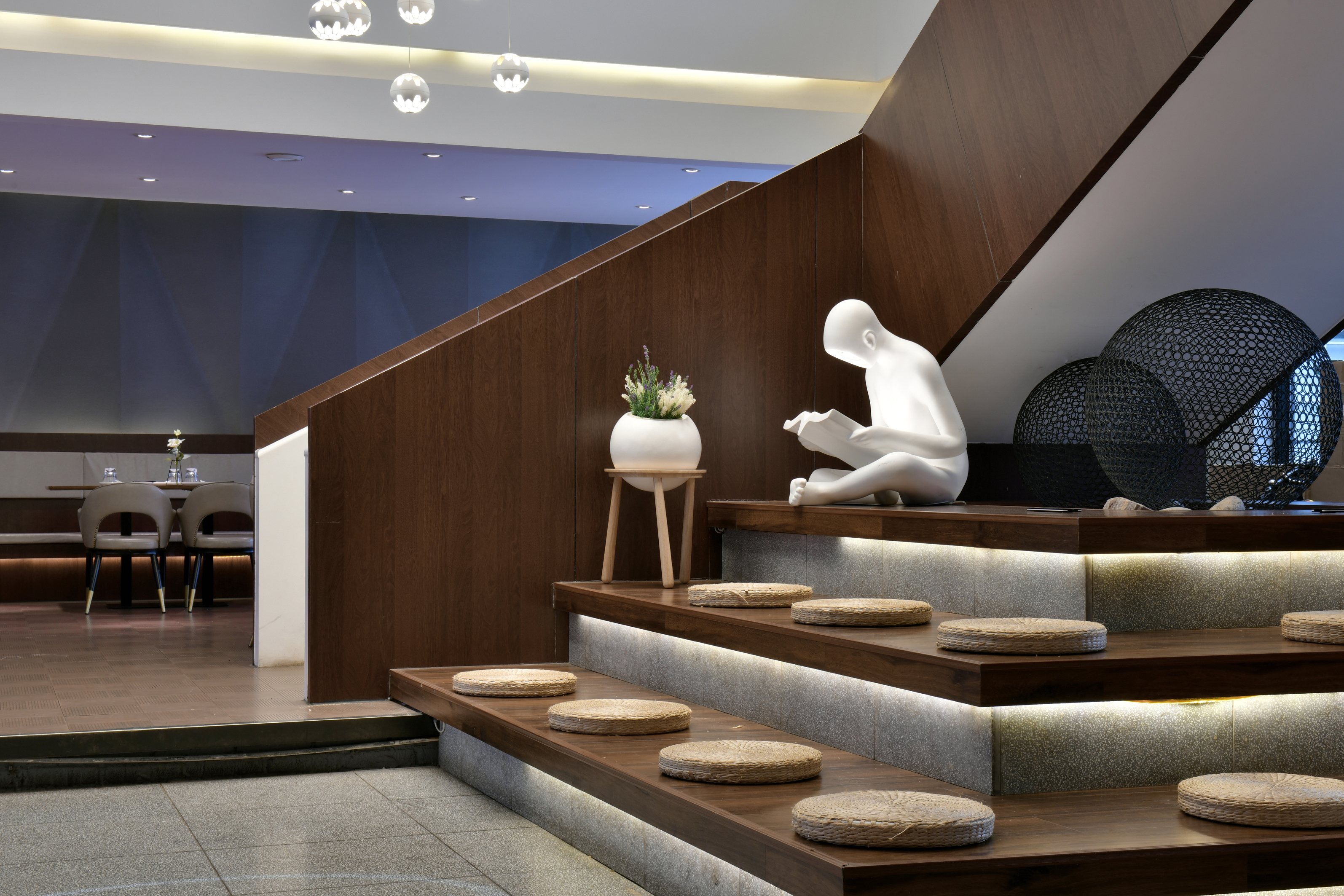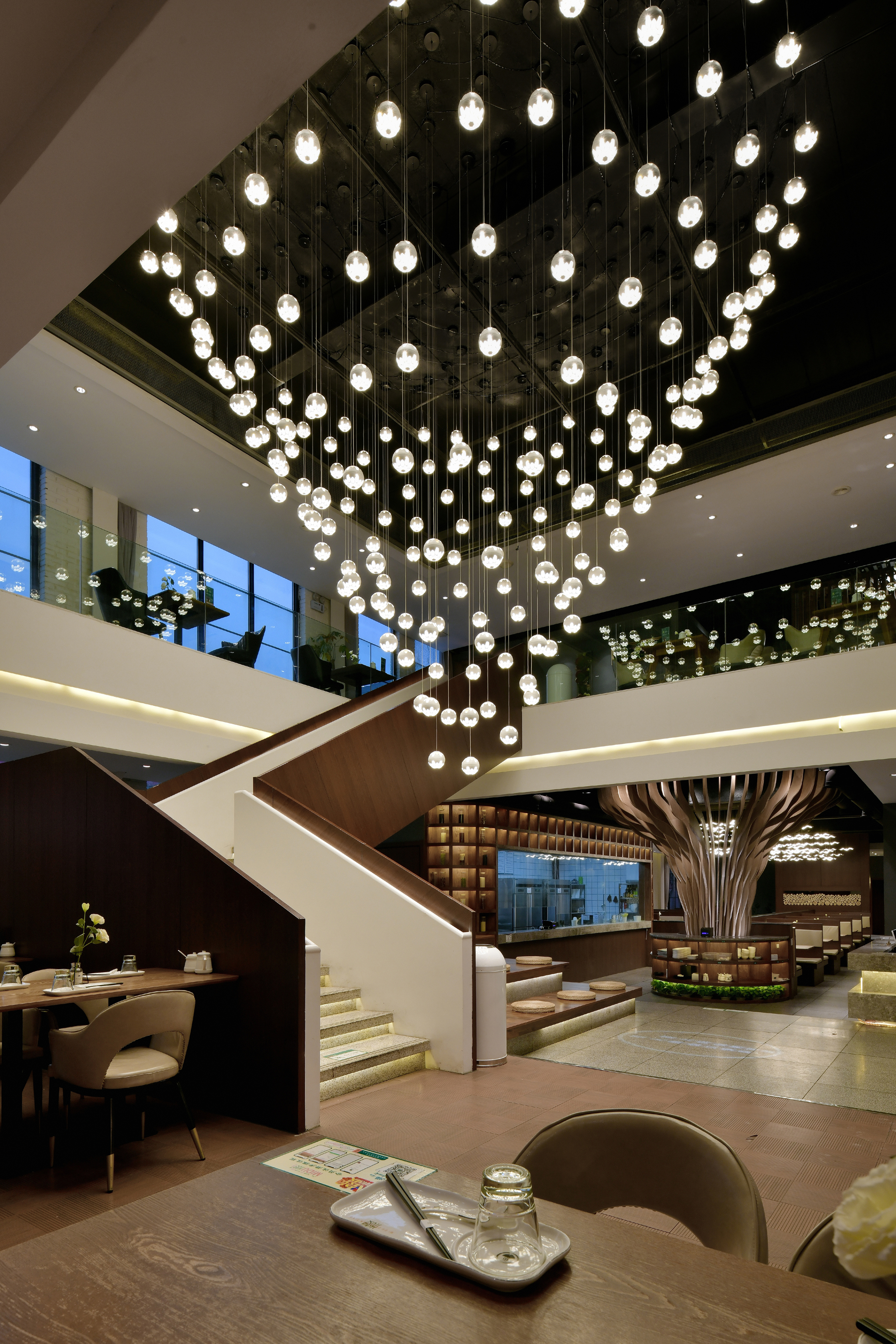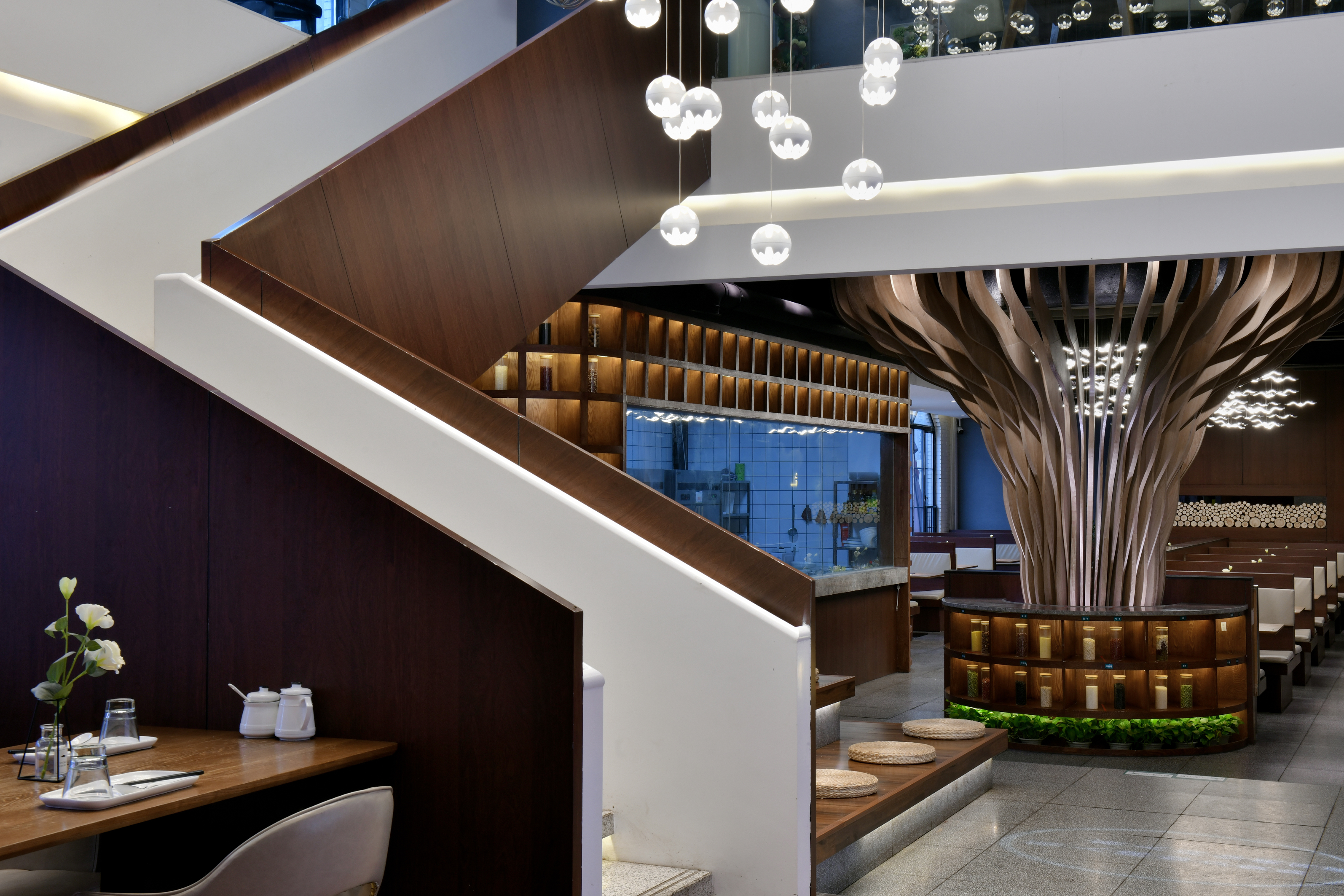 空间布局:挑空的中央大厅使二楼与一楼空间上有了很好的交互,楼梯的布置在空间中起到了很重要的作用,楼梯扶手采用体块大面的设计元素,在空间中更加突出,一楼圆形备餐台上方树状造型在空间中起到了画龙点睛的作用,使空间更加灵动。