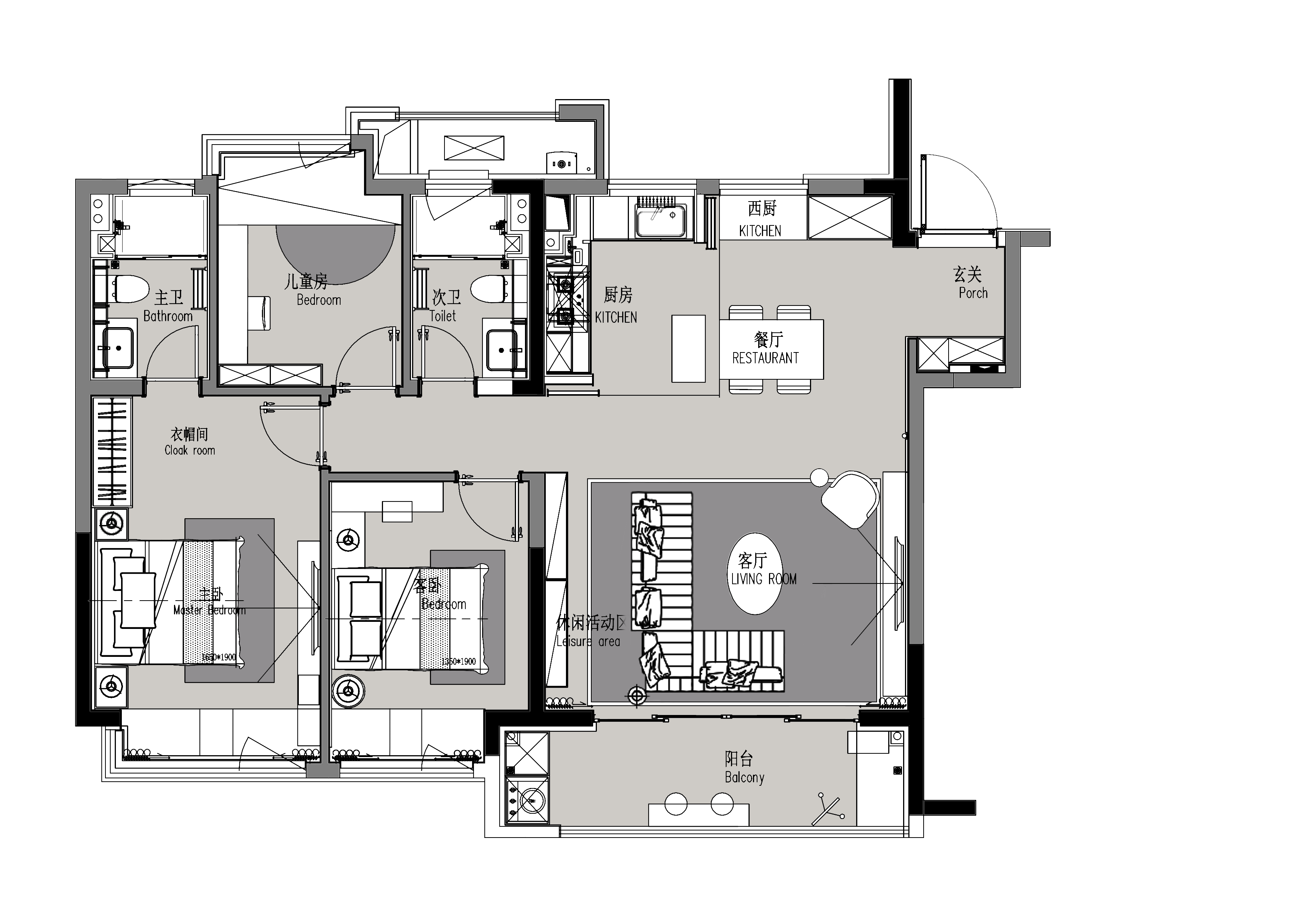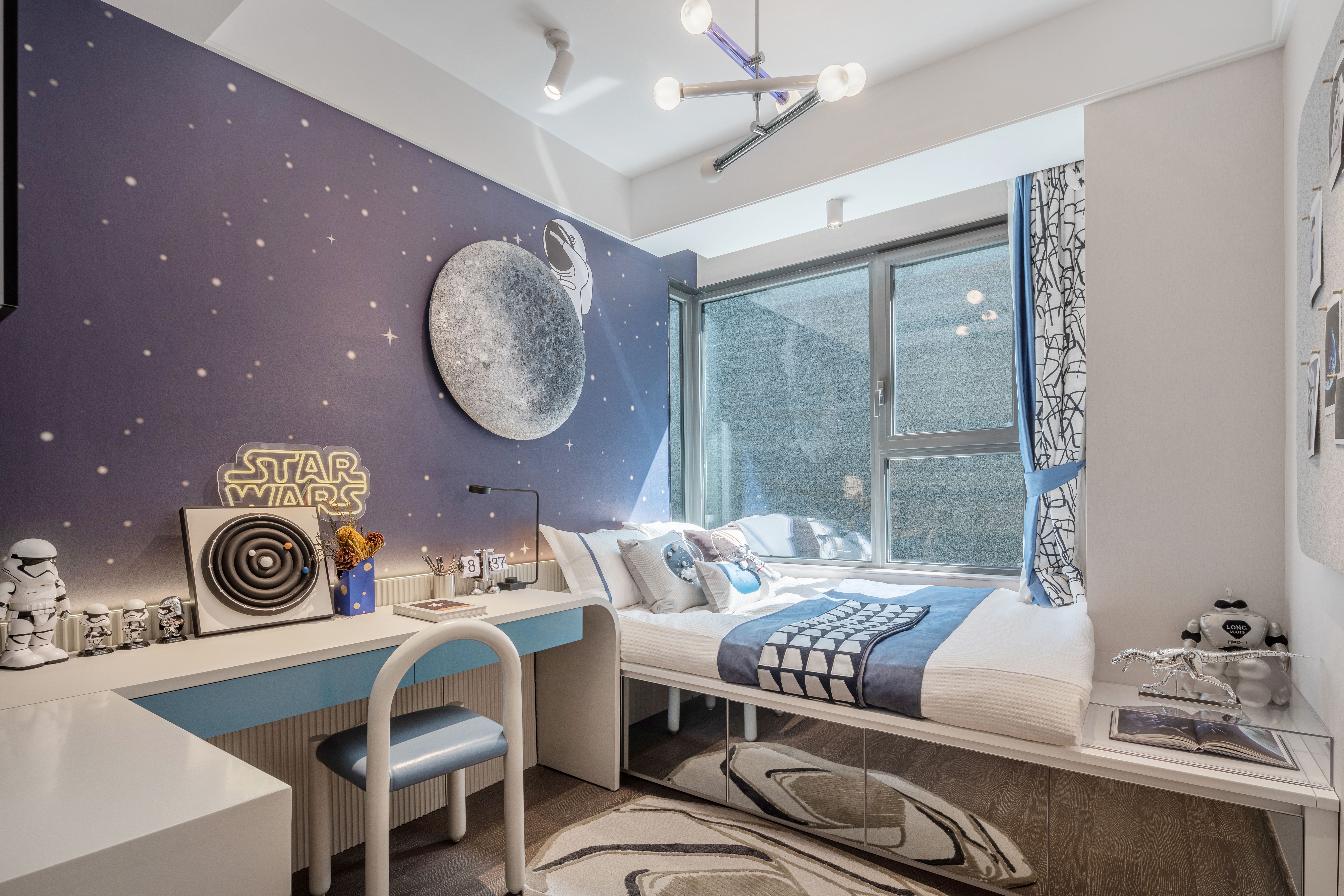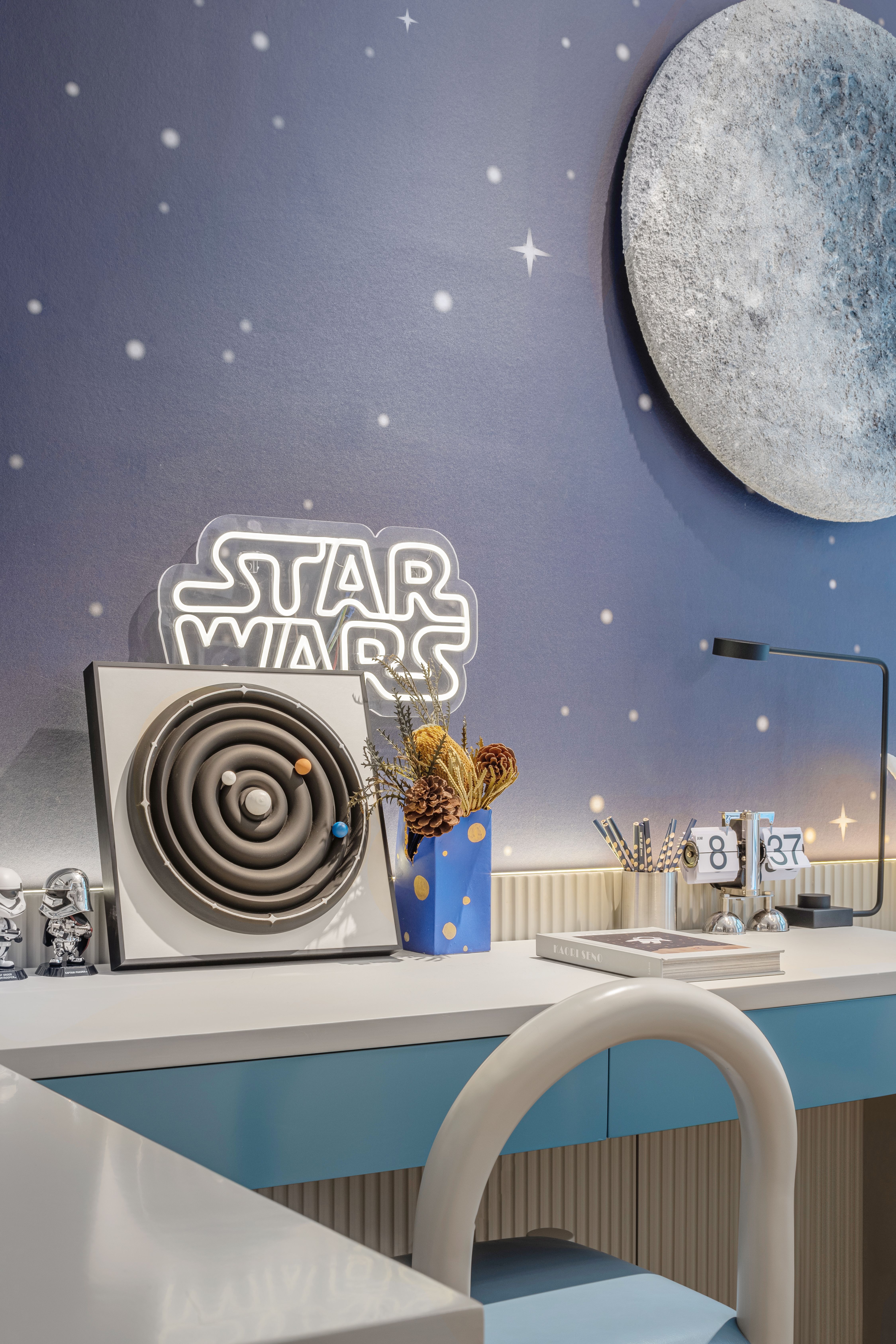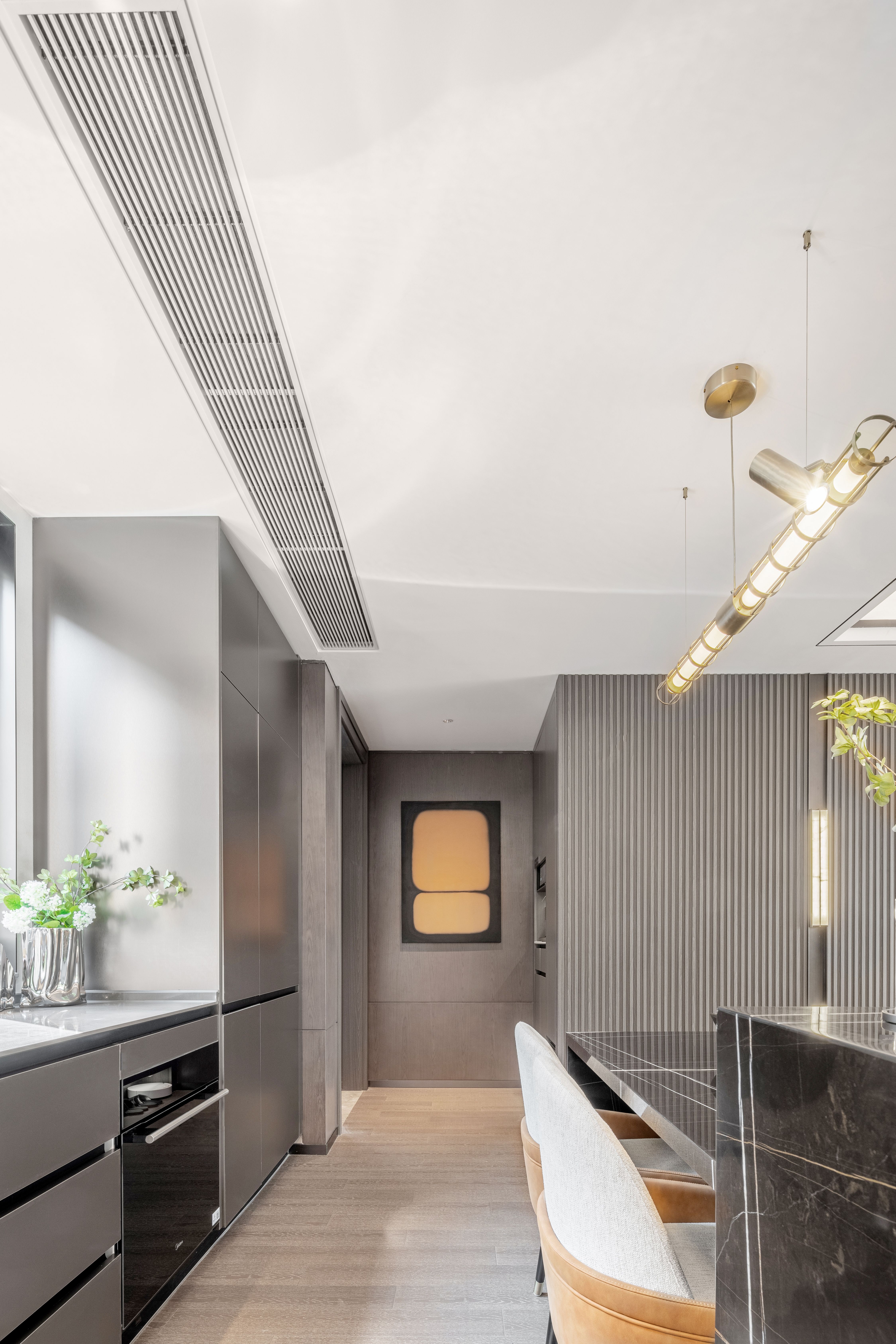 客餐厅强调空间线条感与生活功能性的思考,以连贯的手法和语言造型呈现,向内外延伸。开放式的格局,没有隔断的阻碍,让空间更为宽敞通透,营造舒展的氛围。西厨岛台与餐桌并联在一起,纹路连贯,略微错落的高度,不动声色地进行功能分区。开放的公共区域、功能界限的模糊,形成了更好的空间对话,自由的动线连接了这个家庭的成员行为模式,兼合了独立和交流。