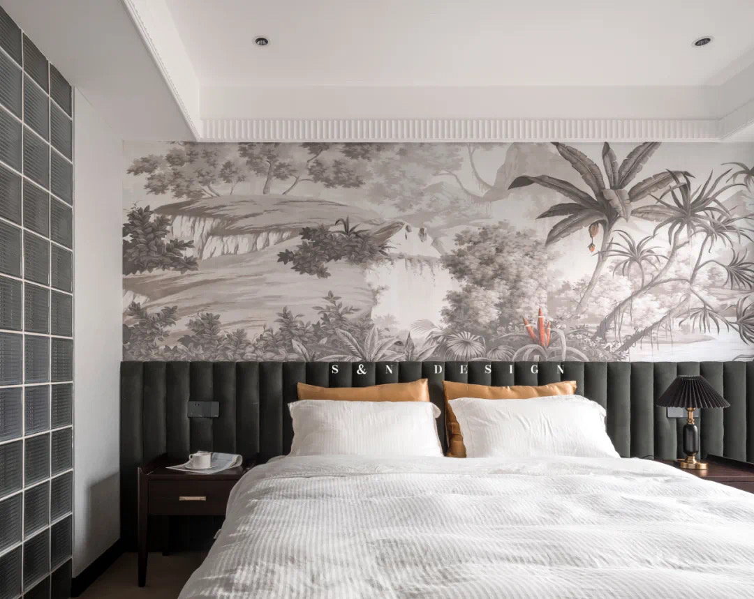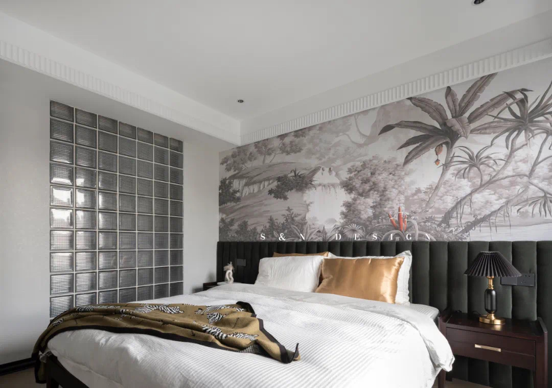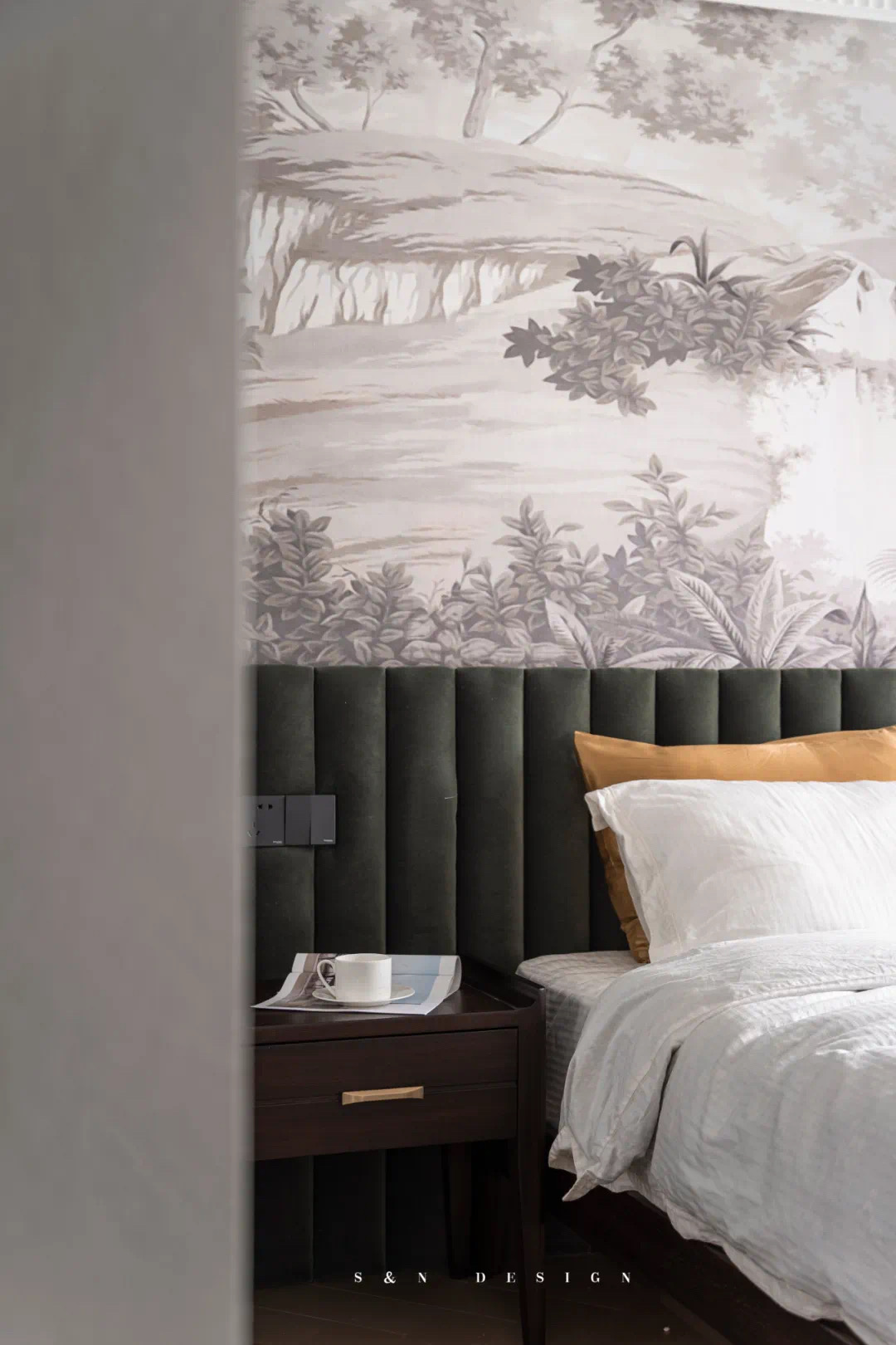 复古壁画加墨绿色丝绒软包背景打造别致个性主卧。